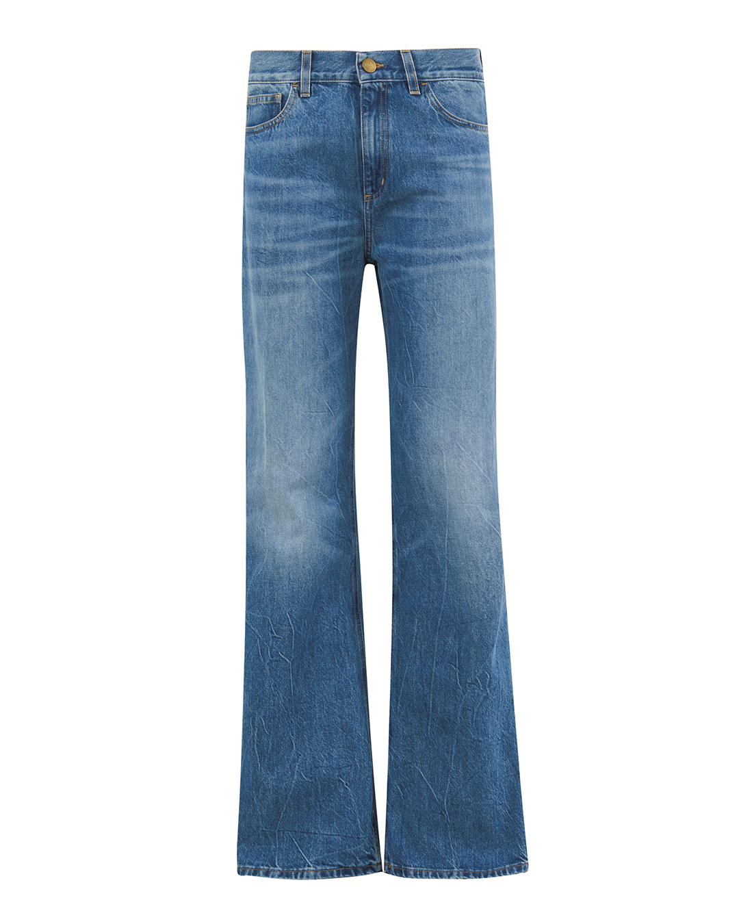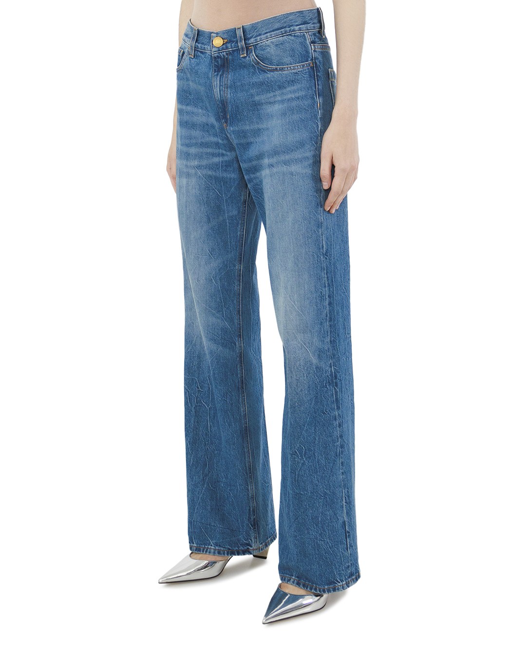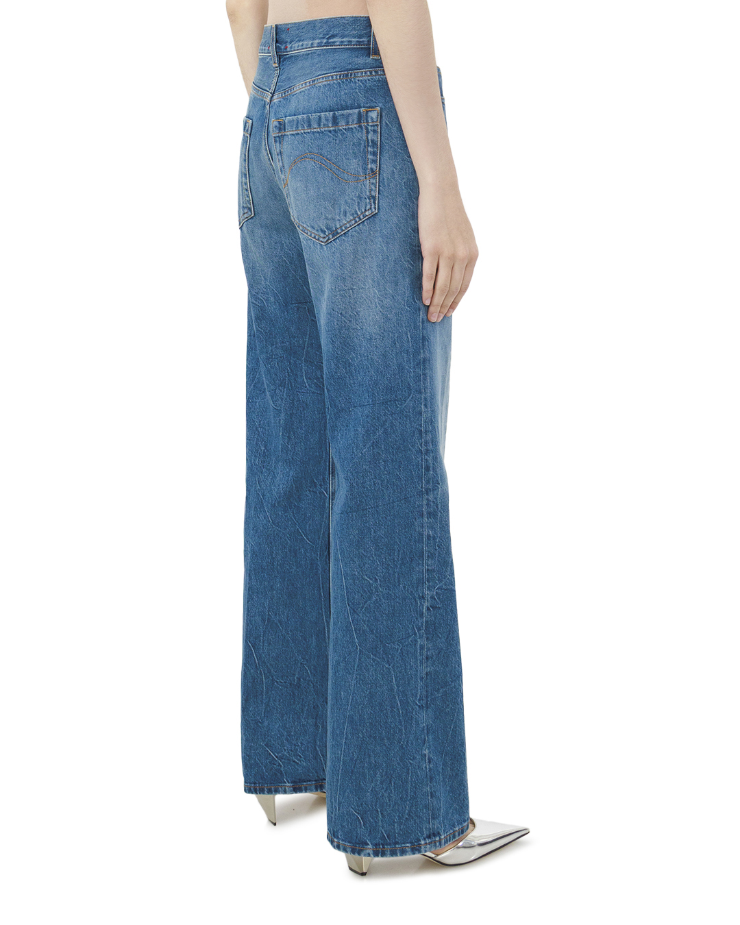 Эти джинсы в светлом индиго, выполненные в стилистике расклешенного силуэта, являются образцом современного винтажного шика. Их дизайн не только подчеркивает тренды, но и акцентирует внимание на деталях, создавая уникальный и запоминающийся образ. Крой — высокая талия, что визуально удлиняет ноги и создает изящный силуэт. Расклешенные штанины начинаются ниже колена, придавая элегантность и лёгкость. Это позволяет сочетать джинсы с разнообразной обувью, от брутальных ботинок до изящных туфель на каблуках. Пояс декорирован шлевками для ремня и застежкой на металлическую пуговицу, выполненной с филигранной детализацией. Это не только функционально, но и добавляет изысканность. Карманная отделка включает фронтальные накладные карманы с мягкими контурами, а задние карманы оформлены с контрастной строчкой, создающей визуальный акцент. Металлические детали на задних карманах добавляют интересный элемент и привлекают внимание. Отделка выполнена с акцентом на текстуру: лёгкое «потертости» в области штанин создают эффект изношенности, что очень актуально в современном модном мире. Двойные швы обеспечивают прочность и долговечность, а цвёточная текстура ткани придаёт джинсам мягкость и комфорт. Эти джинсы прекрасно подходят как для создания расслабленных повседневных образов, так и для стильных вечерних выходов, дополняя любой наряд элегантностью и уникальностью.