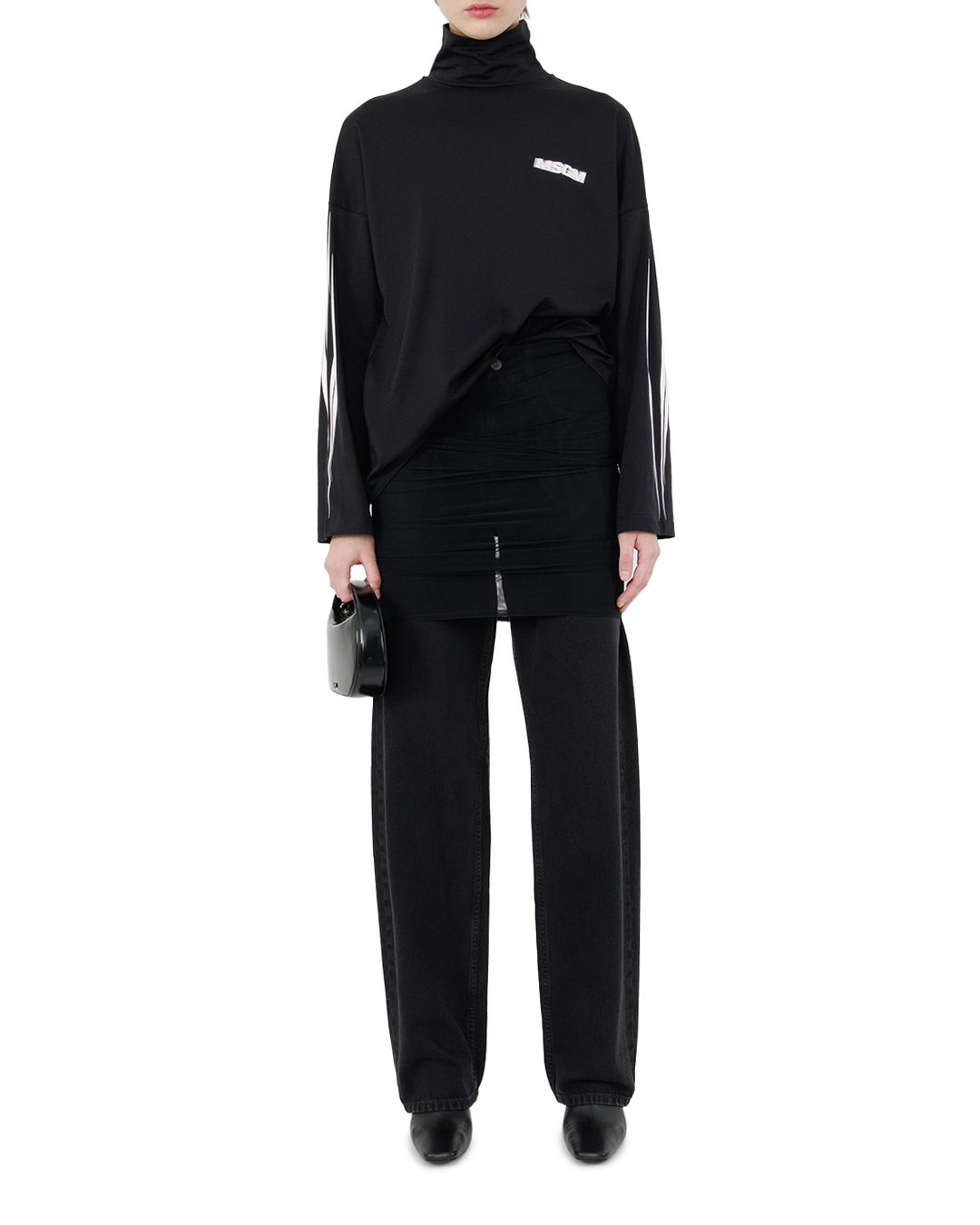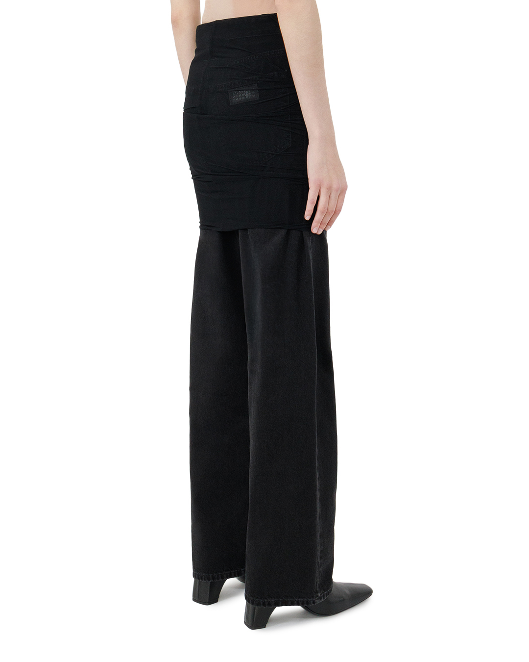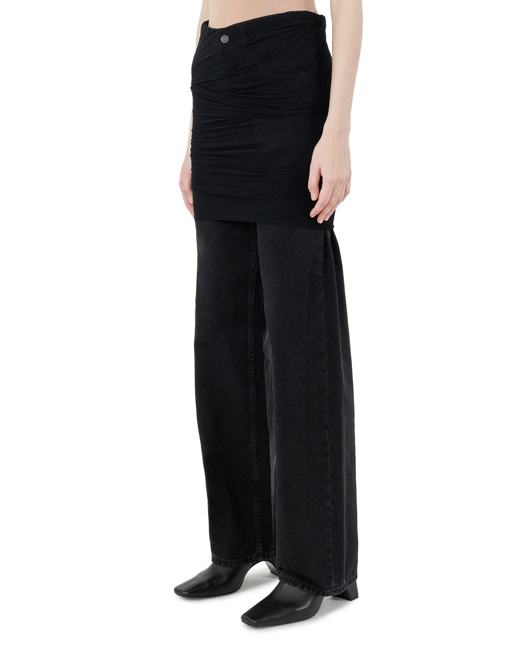 Эти джинсы — смелый и эклектичный элемент гардероба, соединяющий в себе авангардный стиль с функциональной эстетикой. Их основа выполнена в оттенке глубокого антрацита, придающего изделию выразительность и универсальность. Крой джинсов представляет собой оригинальное сочетание двух элементов: широких брюк и наложенной поверх юбки. Такой дизайнерский прием создаёт интересную многослойность и визуальную глубину, делая эти джинсы центральным элементом любого образа. Юбка, прикрепленная к верхней части джинсов, выполнена из эластичного материала, обеспечивая цельность облика. Она украшена элегантными драпировками, которые добавляют текстурности и утончённости. Застёжка на пуговицу изысканно интегрирована в дизайн, обеспечивая комфорт и практичность. Брюки имеют расслабленный силуэт, свободно ниспадающий вдоль ног, что создает эффект легкости и движения. Их удлиненный фасон подчёркивает современный подход к классическому дизайну. Эти джинсы идеально подойдут для смелых модниц, предпочитающих нетривиальные решения и изысканные детали, которые подчёркивают индивидуальность и творческий подход к стилю.
