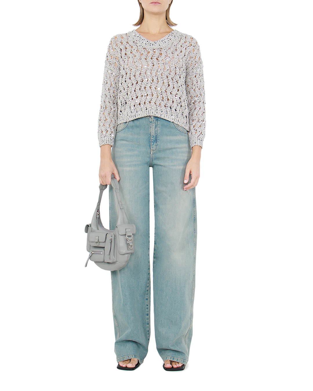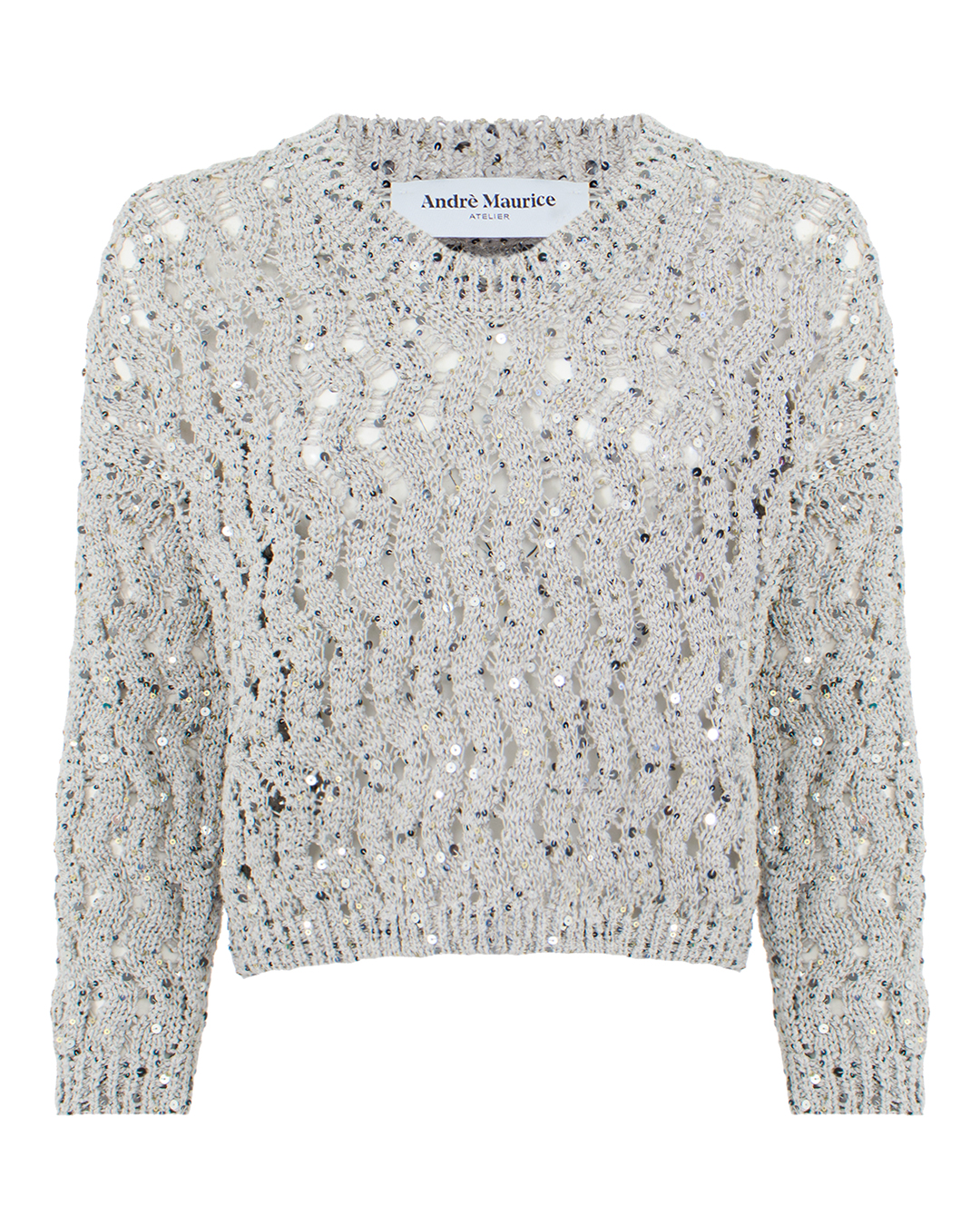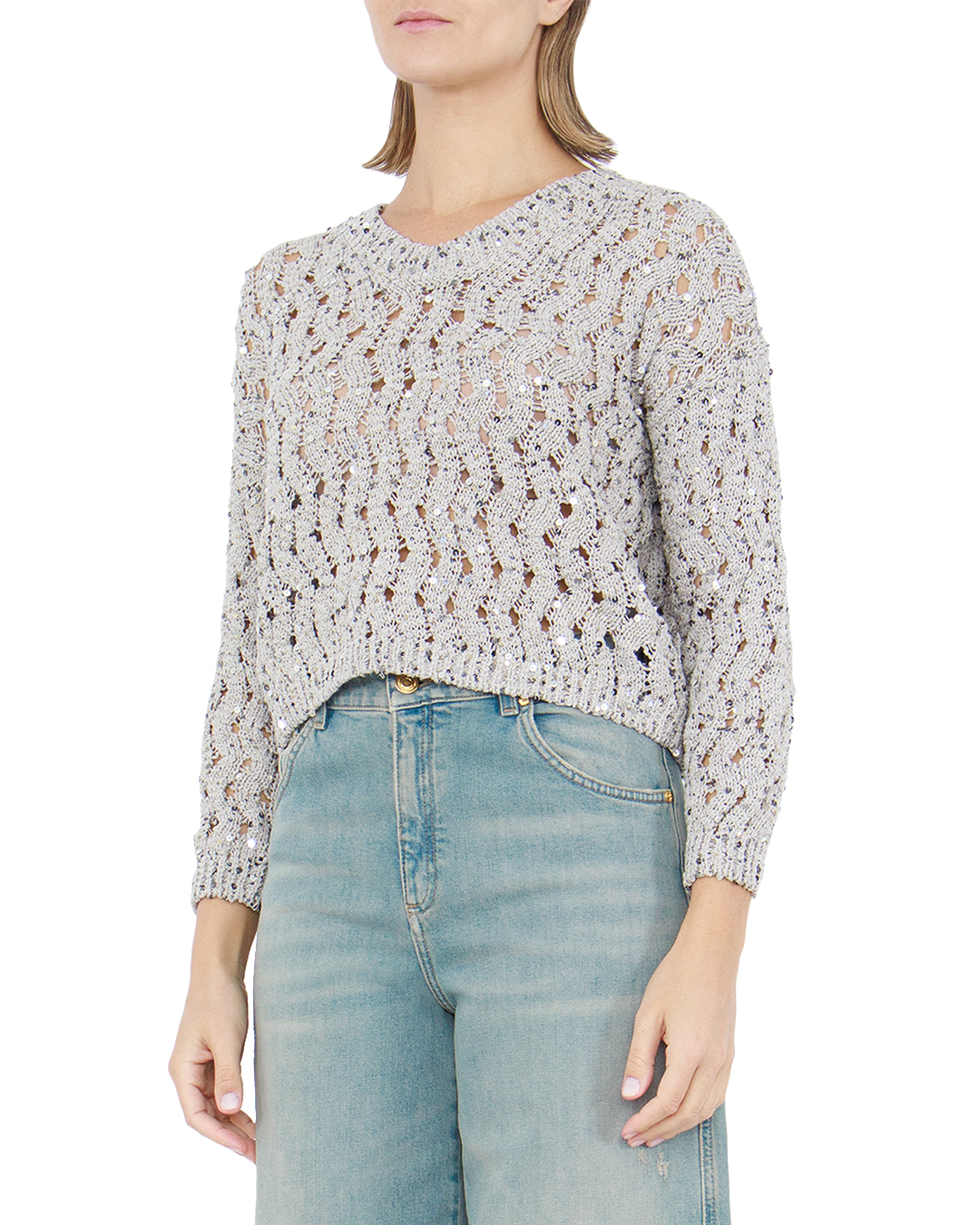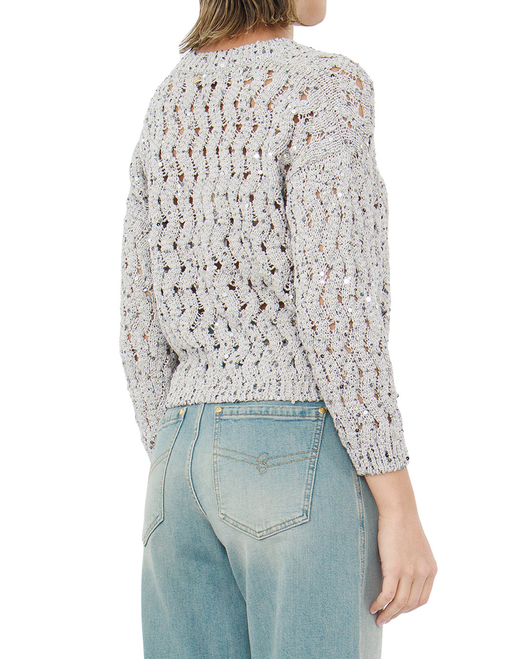 Этот утончённый джемпер представлен в изысканном стиле, который идеально сочетается с актуальными модными тенденциями. Изготовленный из высококачественной пряжи, он отличается прилегающим кроем и ажурным узором, обеспечивающим лёгкость и текстурированность. Изюминка дизайна — это вкрапления блестящих пайеток, которые придают модели гламурный акцент и создают эффект мерцающего свечения, превращая каждое движение в игру света. Это делает джемпер подходящим как для торжественных случаев, так и для повседневного шика. Круглый вырез горловины выполнен с использованием эластичной резинки, что гарантирует комфортную посадку и сохранение формы со временем. Рукава и нижняя кромка оформлены в рубчик, усиливающий структуру и поддерживающий общий силуэт. Этот джемпер станет неотъемлемой частью гардероба для тех, кто ценит стиль и элегантность с оттенком праздничности.