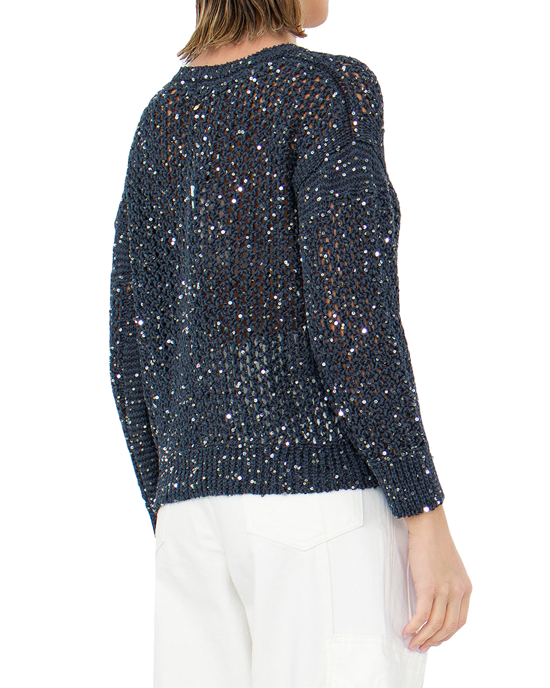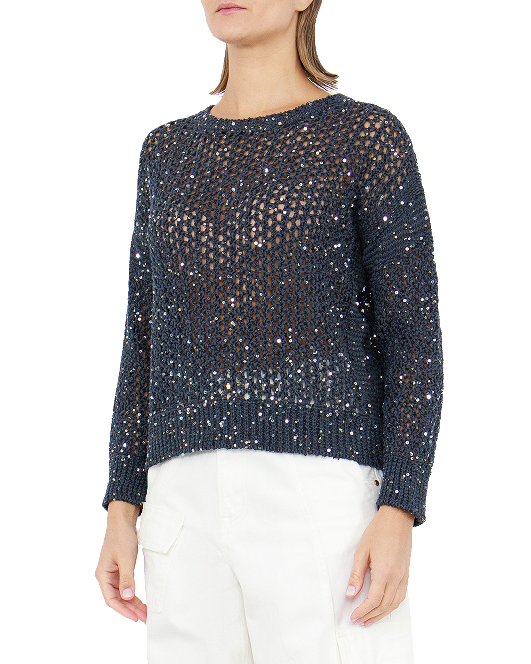 Этот утончённый джемпер представлен в изысканном стиле, который идеально сочетается с актуальными модными тенденциями. Изготовленный из высококачественной пряжи, он отличается прилегающим кроем и ажурным узором, обеспечивающим лёгкость и текстурированность. Изюминка дизайна — это вкрапления блестящих пайеток, которые придают модели гламурный акцент и создают эффект мерцающего свечения, превращая каждое движение в игру света. Это делает джемпер подходящим как для торжественных случаев, так и для повседневного шика. Круглый вырез горловины выполнен с использованием эластичной резинки, что гарантирует комфортную посадку и сохранение формы со временем. Рукава и нижняя кромка оформлены в рубчик, усиливающий структуру и поддерживающий общий силуэт. Этот джемпер станет неотъемлемой частью гардероба для тех, кто ценит стиль и элегантность с оттенком праздничности.