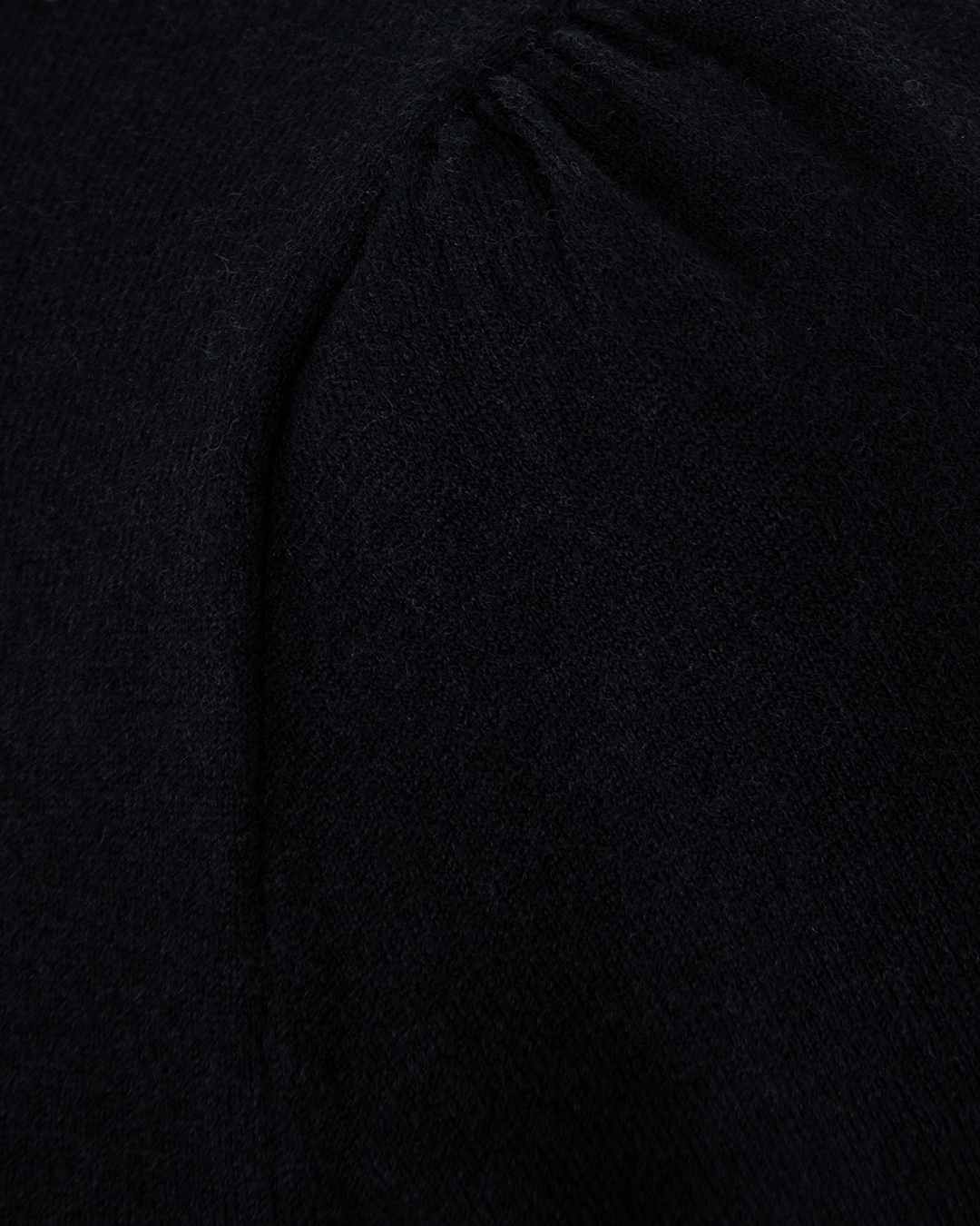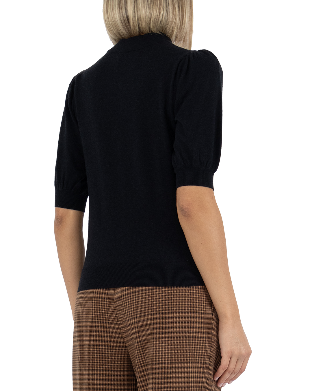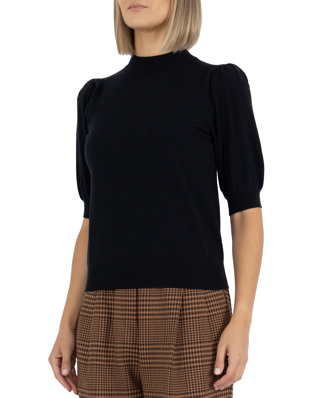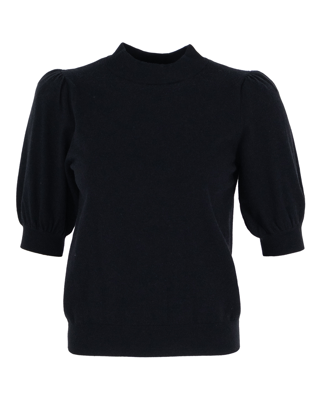 Укороченный свитер с широким поясом, манжетами и воротником стойкой. Короткие рукава фонарики, придают элегантность и в то же время легкость этой модели.