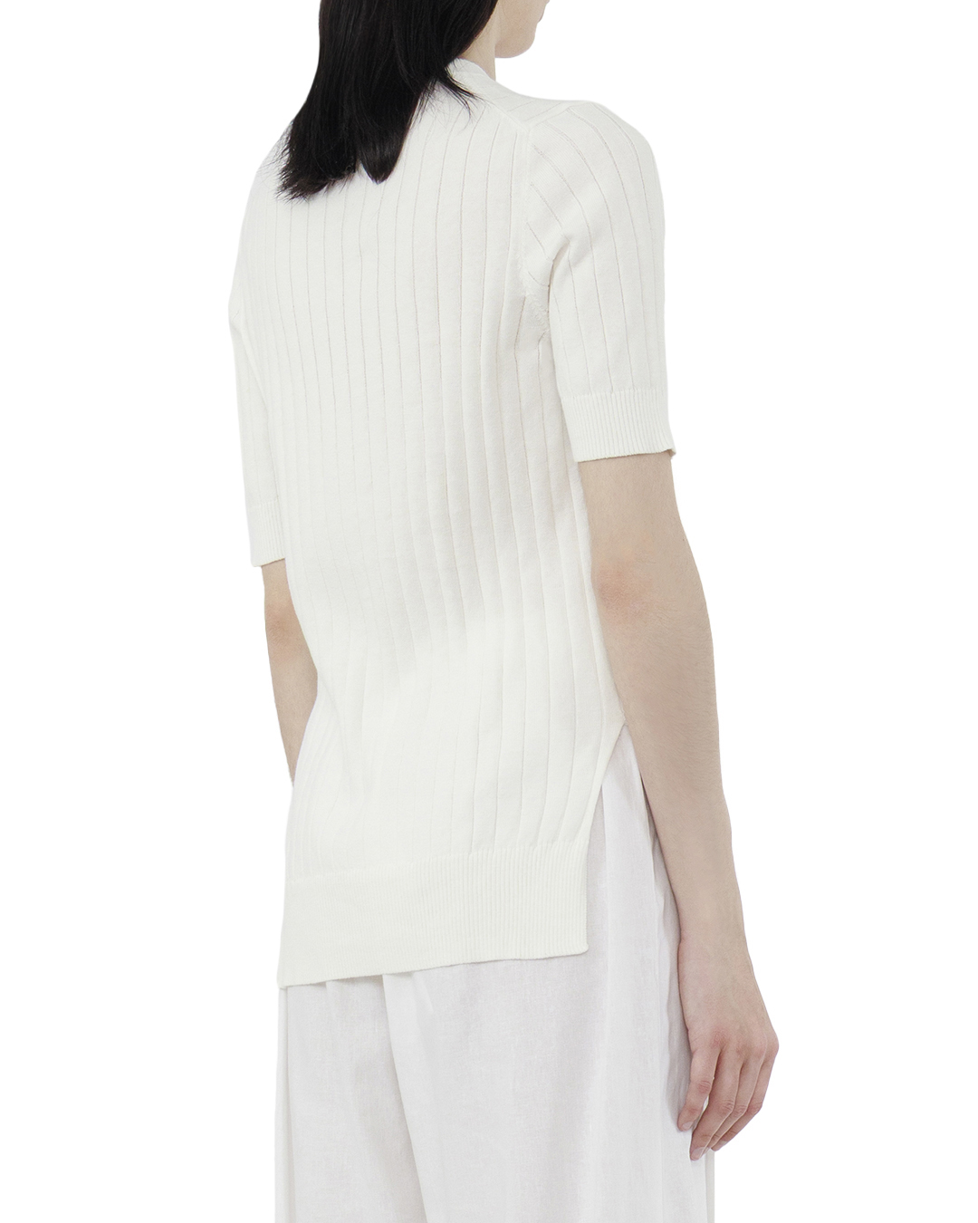 Этот изысканный джемпер представляет собой образец лаконичной элегантности и тонкого вкуса. Выполненный из мягкой в структуре ткани, он обеспечивает невероятный комфорт и уют, делая его идеальным выбором для любого сезона. Рельефная вертикальная вязка создает визуальную стройность и динамичность, добавляя изделию текстурный акцент и утонченную элегантность. Этот узор не только стильный, но и функциональный, добавляющий глубину и интерес к простому образу. Круглый воротник джемпера отлично подчеркивает линию шеи, создавая изящный и завершенный силуэт. Короткие рукава нежно облегают руки, добавляя изделию современную нотку и легкость. Завершают дизайн аккуратные манжеты и нижняя кромка с трикотажной резинкой, которые обеспечивают прилегание и подчеркивают изысканную конструкцию изделия. Этот белоснежный джемпер легко сочетать с различными элементами гардероба, придавая образы непринужденной легкости и утонченности.