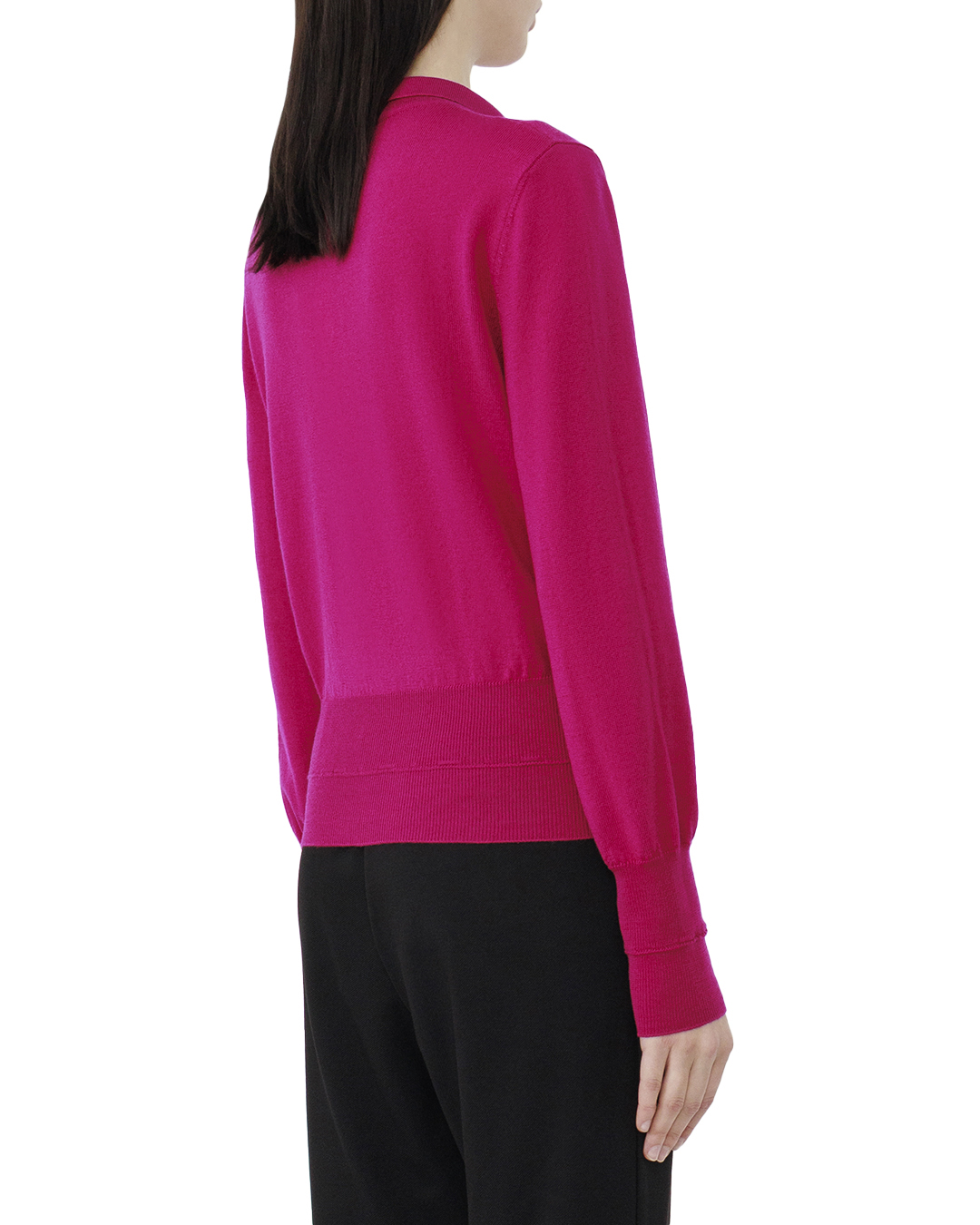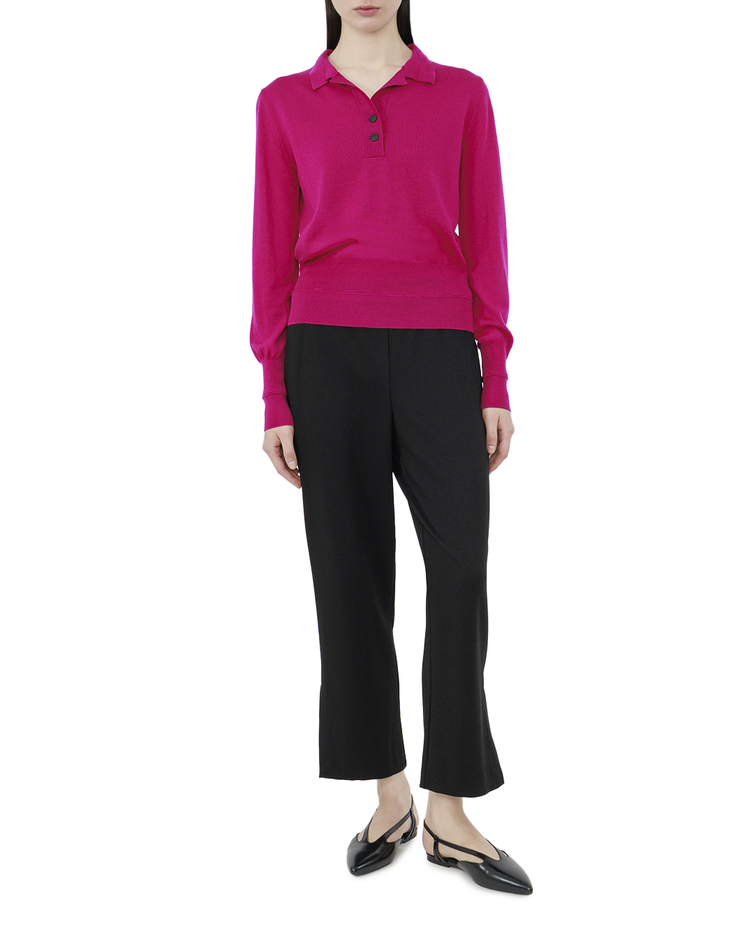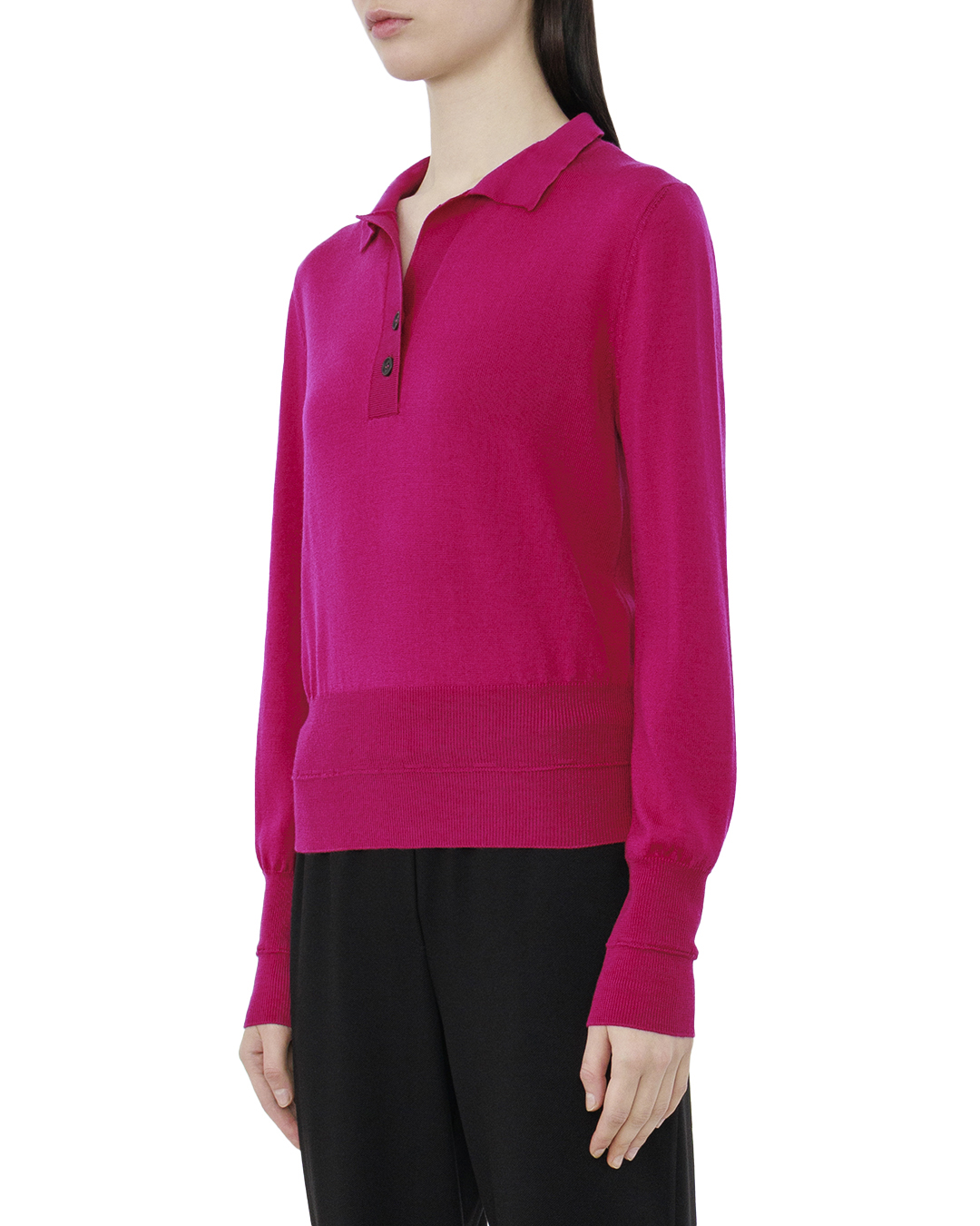 Этот джемпер привлекает внимание своим ярким розовым цветом, который добавляет энергичности и выразительности любому образу. Выполненный из мягкой пряжи, он обеспечивает максимальный комфорт и приятные тактильные ощущения. Классический воротник-поло с продуманной планкой и аккуратными пуговицами добавляет элегантности, создавая баланс между повседневным и изысканным стилем. Детали отделки подчёркивают индивидуальность изделия: тонкие манжеты и широкий низ обеспечивают идеальную посадку и аккуратный силуэт. Рукава джемпера выполнены с лёгким уплотнением, что придаёт дополнительную текстурную глубину и акцентирует внимание на линии плеч. Все швы обработаны так, чтобы избежать излишней толщины и гарантировать безупречный внешний вид. Этот джемпер легко сочетать с различными элементами гардероба — от классических брюк до джинсов, создавая как утончённые, так и непринуждённые образы, идеально подходящие для самых разных случаев.