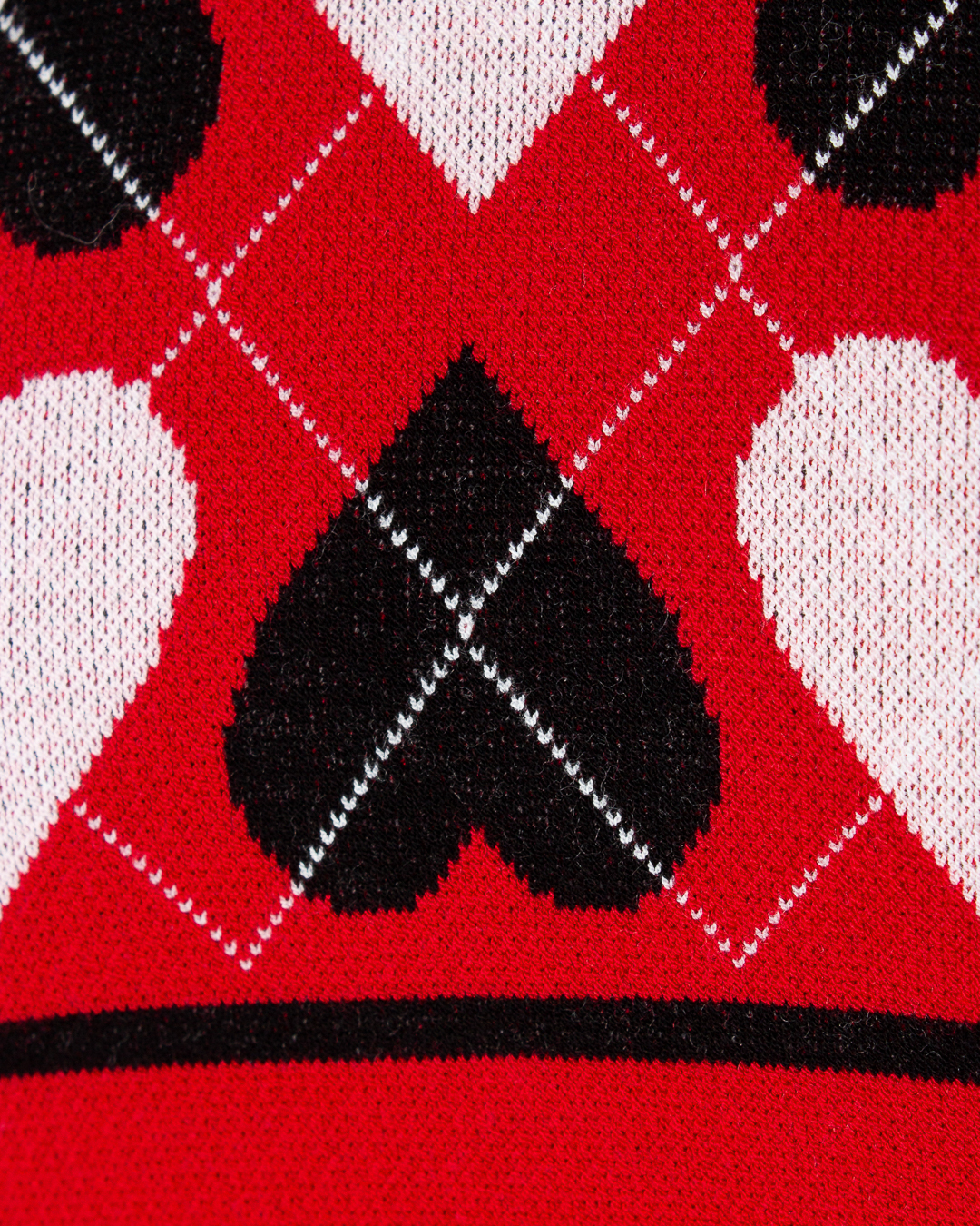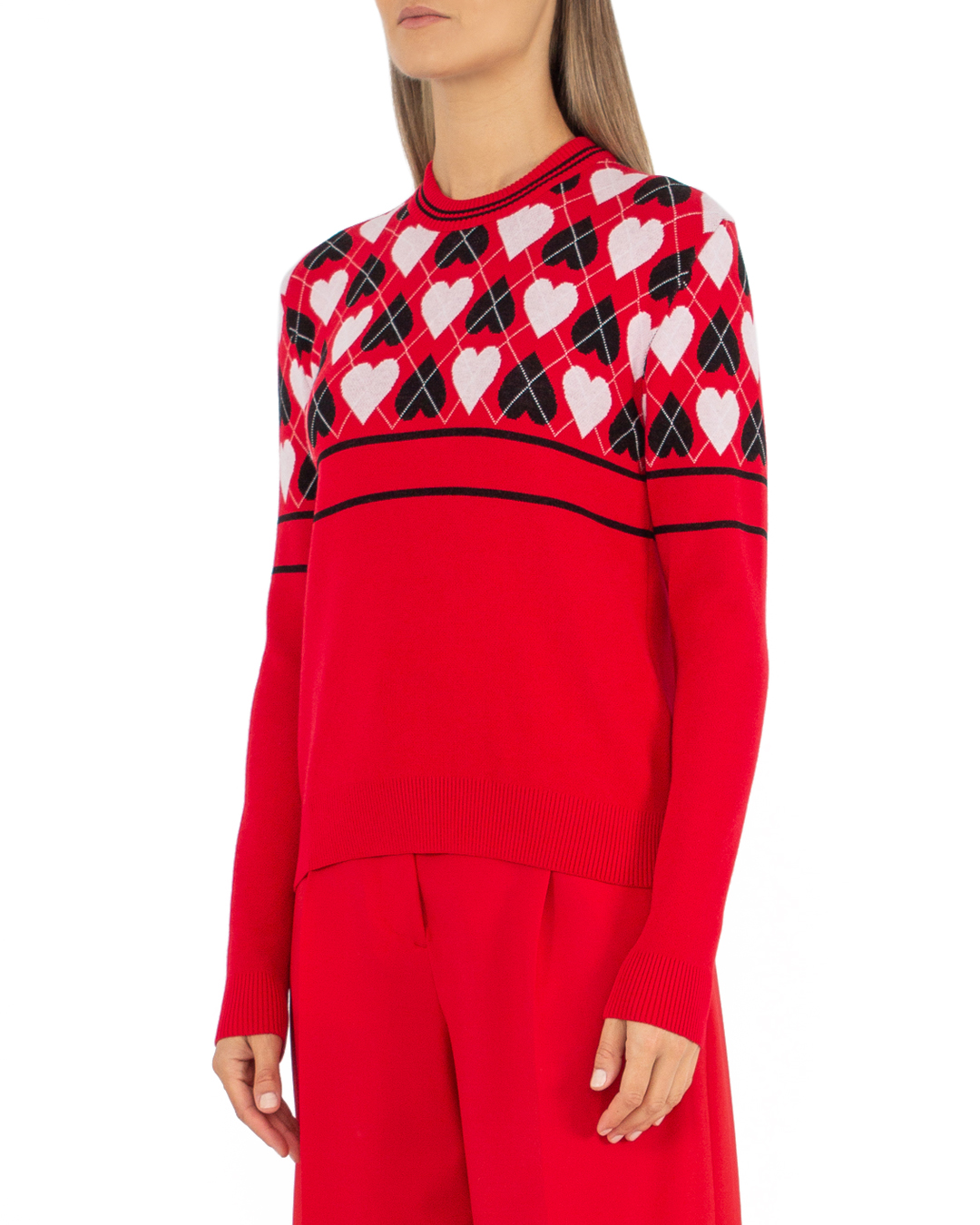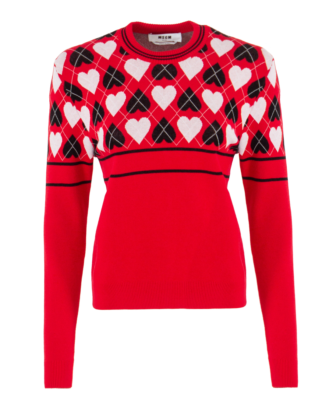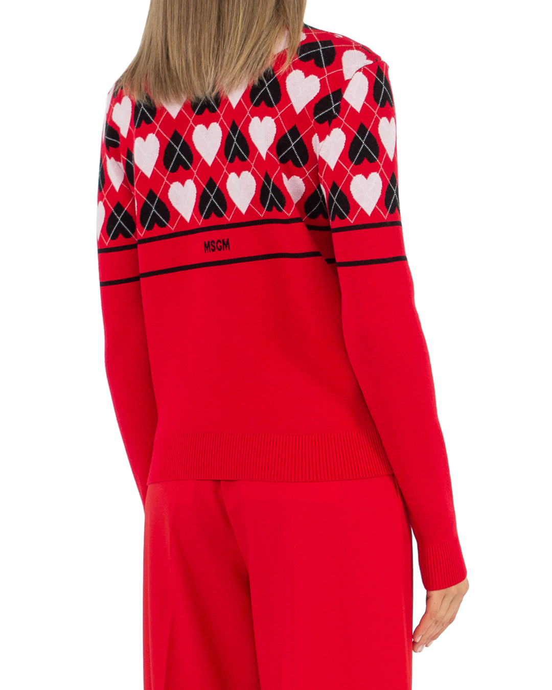 Джемпер MSGM из поливискозы красного цвета с сердцами. Эластичное изделие полуприлегающего силуэта с круглой линией выреза.