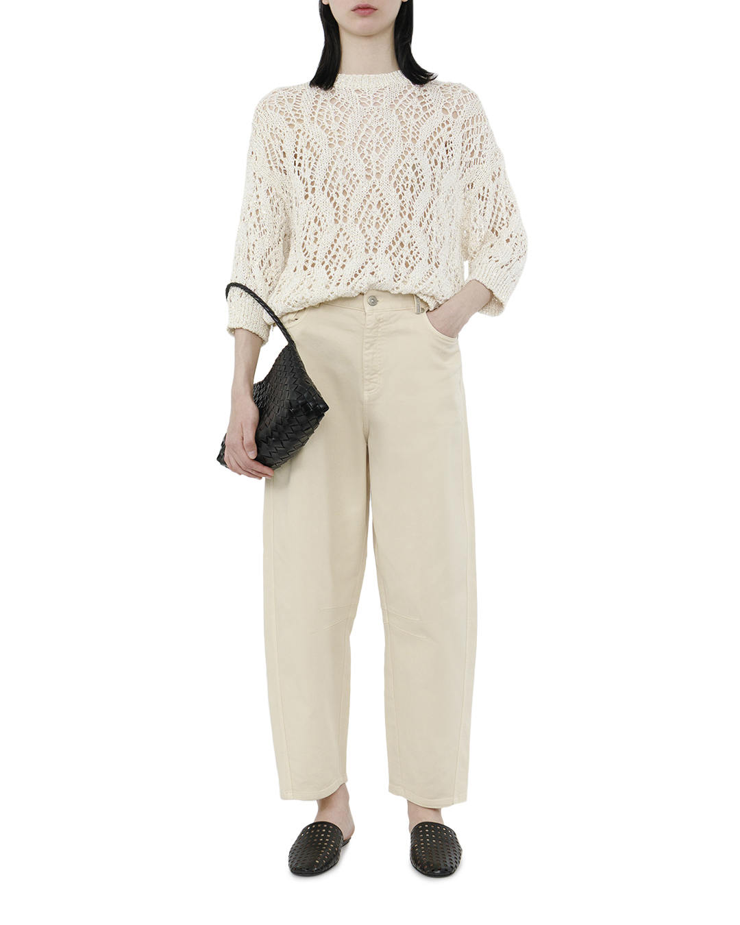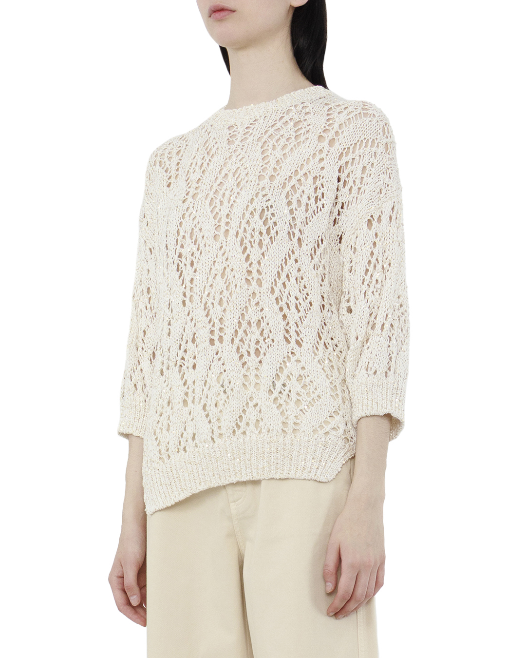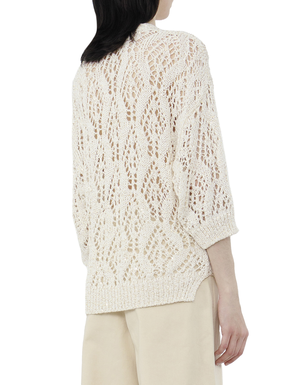 Элегантный джемпер представлен в воздушном стиле с изысканным ажурным плетением, которое добавляет утонченную текстуру и лёгкость образу. Нежный кремовый оттенок подчеркивает чувственность и женственность изделия, создавая универсальную базу для множества ансамблей. Круглый вырез горловины акцентирует внимание на изящной линии шеи, а аккуратно выполненные манжеты и нижний край добавляют завершенности и структурности силуэту. Прямой крой джемпера обеспечивает комфорт и свободу движений, а рукава 3/4 создают легкий эффект непринужденности. Изготавливаясь из мягкой и дышащей пряди, джемпер обещает уют и комфорт в повседневной носке. Плетеные узоры создают органичные прорези, через которые мягкий свет добавляет дополнительную глубину и игру фактуре, усиливая визуальный эффект легкости и нежности. Этот джемпер станет идеальным завершением как для повседневного, так и для утонченного вечернего наряда, добавляя элемент элегантности и стиля.