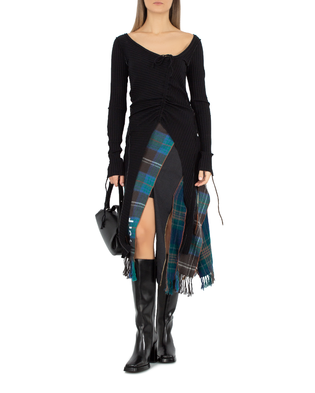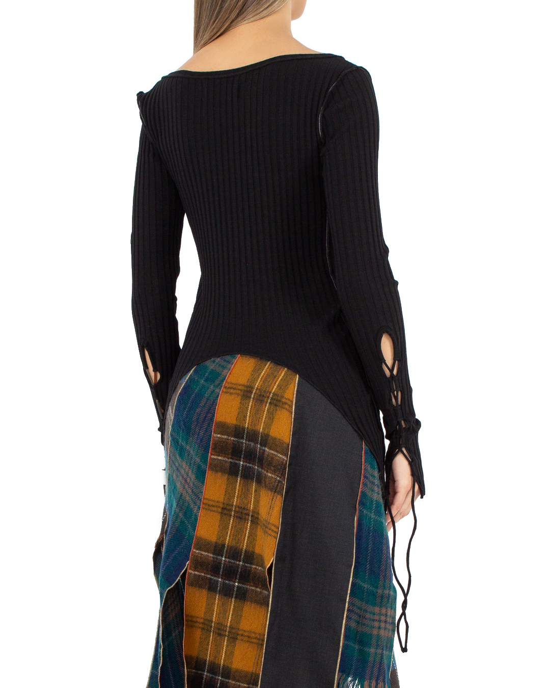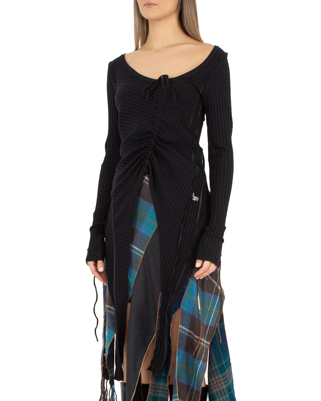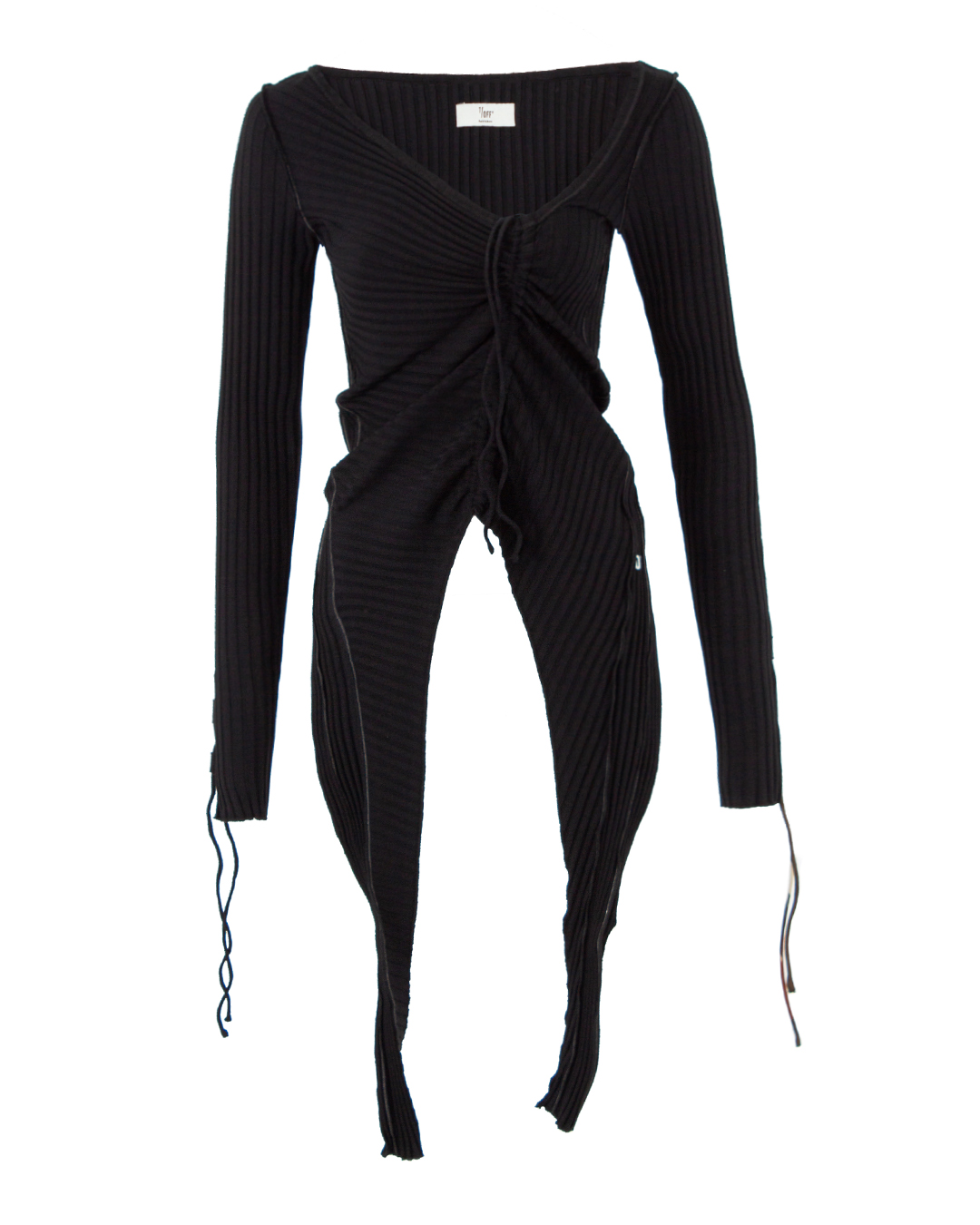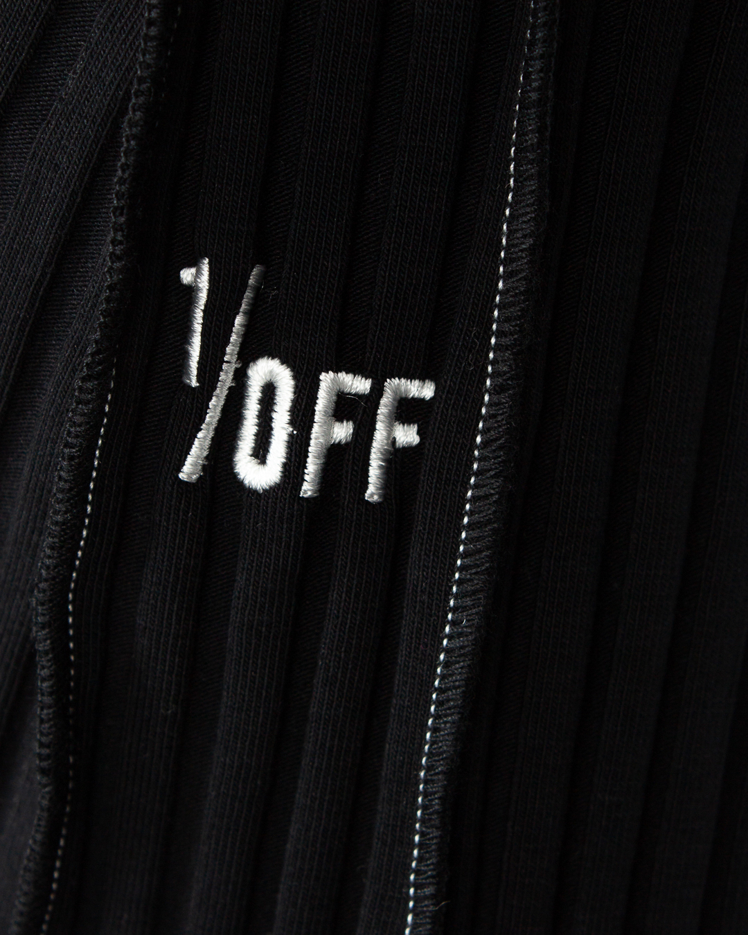 Рестайлинговый топ 1/OFF сшили из эластичного хлопка в рубчик. Облегающее изделие с завязками на рукавах и логотипом бренда.