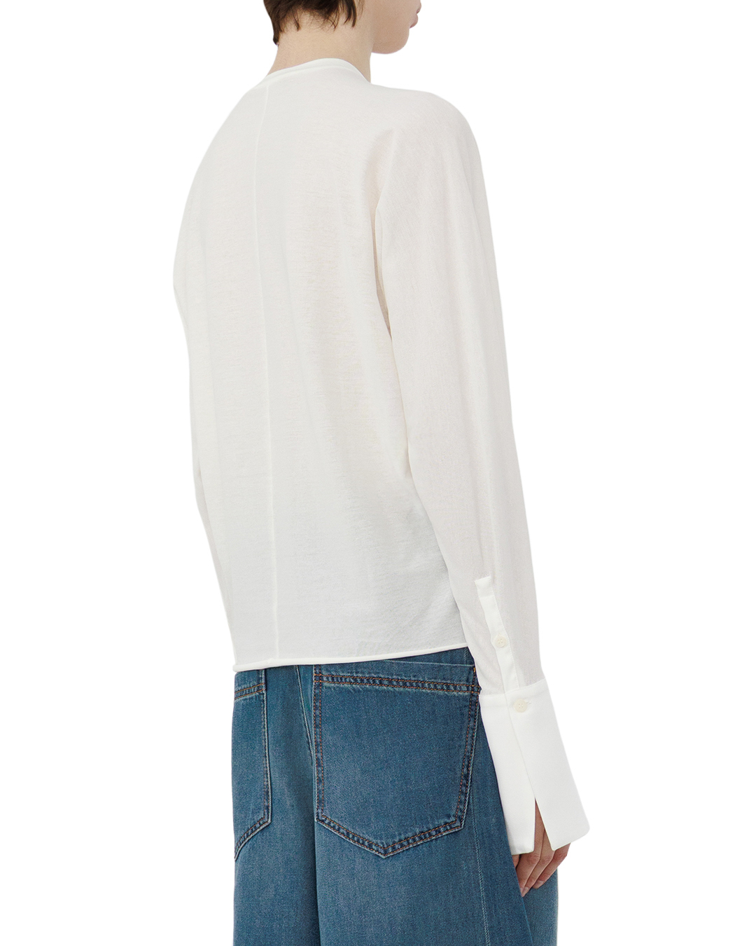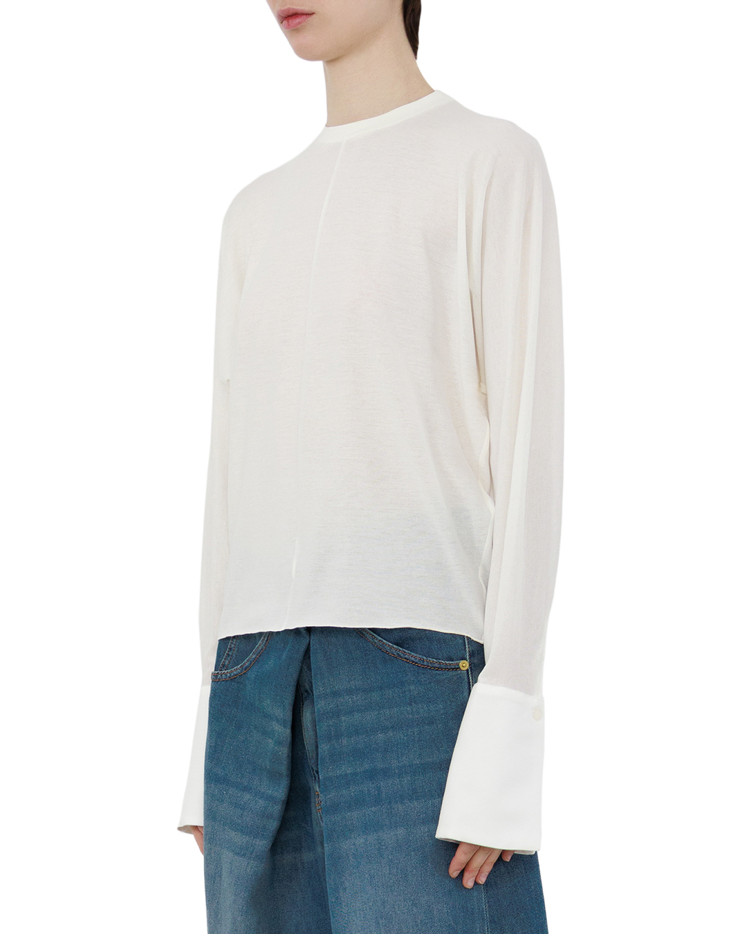Этот лонгслив — олицетворение минималистичной элегантности. Свободный крой создаёт непринуждённый, но изысканный силуэт, подчёркивая естественность линий. Нежный молочный оттенок придаёт образу лёгкость и универсальность, позволяя сочетать вещь с разными элементами гардероба. Особенность модели — аккуратные манжеты на рукавах, которые добавляют изделию утончённости без излишней вычурности. Круглый вырез обработан безупречно: край ровный, без заломов, что говорит о высоком качестве пошива. Лёгкая драпировка по бокам создаёт мягкую динамику, а едва заметные швы подчёркивают продуманность конструкции. Простота и чистота линий делают этот лонгслив базой для стильных, сбалансированных образов.