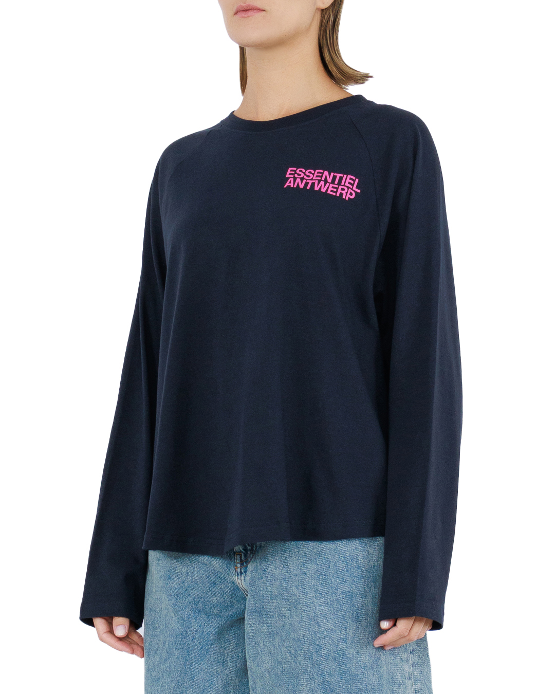 Этот лонгслив — пример идеального сочетания изысканной простоты и актуальной тенденции. Изготовленный из мягкого хлопкового трикотажа, он обеспечивает комфорт и легкость, что делает его незаменимой основой любого гардероба.  Свободный крой с длинными рукавами обеспечивает свободу движений и универсальность использования, идеально подходя как для расслабленного, так и для активного дня.   Круглый вырез горловины с аккуратной обработкой и усиленной строчкой подчёркивает внимание к деталям и добавляет изысканности.   Контрастный логотип яркого розового цвета на передней части добавляет модный акцент, создавая эффектную игру на фоне глубокого синего цвета.  Этот лонгслив можно легко комбинировать с различными стилями, будь то классические джинсы или элегантные брюки, и всегда оставаться в тренде, подчёркивая индивидуальный стиль и уверенность.