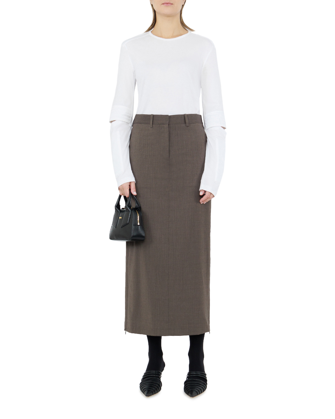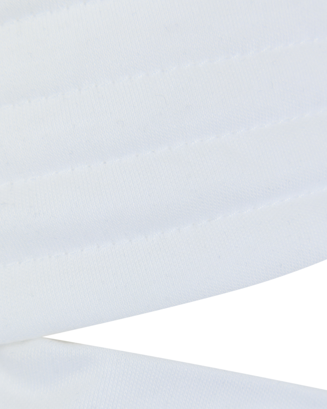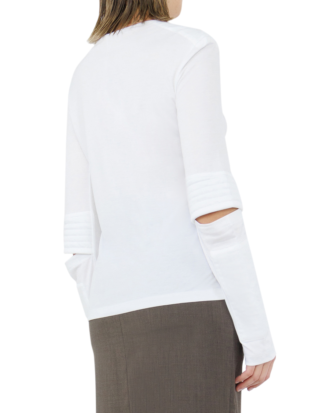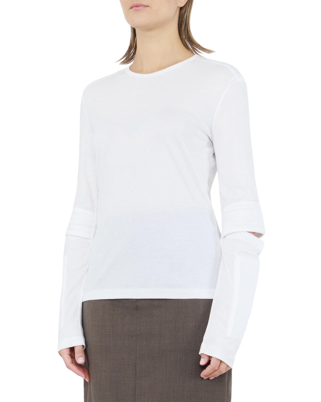 Для пошива белого лонгслива с круглым вырезом дизайнеры бренда использовали лиоцелл. Легкий и мягкий материал не деформируется в процессе носки и не покрывается катышками. Модель дополнили накладками на плечах и разрезами на локтях.