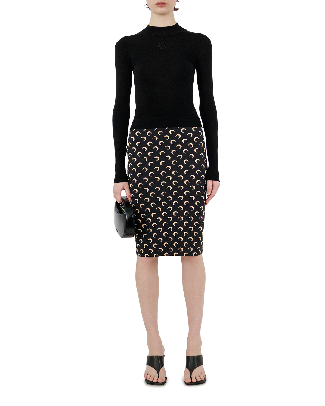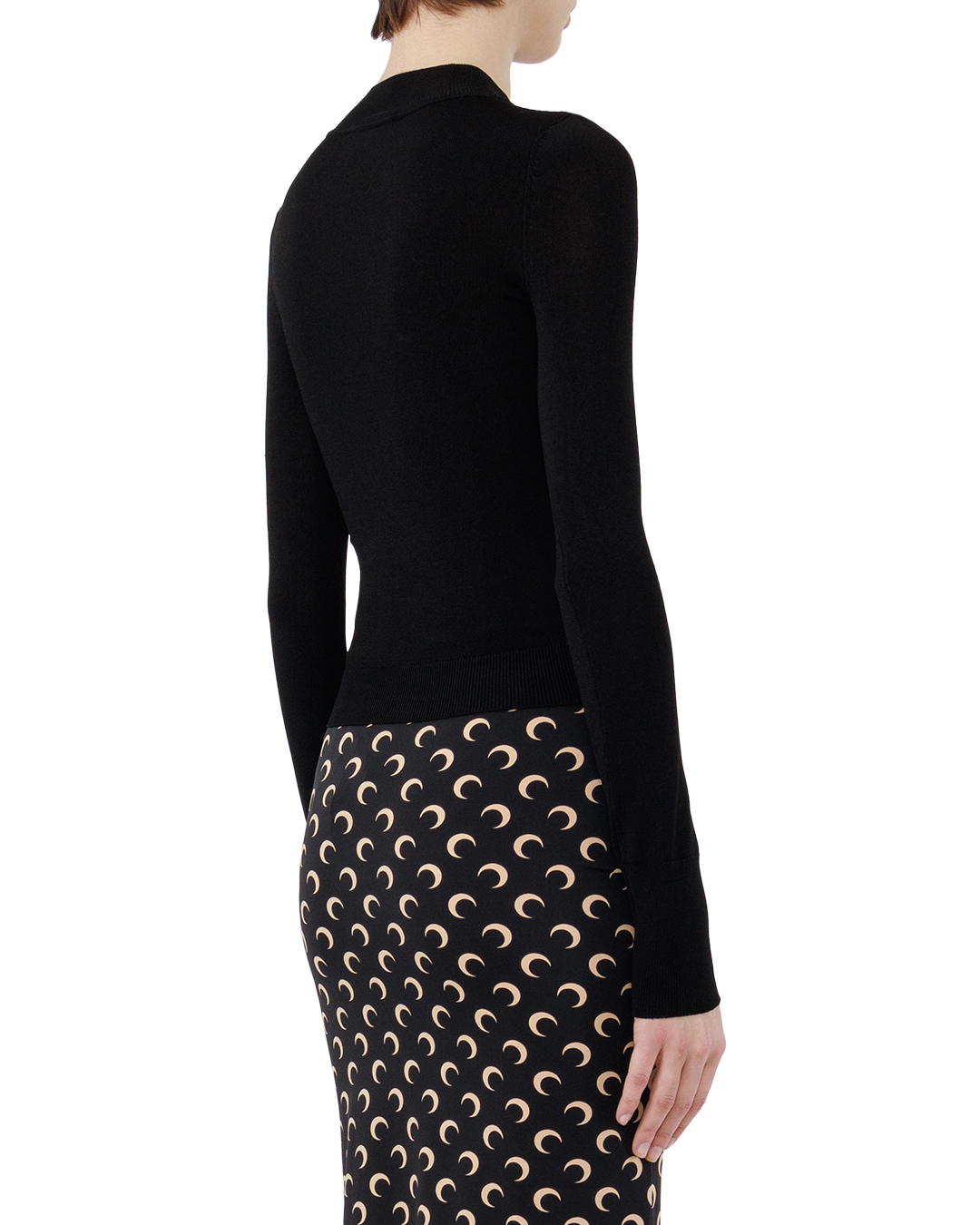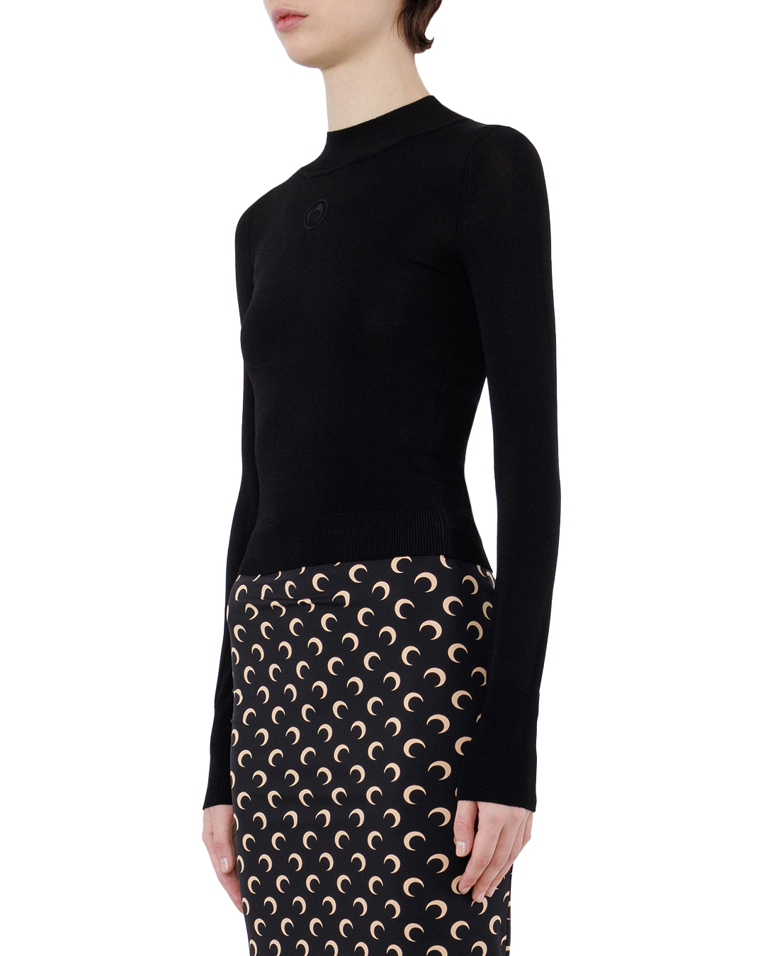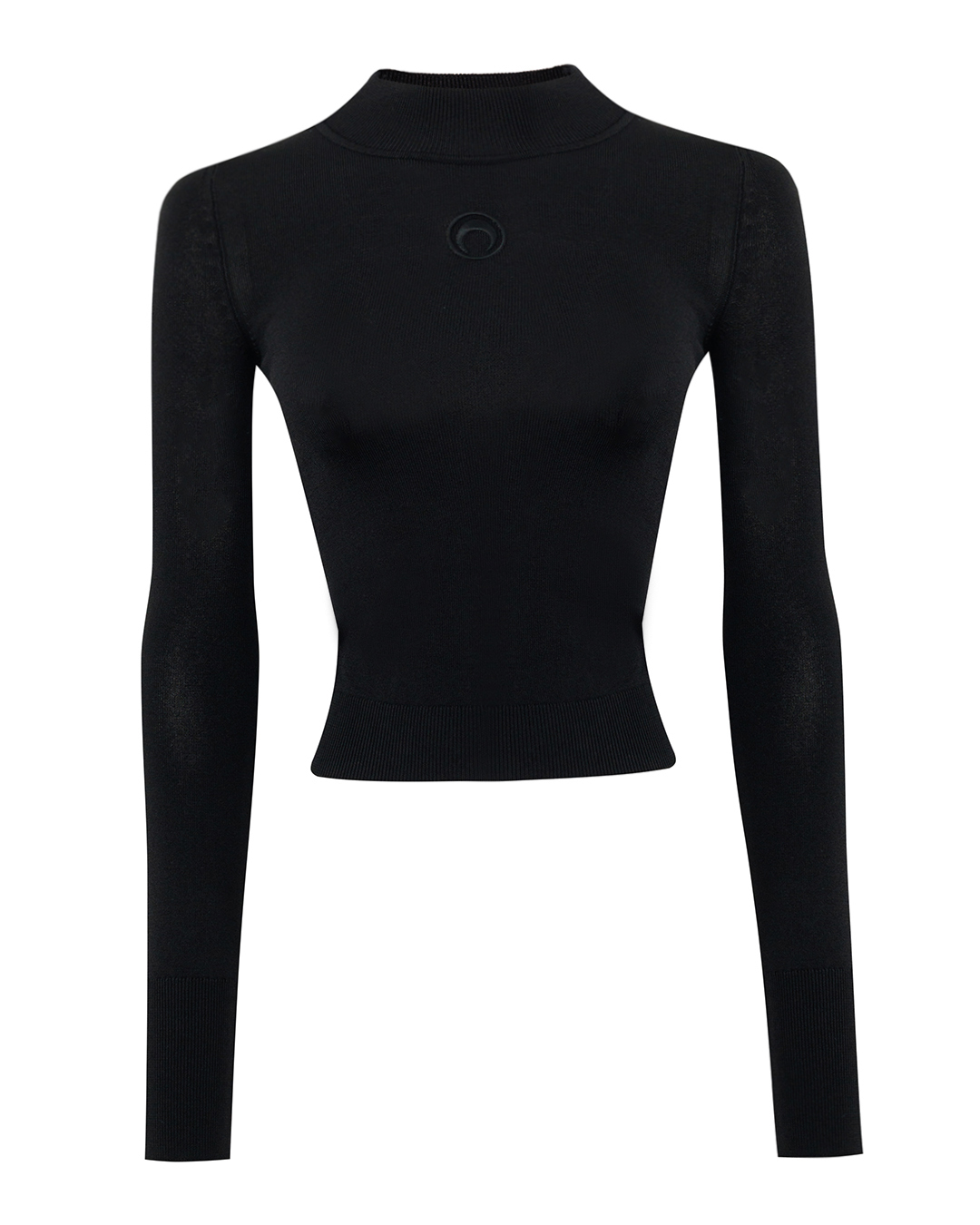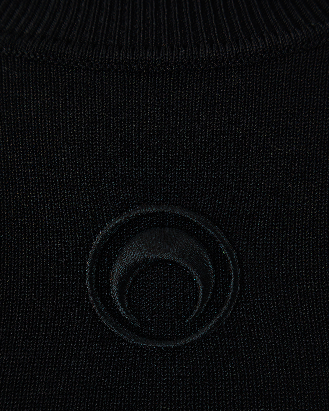 Этот лонгслив — воплощение утонченной элегантности и современного минимализма. Изготовленный из мягкой и эластичной ткани, он обеспечивает идеальную посадку и свободу движений. Облегающий крой подчеркивает стройный силуэт, а высокая горловина создает элегантный и утонченный образ. Черный цвет добавляет универсальности и делает изделие изысканным элементом любого гардероба. Центральный элемент — аккуратная вышивка в виде полумесяца, добавляющая изделию уникальность и стильный акцент. Манжеты и подол отделаны плотной рифленой вязкой, что придает структурированность дизайну. Этот лонгслив легко адаптируется как под повседневные образы, так и под более формальные комплекты, позволяя создавать многослойные стилизации. Идеальное сочетание комфорта и модного дизайна делает его незаменимой частью гардероба для тех, кто ценит стиль и функциональность.