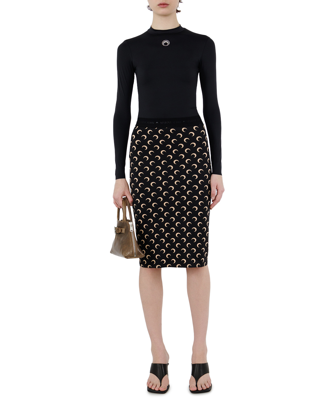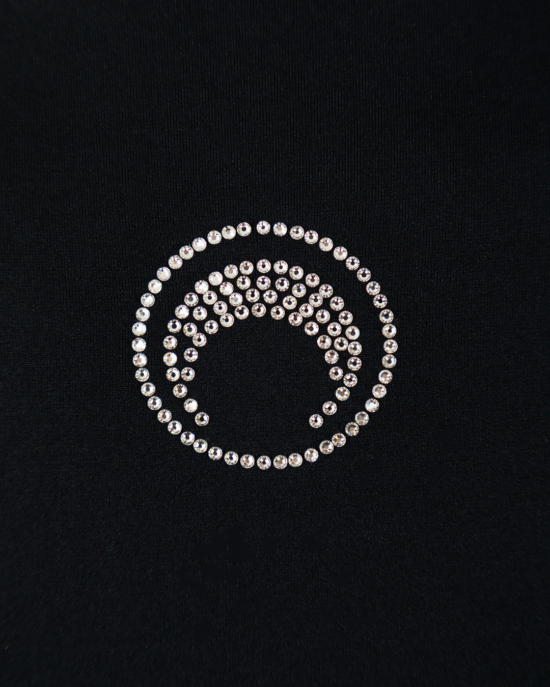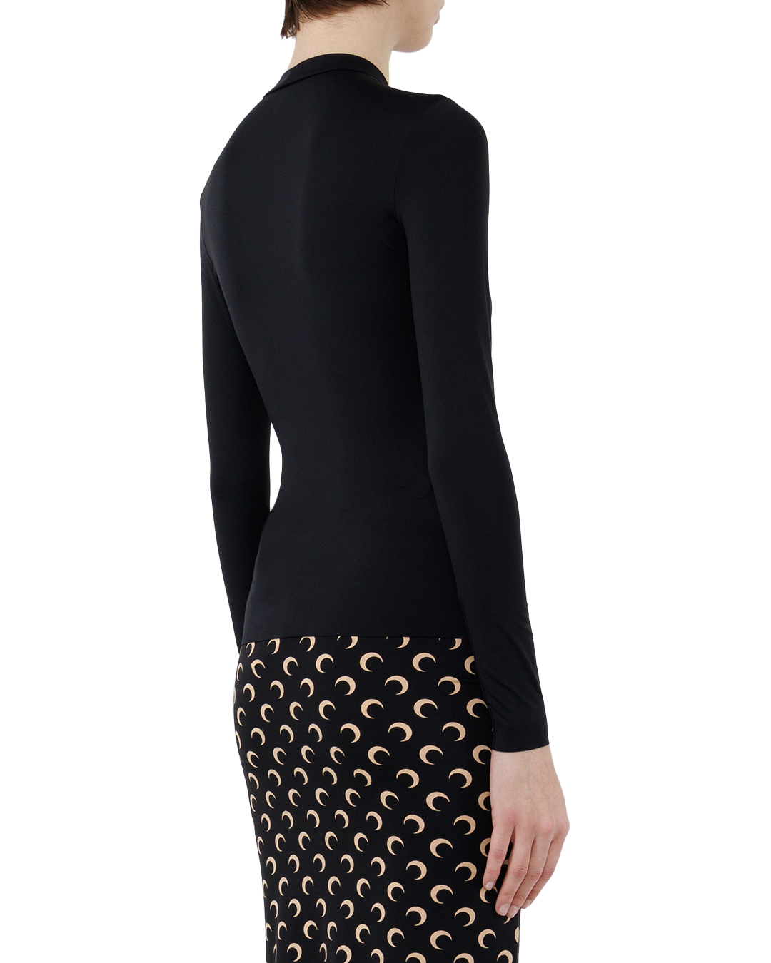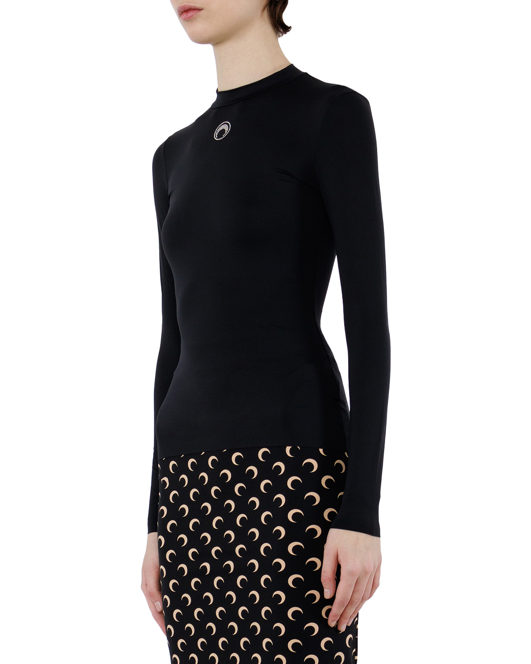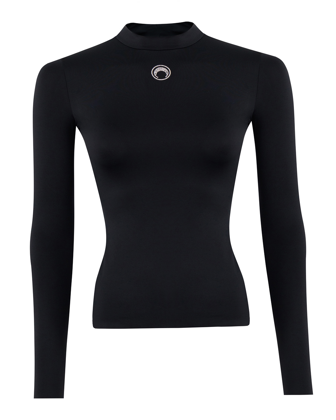 Этот лонгслив — квинтэссенция современной элегантности и минималистичного шика. Выполненный из высококачественного эластичного материала, он мягко обтекает фигуру, акцентируя женственность и создавая идеальный силуэт. Высокая горловина добавляет изысканности и обеспечивает комфорт в прохладные дни. Глубокий черный цвет подчеркивает универсальность и делает эту вещь актуальной в любом сезоне. Центральный декоративный элемент — изящный логотип с полумесяцем, выполненный в виде блестящей аппликации, который притягивает взгляды и добавляет нотку роскоши. Плавные линии швов и идеальная обработка краев подчеркивают высокий уровень мастерства и внимание к деталям. Этот лонгслив будет гармонично сочетаться как с деловыми ансамблями, так и с повседневными образами, легко адаптируясь к любому стилю благодаря своему лаконичному дизайну. Настоящая находка для любителей минимализма с характером.