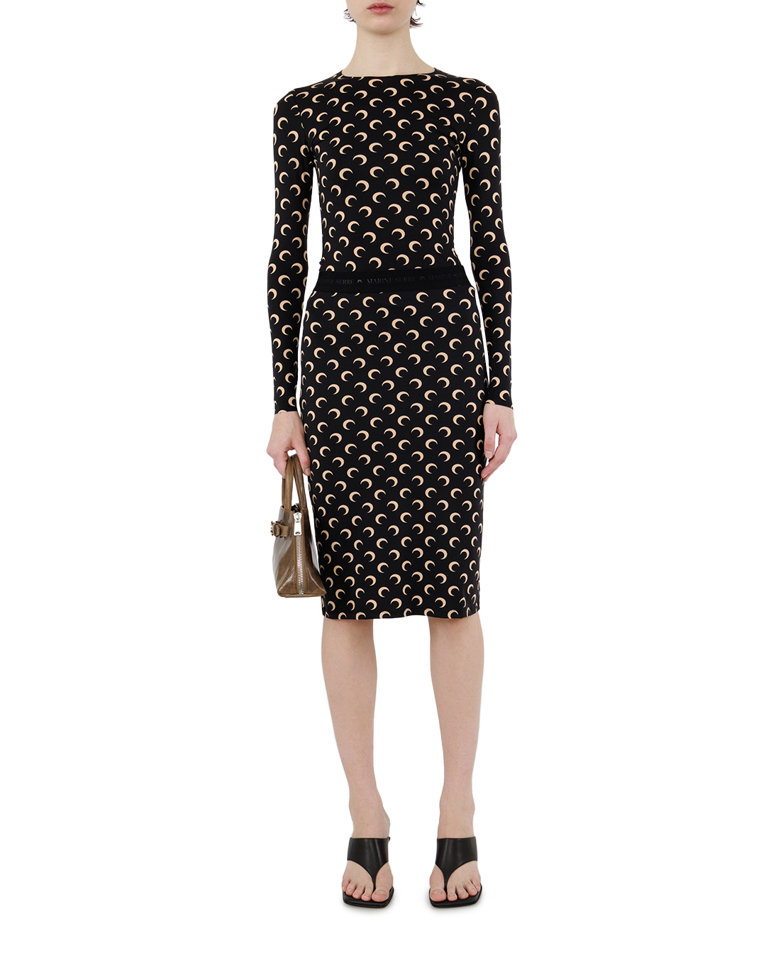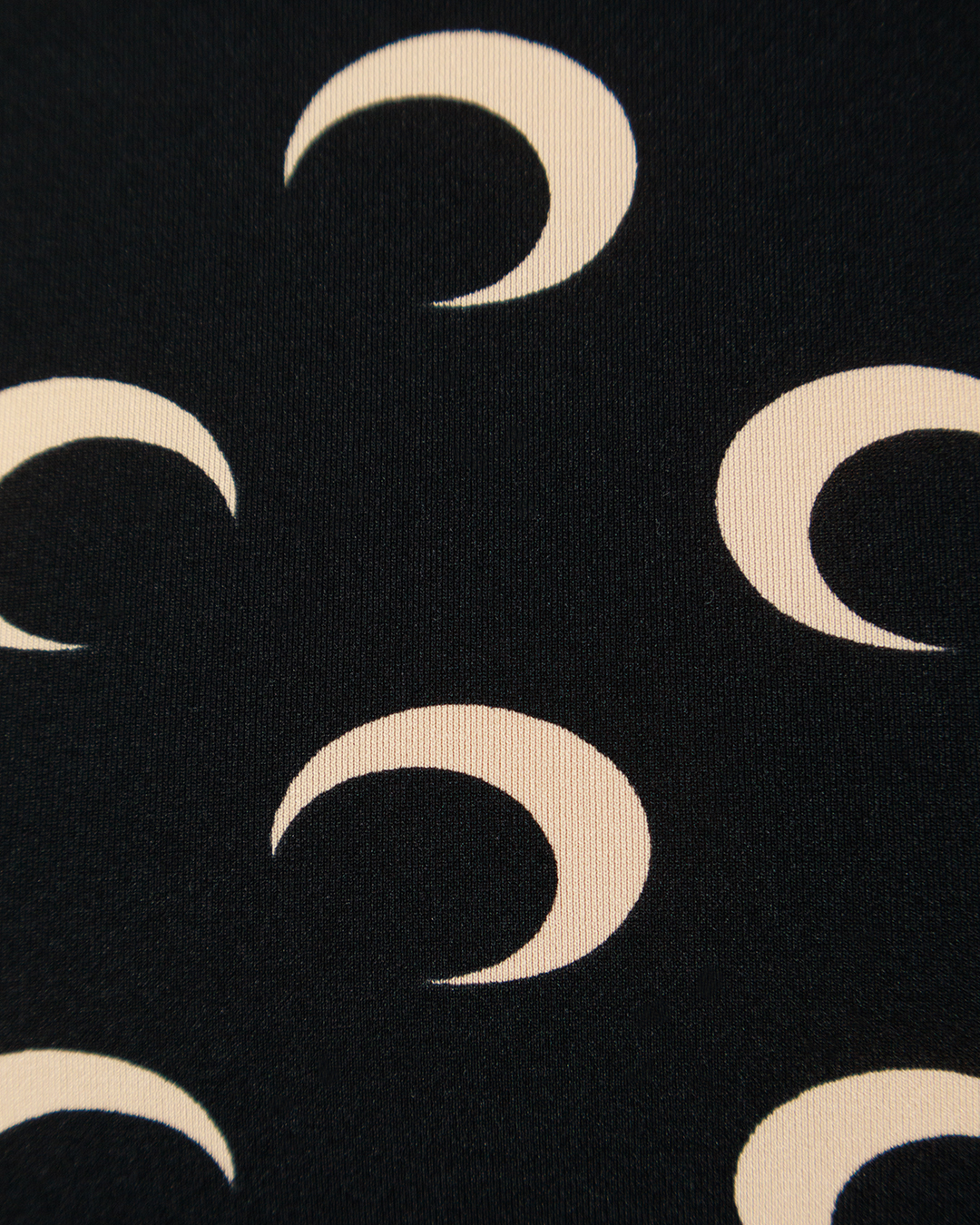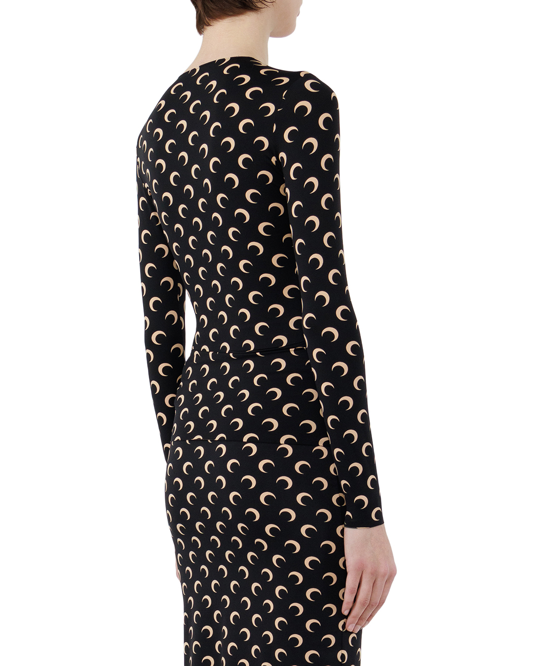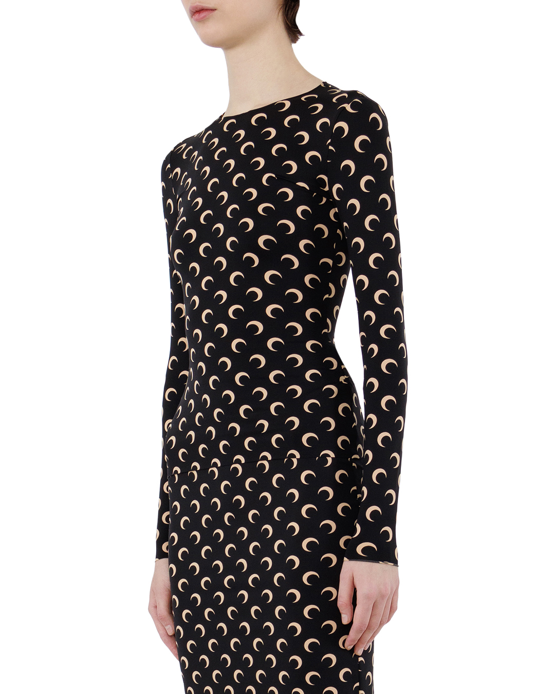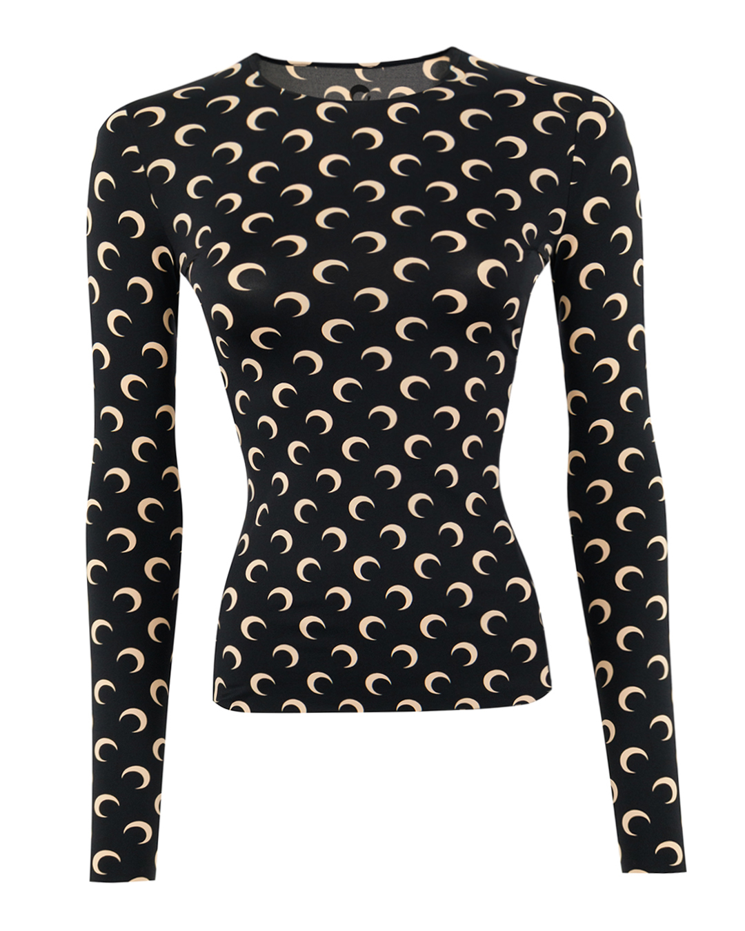 Этот лонгслив — великолепная интерпретация современной моды с акцентом на уникальный принт. Он выполнен из эластичного и гладкого материала, обволакивающего тело и подчеркивающего силуэт благодаря облегающему крою. Фоновый черный цвет изделия служит идеальной основой для привлекательного принта с полумесяцами, который добавляет изделию динамики и визуальной текстуры. Этот рисунок создаёт интригующий и стильный образ, выделяя лонгслив среди базового гардероба. Круглый вырез горловины аккуратно обработан, обеспечивая комфорт и гармоничное завершение дизайна. Длинные рукава создают изящный контур, делая модель идеальной для многослойных образов. Этот лонгслив способен стать центральным элементом в вашем комплекте, легко сочетаясь с различными стилями — от кэжуал до более нарядных ансамблей, добавляя индивидуальность и выраженное чувство стиля.
