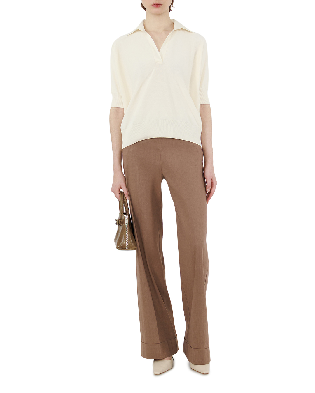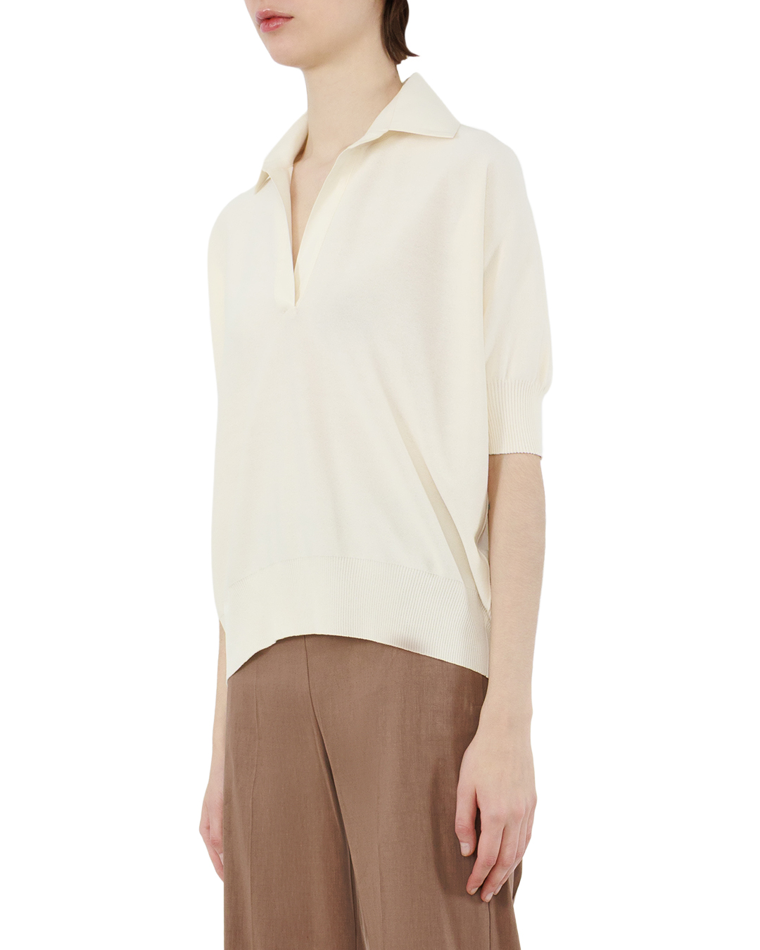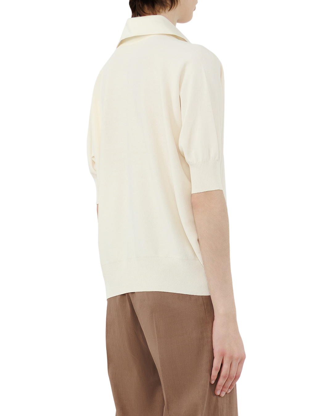 Это поло от D.EXTERIOR — воплощение изысканной лаконичности, способное стать центральным элементом любого гардероба. Нежный молочно-белый оттенок создаёт ощущение лёгкости и свежести, а безупречный крой подчёркивает утончённость вкуса своей обладательницы. Модель выполнена из тончайшей шерсти, которая сочетает в себе благородную фактуру и исключительный комфорт. Ткань деликатно облегает фигуру, не сковывая движений, при этом прекрасно держит форму — идеальный баланс между элегантностью и практичностью. Классический отложной воротник придаёт изделию сдержанный аристократизм, а застёжка на пуговицы по центру добавляет графичности, сохраняя общую гармонию образа. Короткие рукава с рельефной резинкой в рубчик не только функциональны, но и создают динамичный акцент, подчёркивающий изящество силуэта. Расклешённый крой поло мастерски балансирует между свободой и женственностью, мягко очерчивая линии фигуры. Низ изделия оформлен резинкой, которая завершает композицию, придавая модели дополнительную элегантность. Аккуратные плечевые швы органично вписаны в конструкцию, подчёркивая внимание бренда к деталям. Это поло легко трансформируется из элемента повседневного гардероба в часть более формального образа. Сочетайте его с классическими брюками для делового стиля, льняными шортами для расслабленного летнего лука или юбкой-карандашом для создания утончённого ансамбля. Благородный оттенок и безупречное качество материала делают эту модель поистине универсальной — она способна оживить любой образ, добавив ему изысканности и шарма.