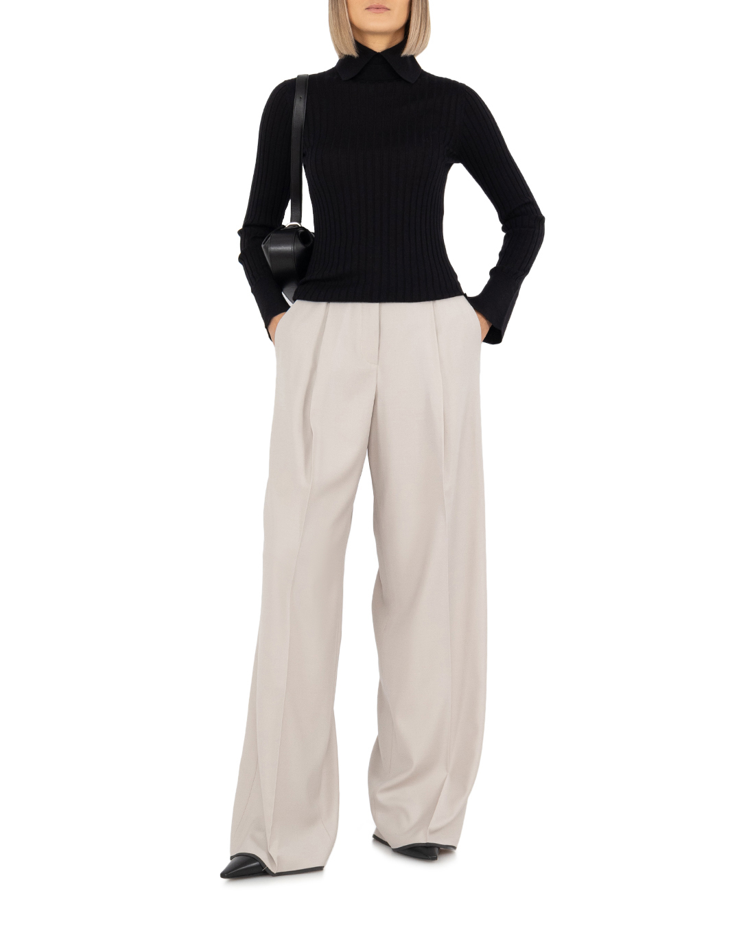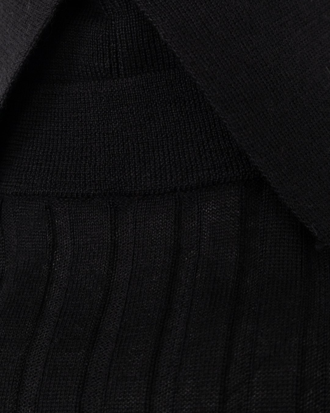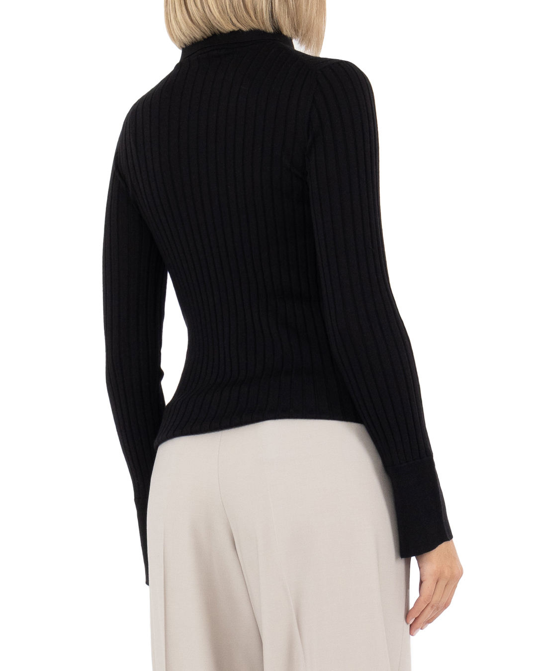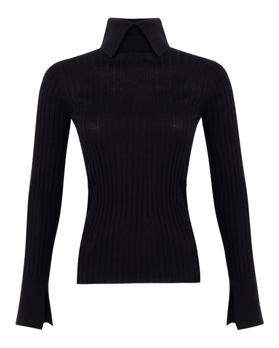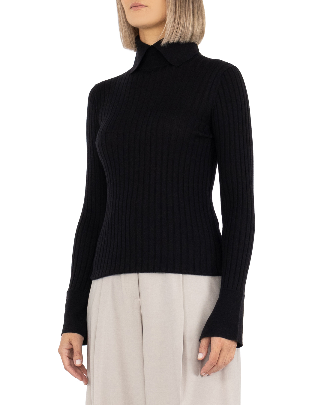 Черный лаконичный полувер с необычным воротником стойкой и отложными лацканами сможет найти общий язык с вещами и из повседневного, и из офисного гардероба. Модель изготовили из фактурного трикотажа на основе премиальной шерсти включив в состав шелк и кашемир. Полувер с длинными рукавами с небольшими разрезами на манжетах.