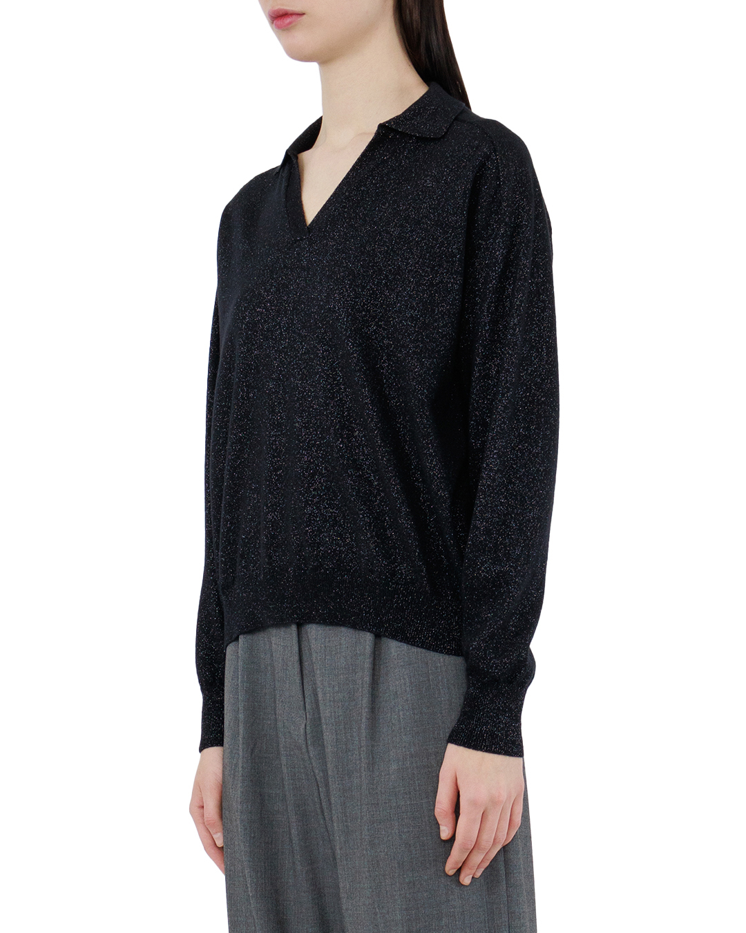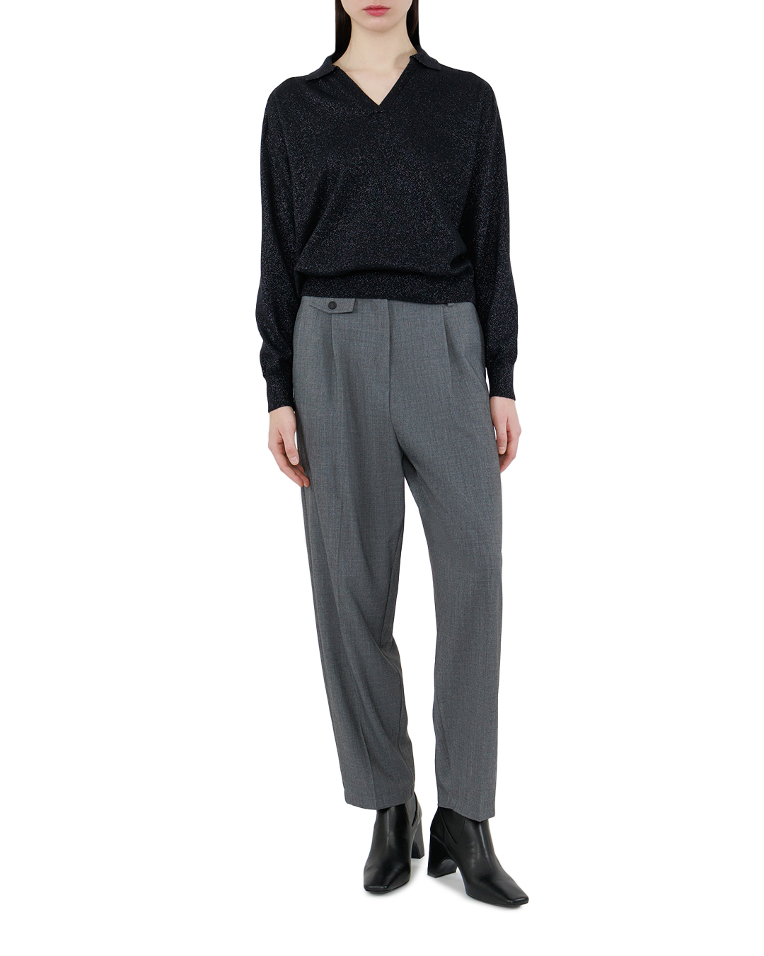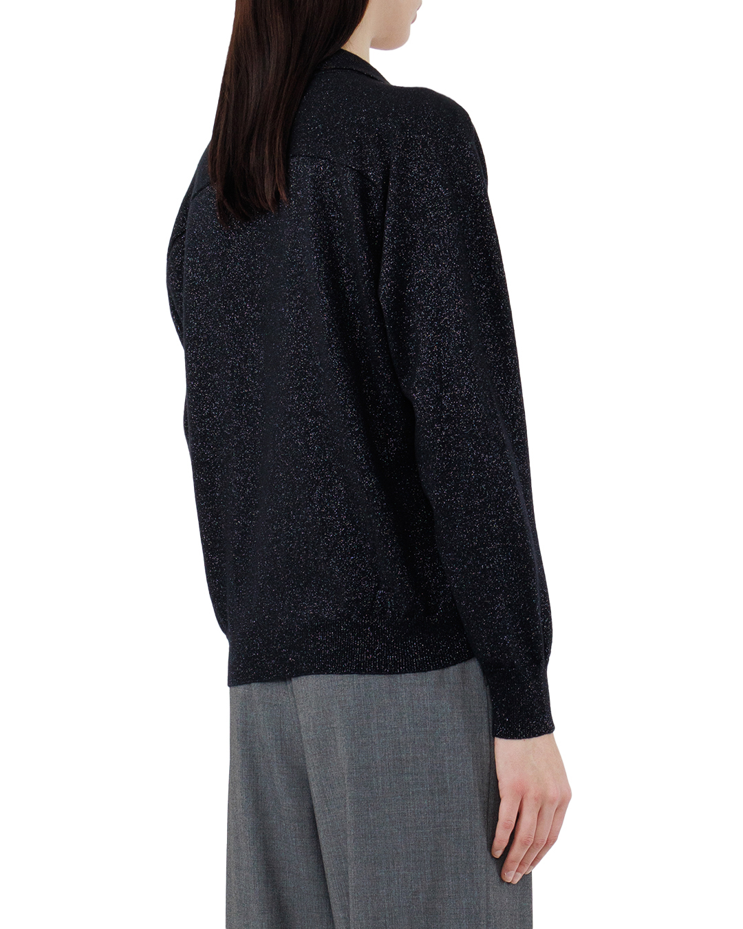 Этот пуловер — истинное воплощение утончённого вечернего стиля. Изготовленный из мягкой ткани с добавлением металлической нити, он излучает тонкое сияние, привнося в образ нотки гламура. V-образный вырез с изящным отложным воротником добавляет элегантную женственность и делает пуловер идеальным для многослойного сочетания. Длинные рукава с мягкими манжетами обеспечивают комфорт и создают классический силуэт. Приталенная посадка подчеркивает фигуру, а легкий блеск ткани придаёт нарядности и праздничного настроения. Этот пуловер станет вашим верным спутником как для особых мероприятий, так и для стильных повседневных ансамблей, гармонично соединяя в себе комфорт и роскошь.