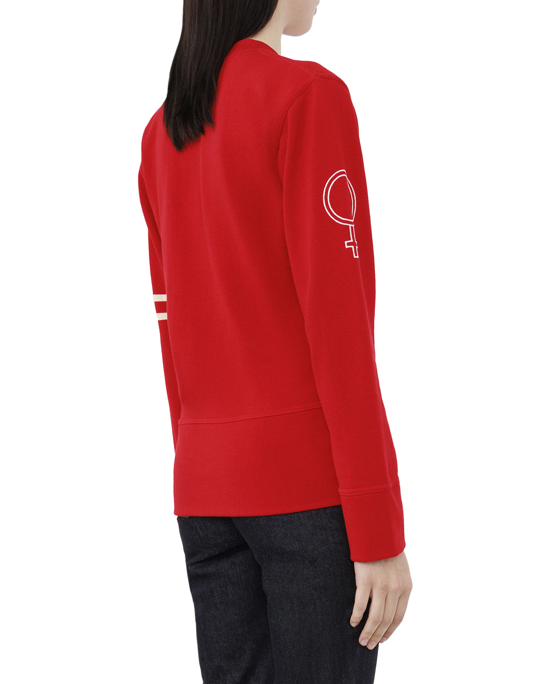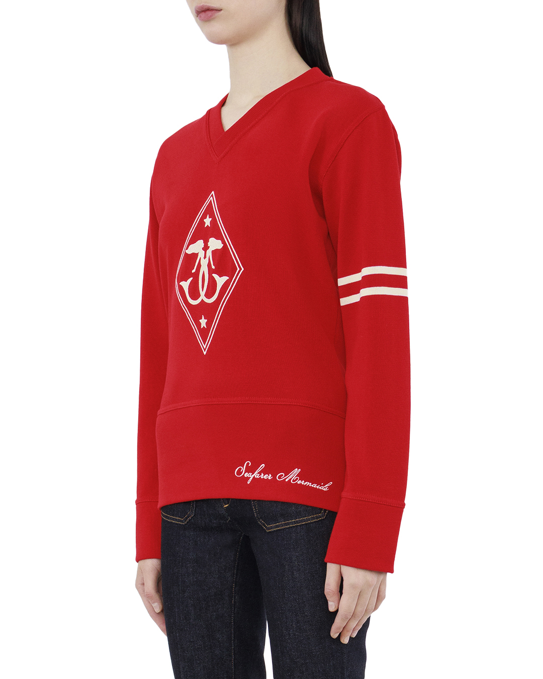 Этот пуловер ярко-красного цвета — синоним комфорта и стиля, который прекрасно впишется в повседневный гардероб. Крой — свободный, с удлиненной линией плеч и V-образным вырезом, который визуально удлиняет шею и придаёт образу легкую элегантность. Длинные рукава завершаются манжетами с аккуратным отделочным швом, что добавляет структуру и подчеркивает стиль. Ткань выполнена из мягкого высококачественного хлопка, что обеспечивает отличную посадку и эластичность. Это делает пуловер не только стильным, но и комфортным для повседневной носки. Декор — основным акцентом является крупный эмблематический принт на груди, выполненный в контрастном белом цвете. Он сочетает в себе графические элементы и текст, добавляя индивидуальность и характер изделию. Дополнительные детали — на рукавах присутствуют два горизонтальных ремешка, которые создают спортивный акцент и придают пуловеру динамичности. Низ пуловера оформлен с легким закруглением, что придаёт ему более современный вид и позволяет носить его как в заправленном, так и в свободном варианте. Этот пуловер идеально сочетается как с джинсами, так и с более формальными элементами гардероба, позволяя создать стильные и актуальные образы для любого случая.