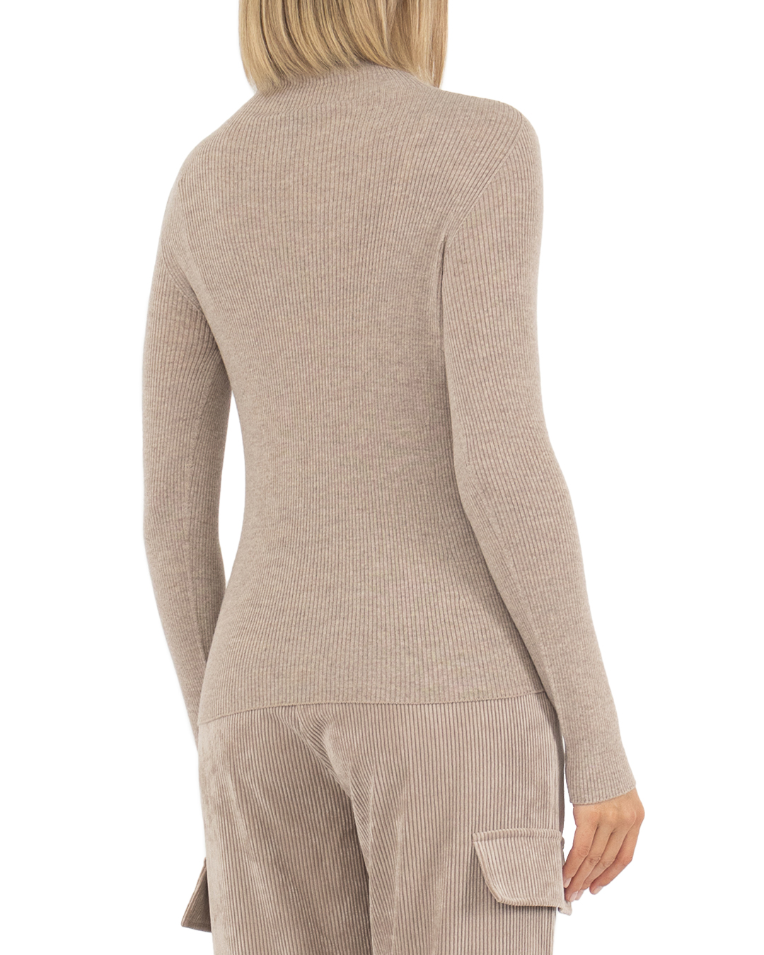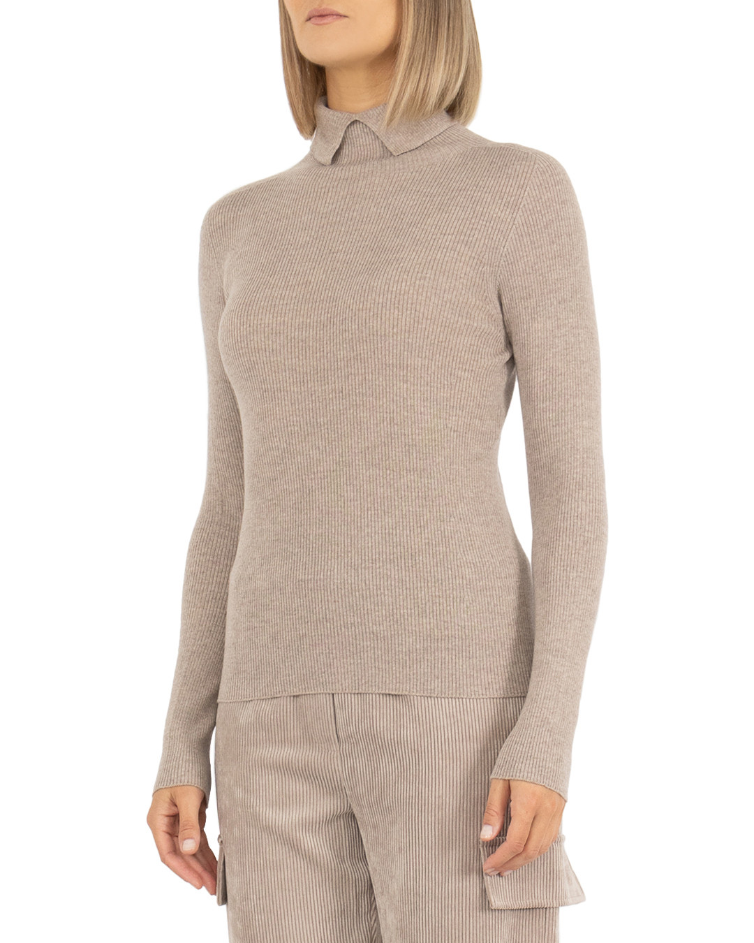 Модель прилегающего силуэта с фактурной вязкой в технике английской резинки, длинными рукавами и высоким отложным воротником