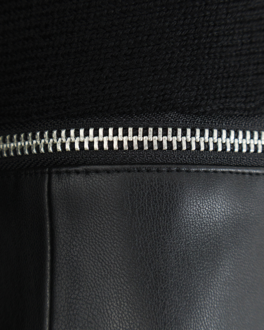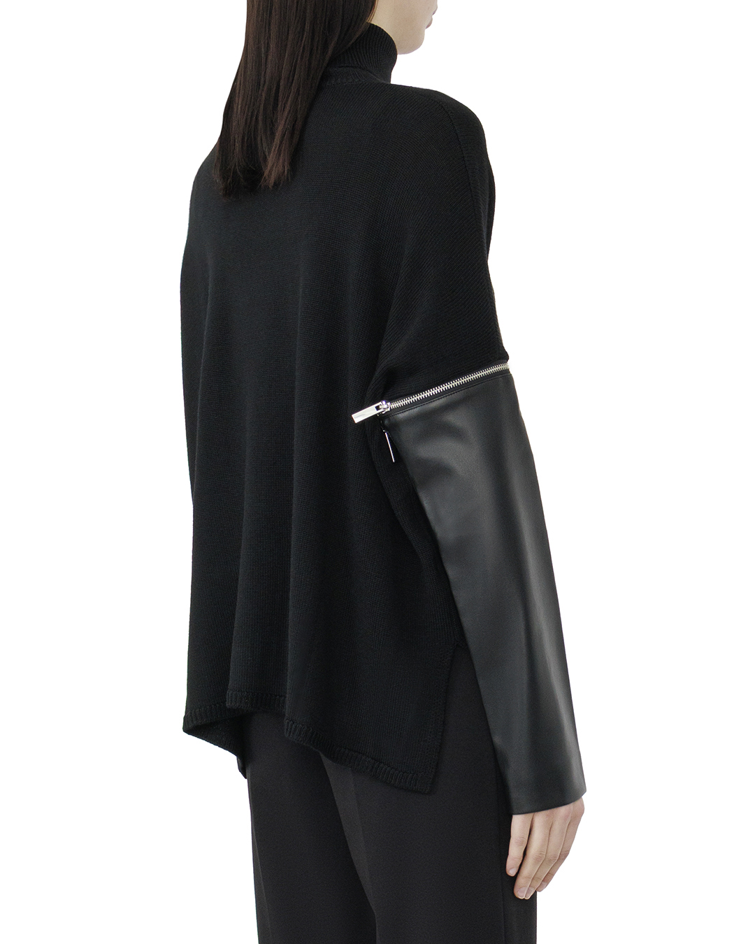 Этот джемпер демонстрирует ультрасовременный подход к классическому дизайну, соединяя фактуры для создания стильного образа. Чёрный цвет добавляет глубину и универсальность, позволяя гармонично интегрировать его в разнообразные гардеробы. Современный воротник-гольф добавляет тепла и структурности, акцентируя внимание на шее и создавая целостный образ. Прямой крой обеспечивает комфортную посадку, подчёркивая силуэт без излишней обтягивающей фактуры. Главным декоративным элементом выступают контрастные кожаные вставки на рукавах, подчеркнутые молниями. Этот дерзкий акцент добавляет изделию нотки бунтарства и изысканности, обеспечивая возможность трансформации образа — молнии на рукавах можно расстегнуть для дополнительной свободы движений. Отделка в виде ровных, чётких швов и безупречная обработка краёв подчёркивают высокое качество исполнения. Этот джемпер идеально подходит для тех, кто стремится сочетать минимализм с элементами хай-тек, отразив собственный уникальный стиль.