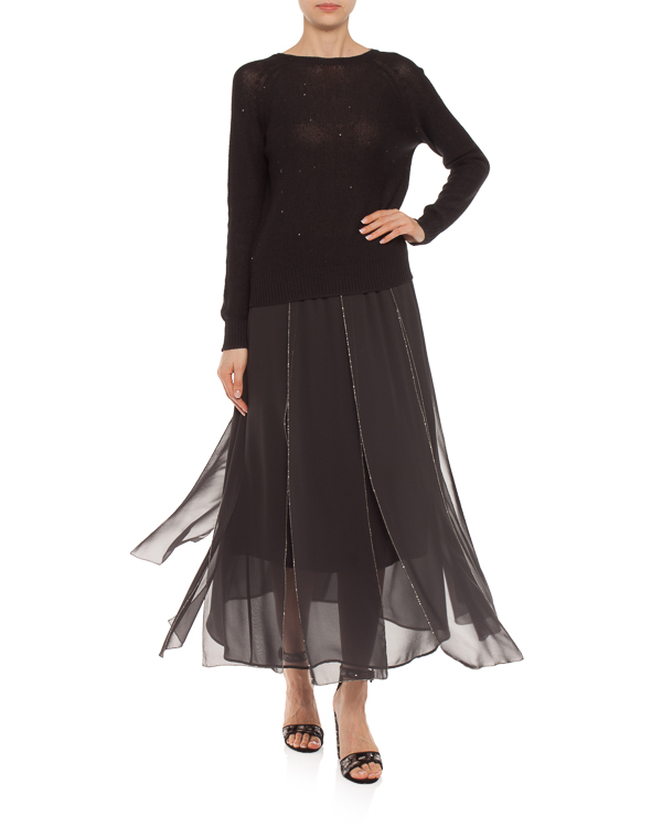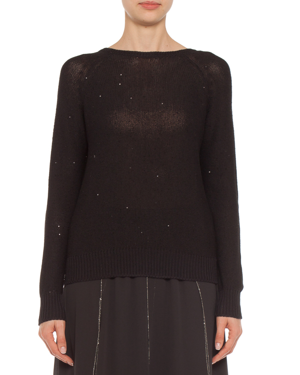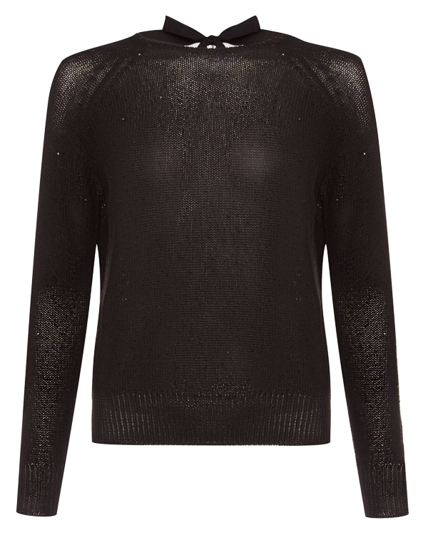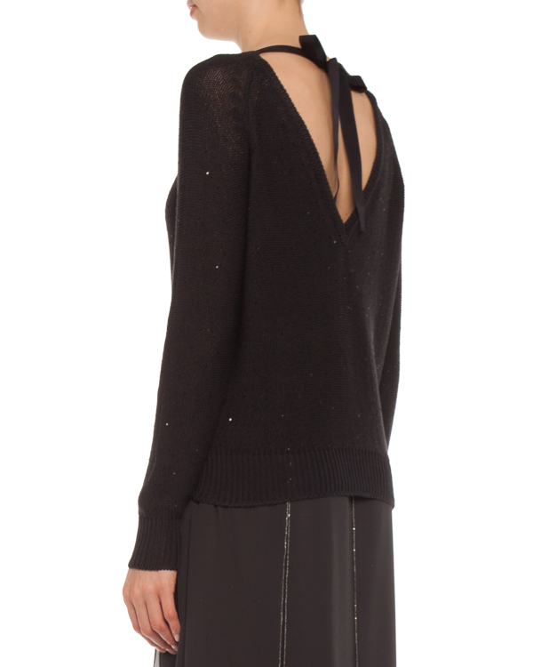 Джемпер из вязаного хлопка черного цвета с мелкими пайетками. Модель с рукавами-реглан и V-образным вырезом с ленточными завязками.