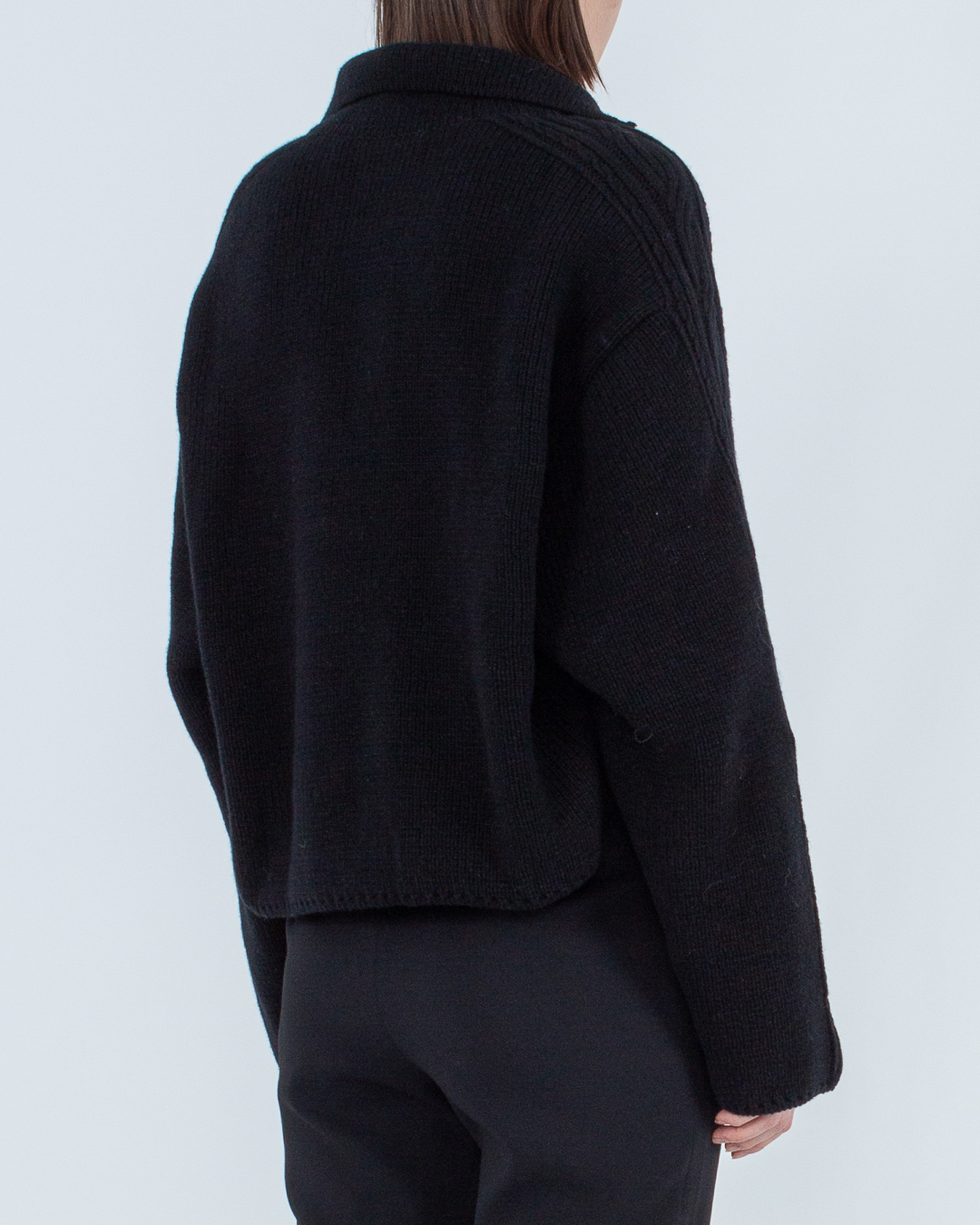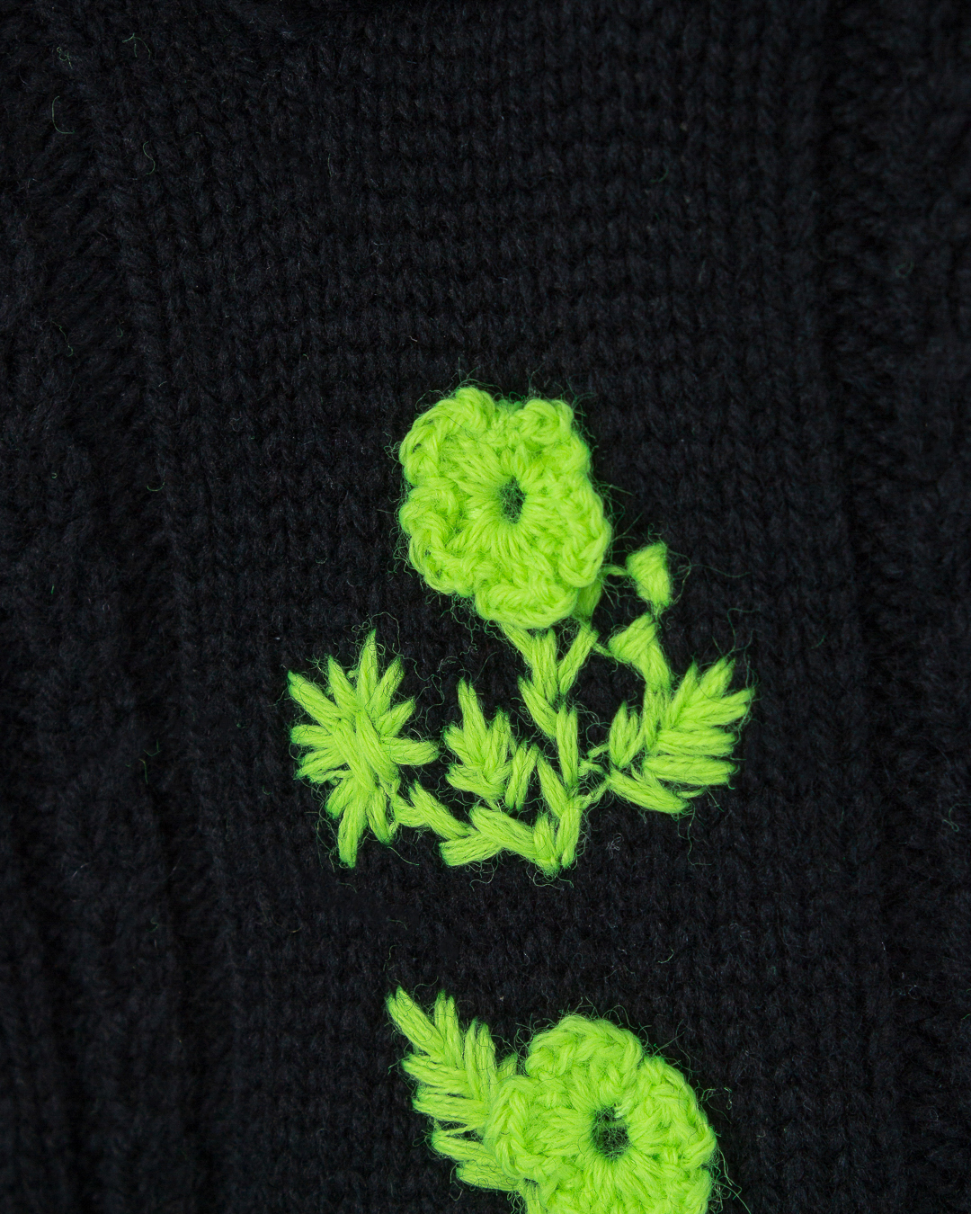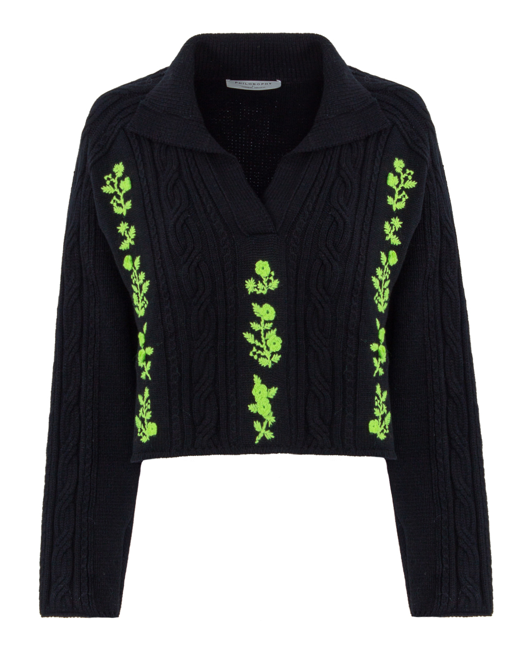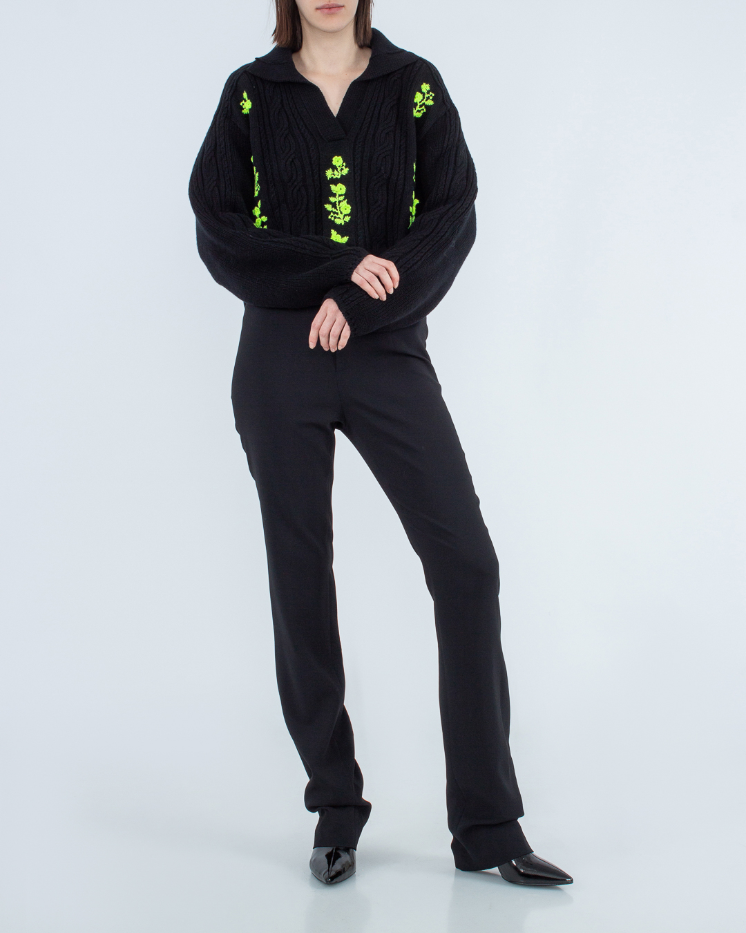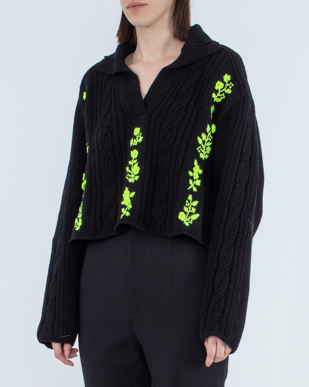 Вязаный пуловер из шерсти черного цвета с контрастной вышивкой. Укороченное изделие со спущенной линией плеч и длинными рукавами.