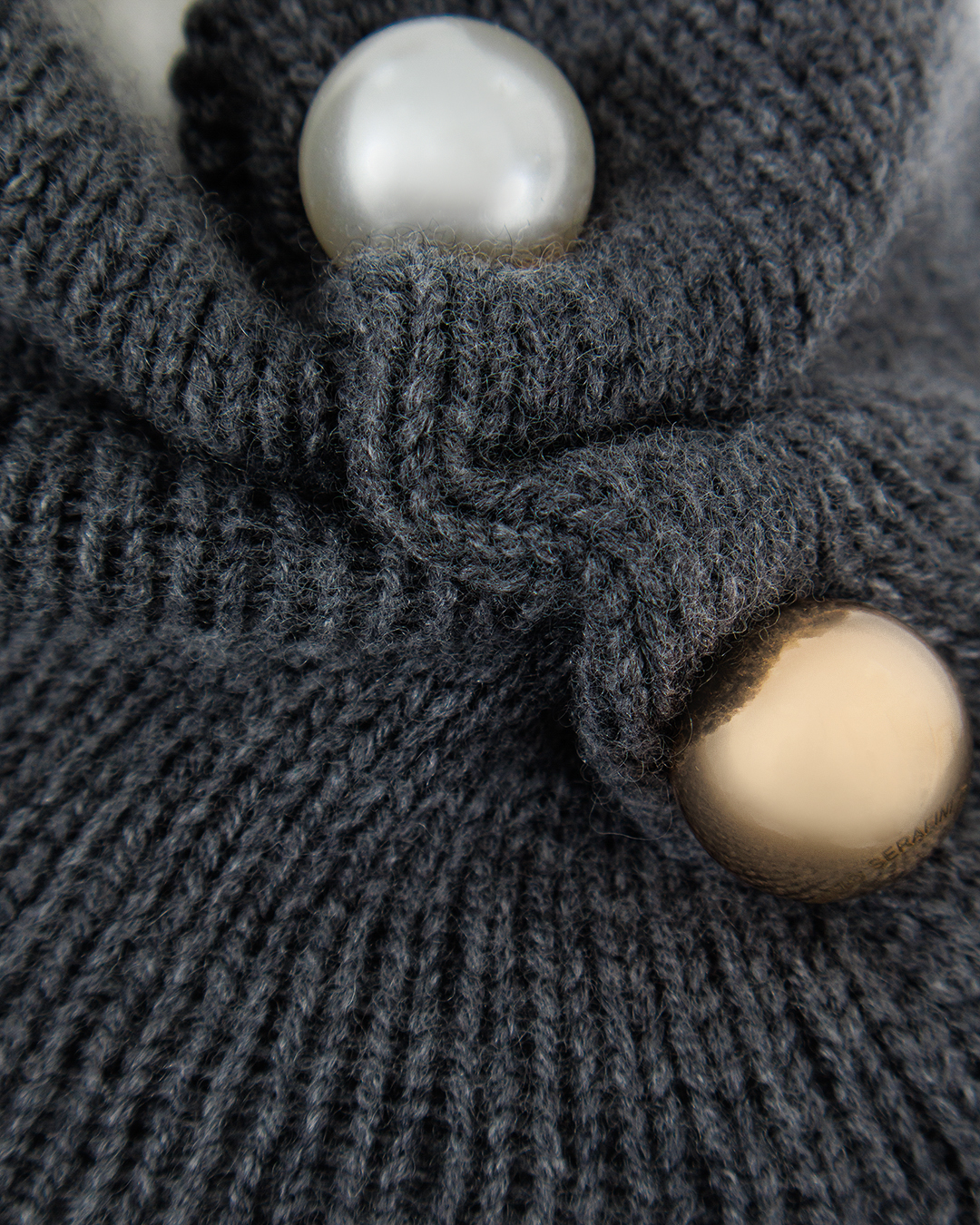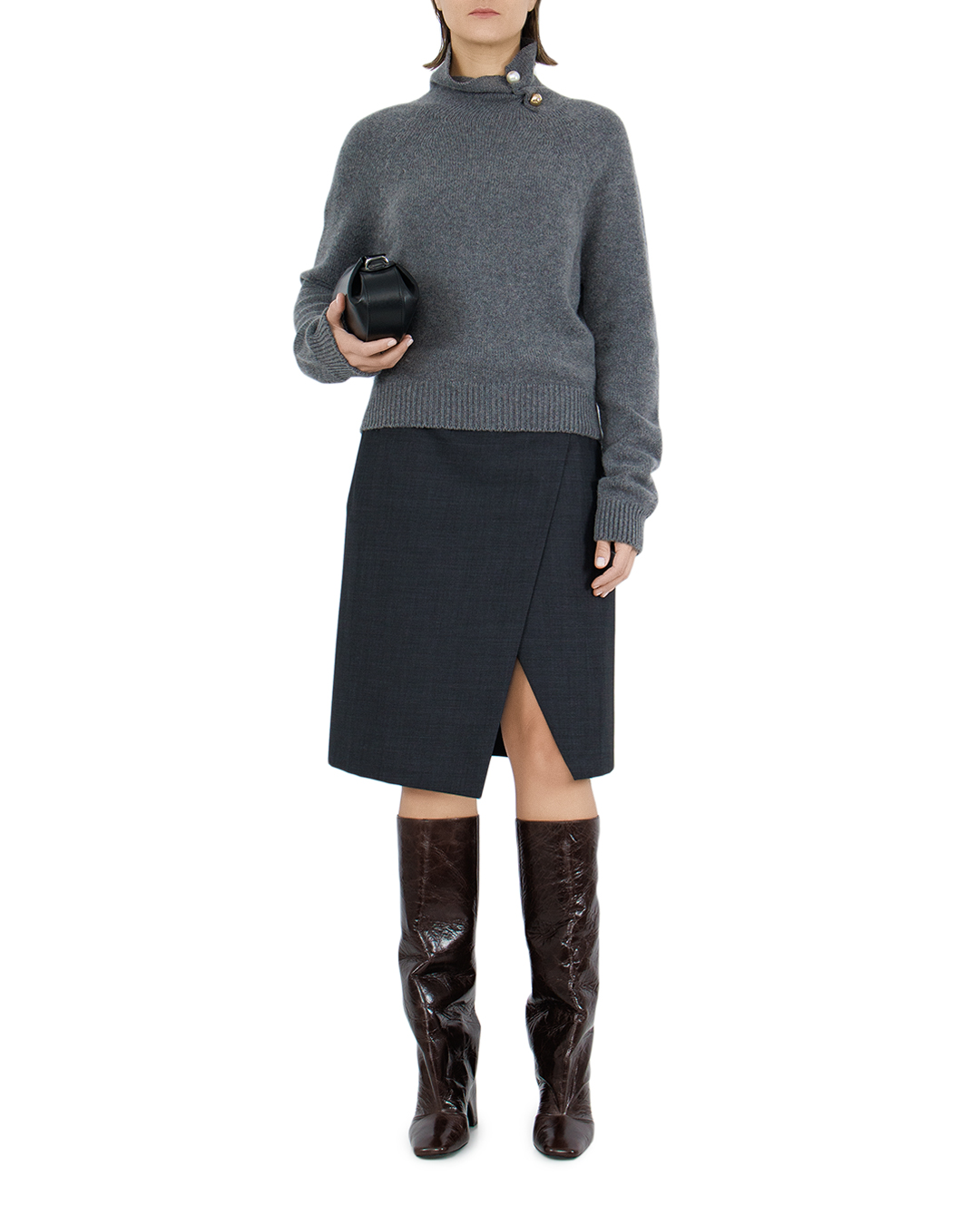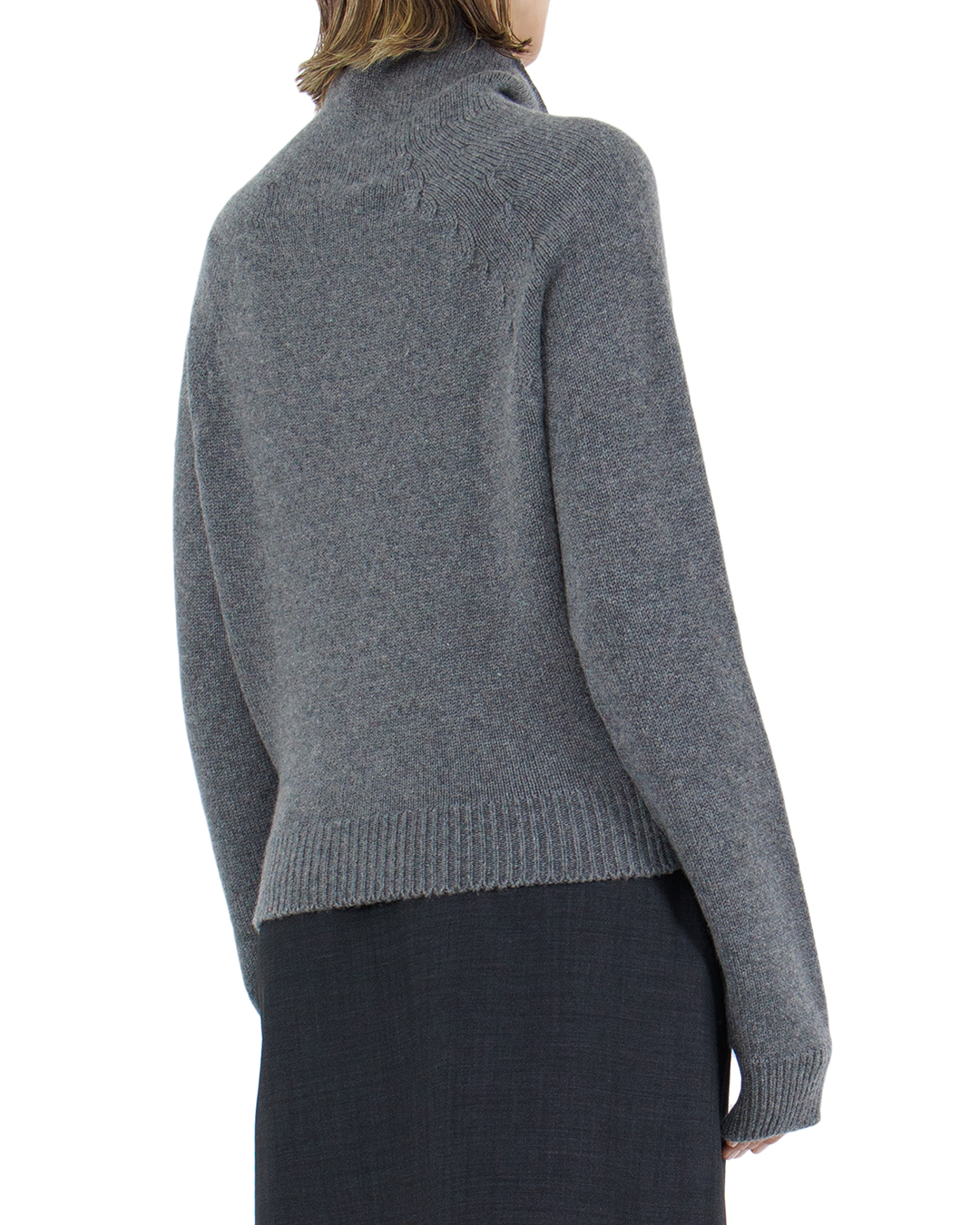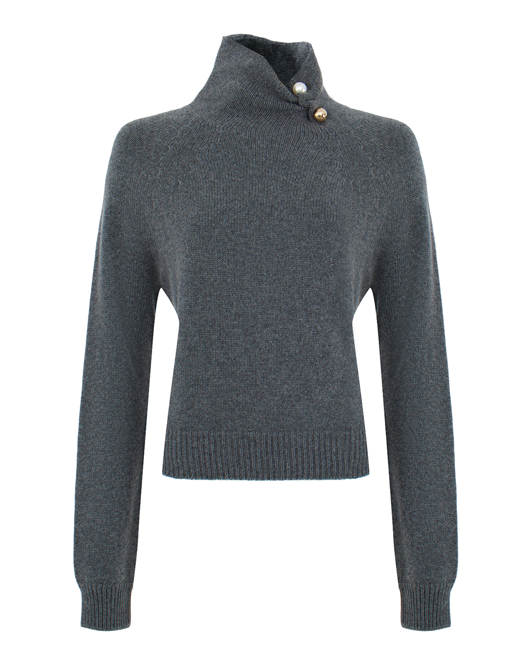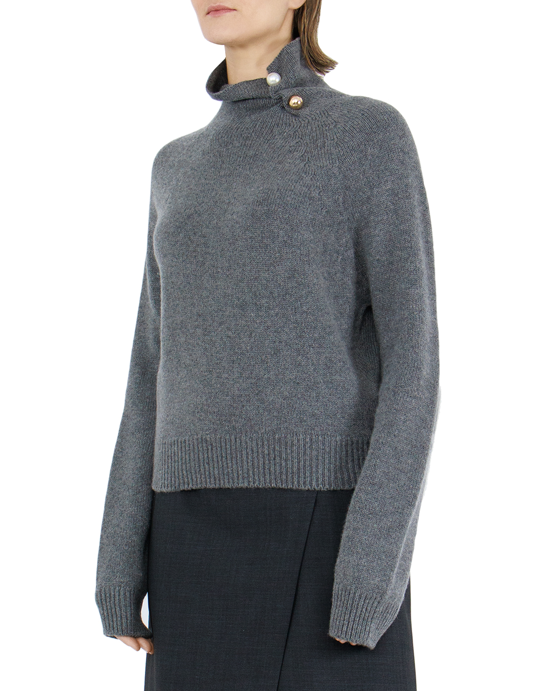 Свитер прямого кроя изготовлен из шерсти, кашемира и шелка. Манжеты и низ связаны в технике английская резинка. Высокий воротник стойка декорирован брошью в виде крупных жемчужин.