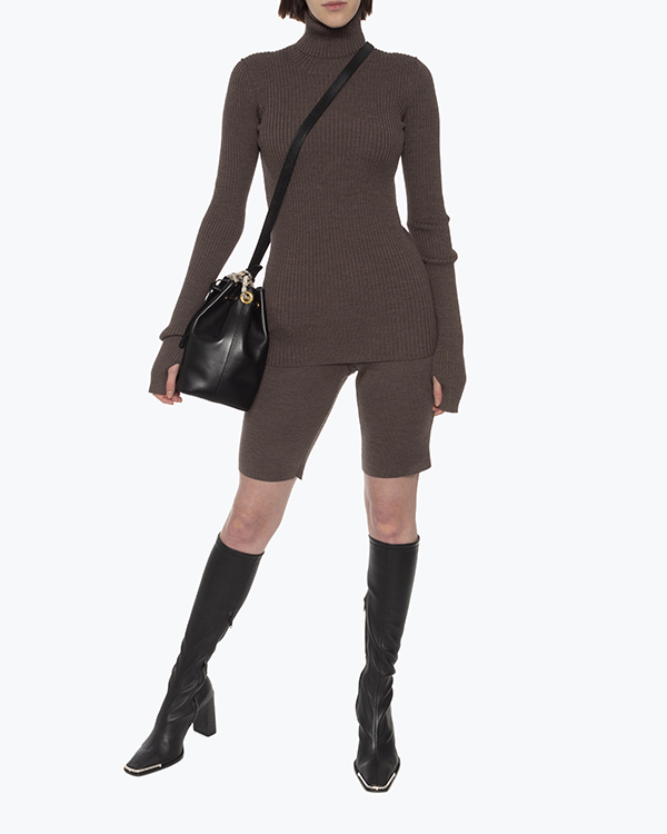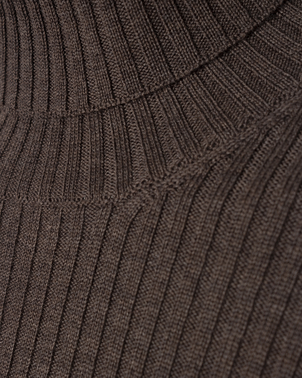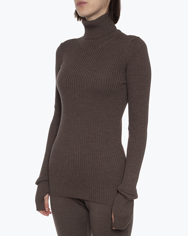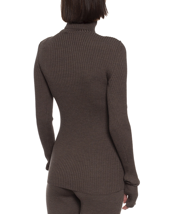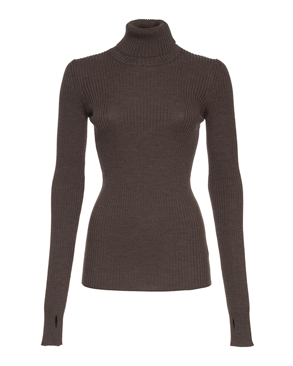 Свитер Erika Cavallini выполнен из шерсти коричневого оттенка в рубчик. Облегающее изделие с длинными рукавами с прорезями для большого пальца.