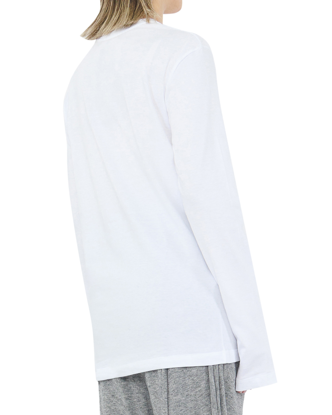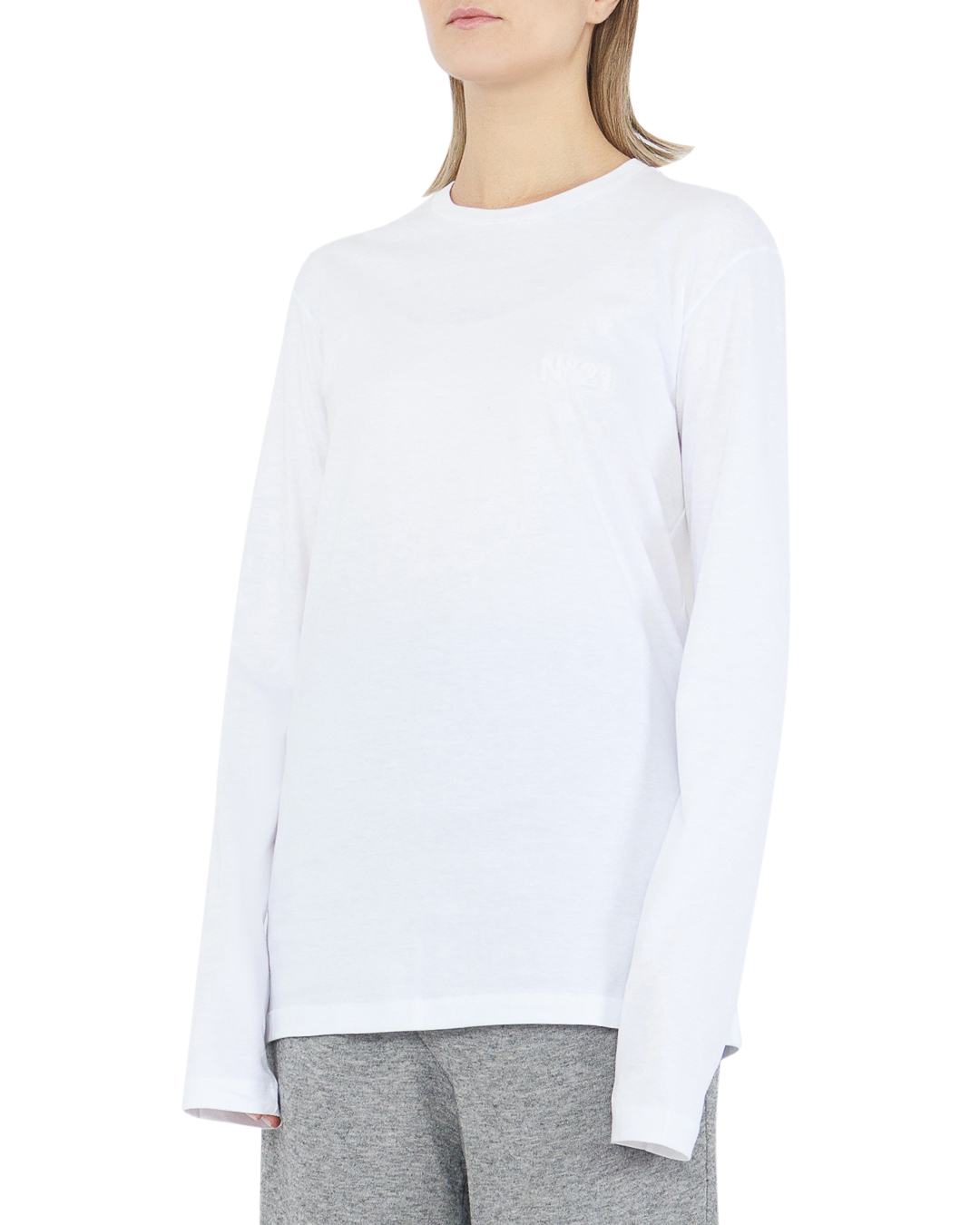 Лонгслив №21 — это образец изысканного минимализма и утонченного стиля. Его ослепительно белый цвет создает чувство чистоты и элегантности, идеально подходя для любых случаев. Классический крой с длинными рукавами обеспечивает идеальную посадку и комфорт, делая этот лонгслив универсальным и подходящим для любого времени года. Ткань обладает высокой мягкостью и отличной воздухопроницаемостью, что гарантирует комфорт в течение всего дня. Детали отделки, такие как аккуратная окантовка и незаметные швы, подчеркивают качество и внимание к деталям. Неброский логотип добавляет изысканности, сохраняя общий минималистичный стиль. Этот лонгслив можно легко сочетать с различными элементами гардероба, будь то классические брюки для создания делового образа или джинсы для повседневного стиля. Это воплощение сочетания простоты и элегантности, которое никогда не выйдет из моды.