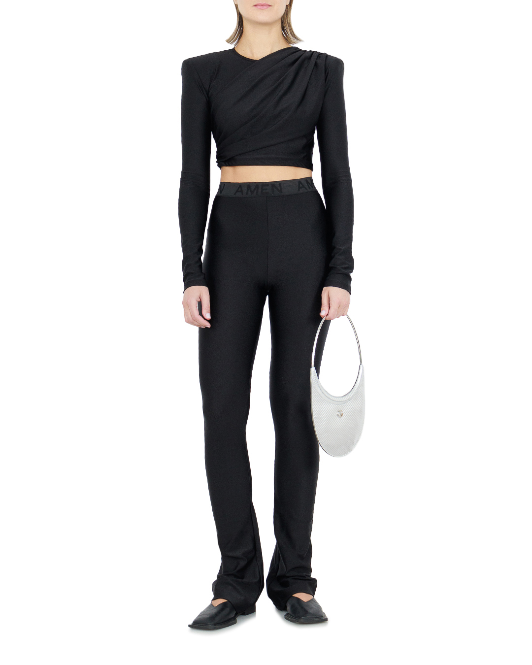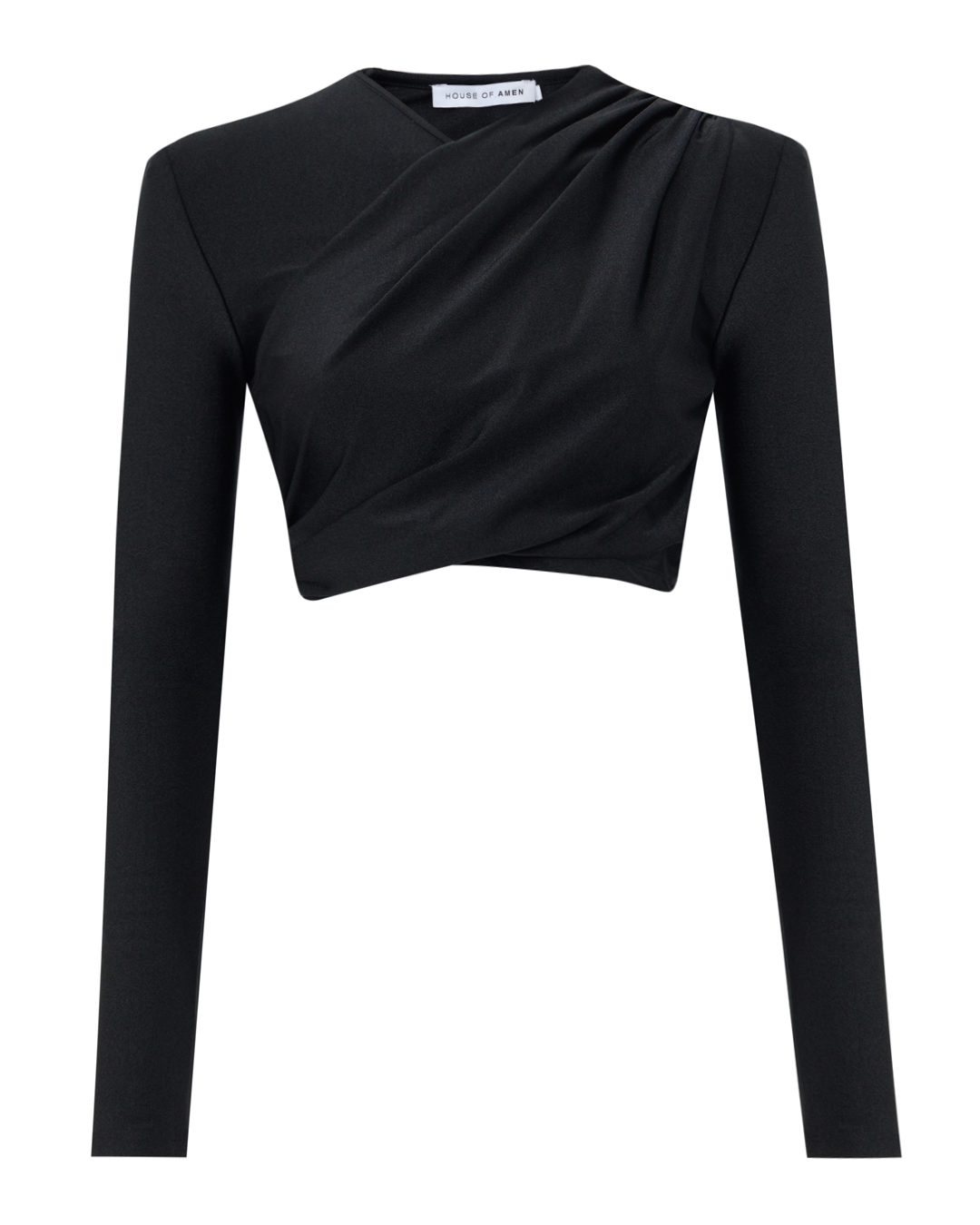 Укороченный топ с подплечниками из эластичной ткани. Модель дополнена драпировкой на груди. Подойдет для создания вечерних и повседневных образов.