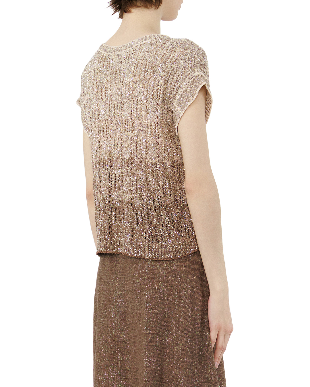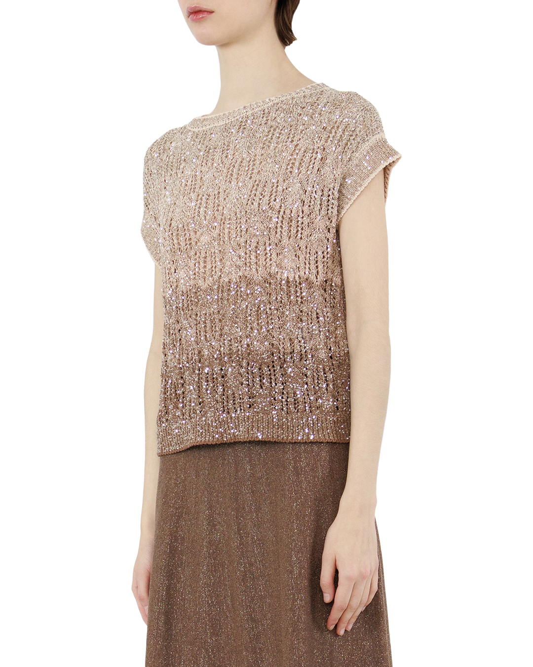Этот джемпер — истинное воплощение изысканности и лёгкости. Нежный бежевый оттенок, дополненный едва уловимым мерцанием, создаёт эффект благородной сдержанности, который так ценится в современной моде. Модель словно создана для того, чтобы подчеркнуть индивидуальность своей обладательницы, оставаясь при этом лаконичной и универсальной. Простая, но виртуозная вязка придаёт изделию особую фактурность — ткань выглядит одновременно воздушной и структурированной. Миниатюрные пайетки, вкраплённые в полотно, ловят свет, добавляя образу деликатного шика. Это не кричащий гламур, а скорее утончённая игра бликов, которая делает джемпер по-настоящему особенным. Прямой крой с обычной посадкой обеспечивает исключительный комфорт: джемпер мягко облегает фигуру, не сковывая движений. Короткие рукава добавляют модели непринуждённости, делая её идеальной для самых разных случаев — от утреннего кофе в кафе до непринуждённой встречи с друзьями. Состав ткани — настоящее сочетание практичности и эстетики: сочетание полиамида, льна, вискозы, полиэстера и лиоцелла дарит приятные тактильные ощущения и лёгкость. Материал не только красив, но и функционален — он дышит, не мнётся и долго сохраняет первоначальный вид. Этот джемпер станет жемчужиной гардероба: он легко комбинируется с разными элементами одежды, превращаясь то в часть повседневного образа, то в основу элегантного ансамбля. Достаточно добавить лаконичные брюки или юбку, минималистичные аксессуары — и безупречный лук готов.