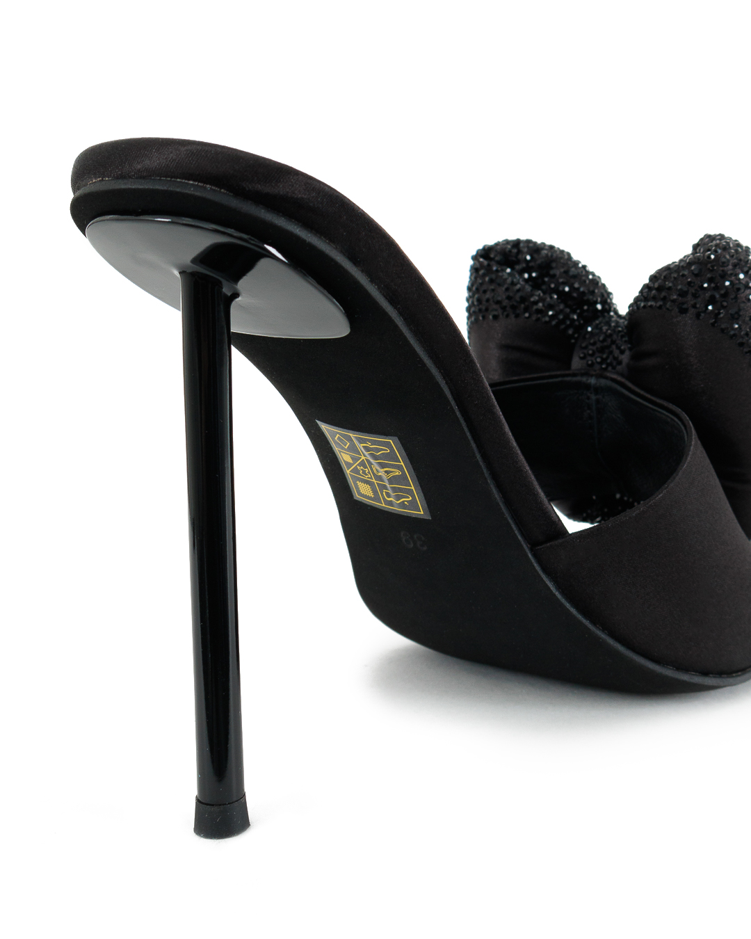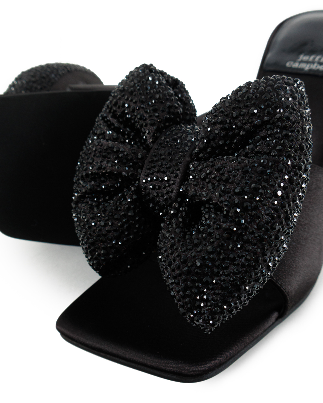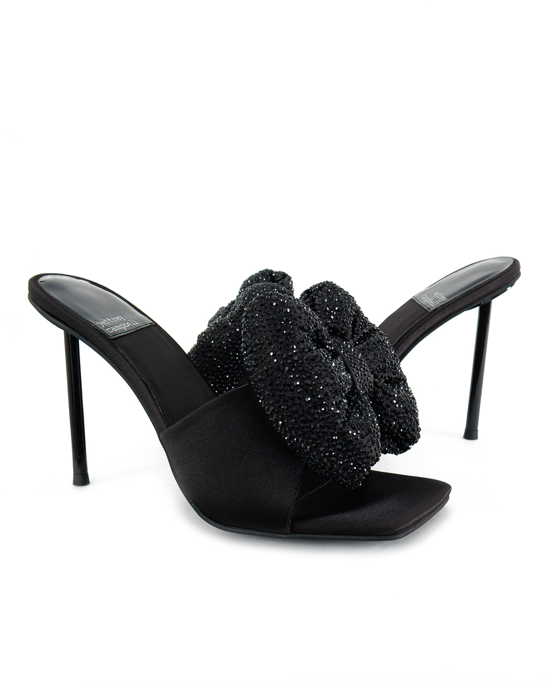 Босоножки Jeffrey Campbell – это воплощение современного гламура и изысканности. Стильный черный дизайн акцентирован шикарным бантом, усыпанным сверкающими стразами, который добавляет данной модели роскошный объем и притягательный блеск.  Тонкий высокий каблук подчеркивает элегантность и добавляет высоту, придавая походке выразительность и грацию. Квадратный мысок делает силуэт более современным и дерзким, обеспечивая обуви актуальность и оригинальность. Эти босоножки станут идеальным выбором для вечерних выходов, придавая вашему образу яркость и незабываемый шарм.
