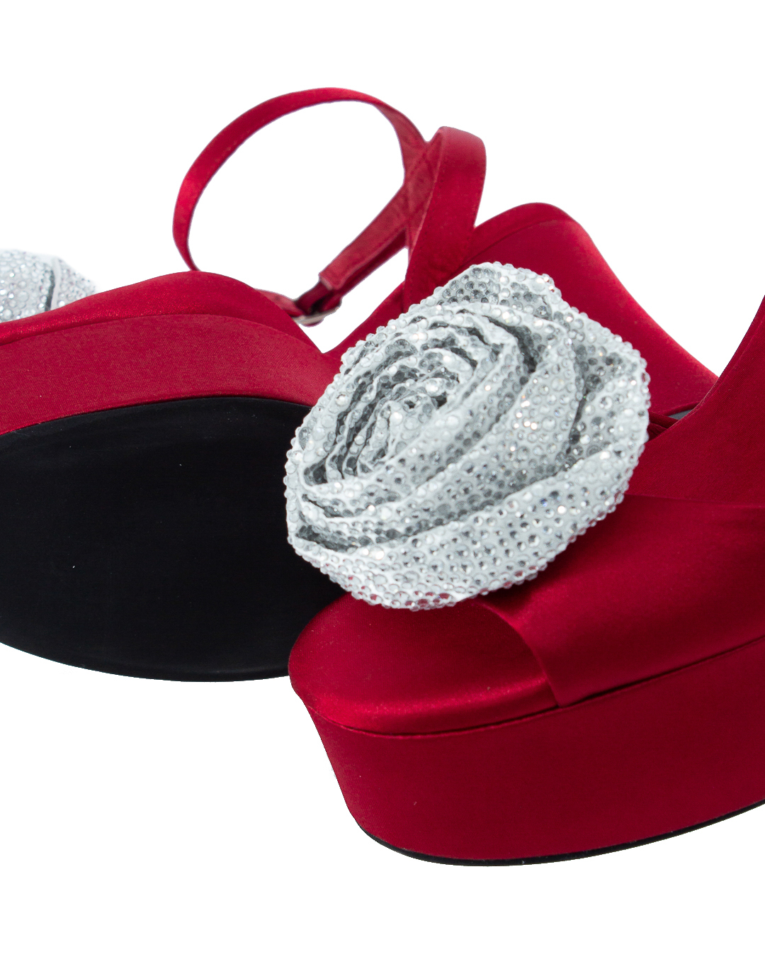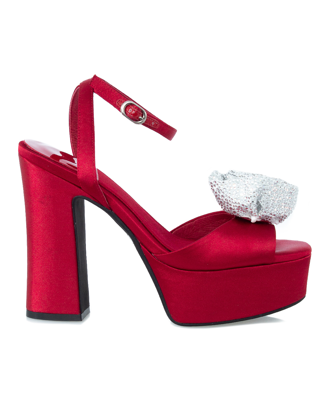 Босоножки JEFFREY CAMPBELL из сатина на массивном каблуке и компенсирующем его платформе. Пара с открытым мысом декорирована объемным текстильным цветком.