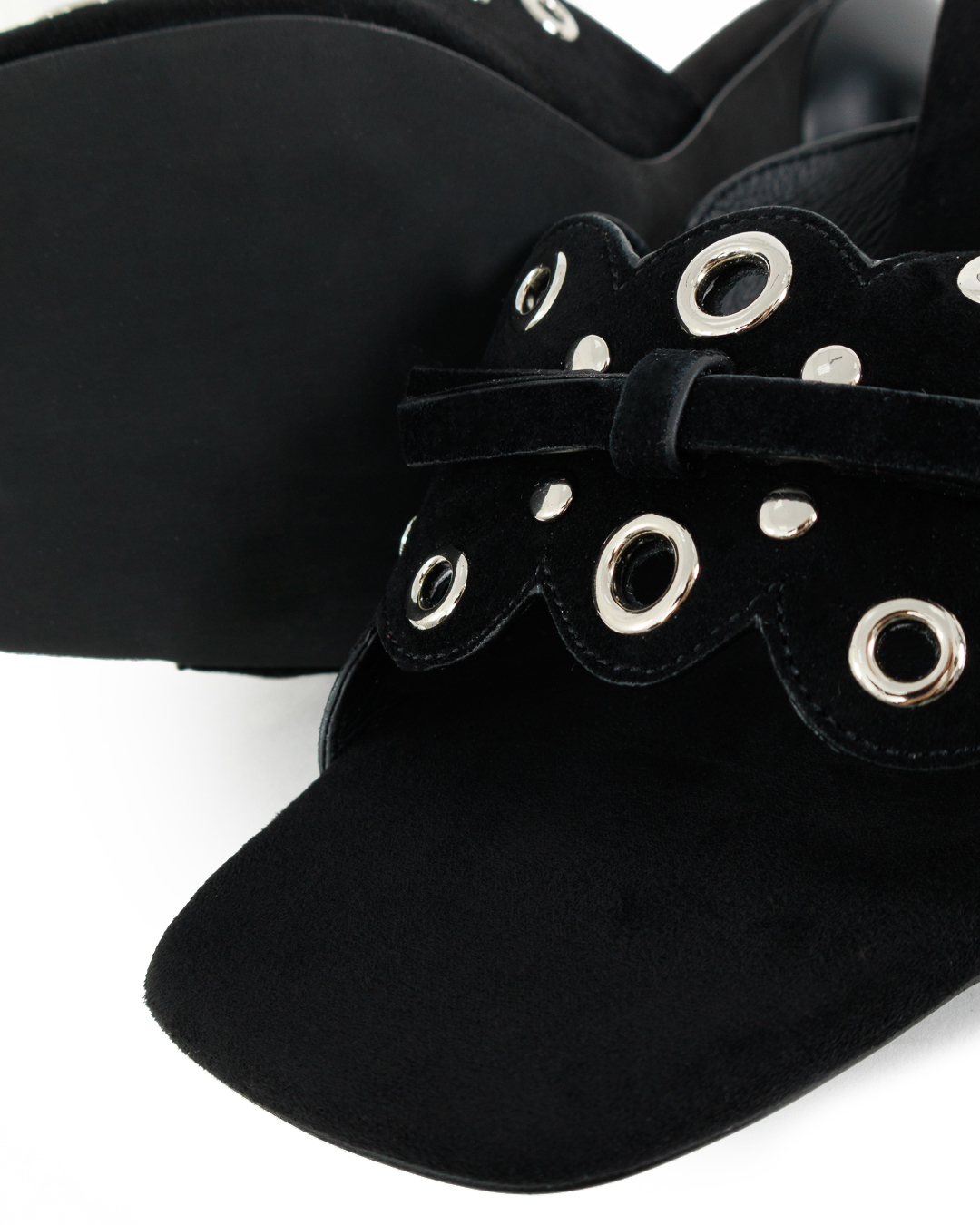 Эти босоножки от Jeffrey Campbell – истинное выражение смелого дизайнерского подхода и утонченной элегантности. Верх изготовлен из бархата глубокого черного цвета, придающего обуви богатый и роскошный вид. Ассиметричная линия верха с волнообразными очертаниями создает уникальную динамику и вносит художественный элемент в общий дизайн. Декоративные металлические люверсы различных размеров добавляют текстуру и современный акцент, придавая босоножкам немного дерзкий характер. Изящный каблук в форме бокала добавляет футуристичности и подчеркивает тонкую женственность силуэта. Эти босоножки станут идеальным дополнением для вечерних и креативных нарядов, акцентируя ваш индивидуальный стиль и уверенность.