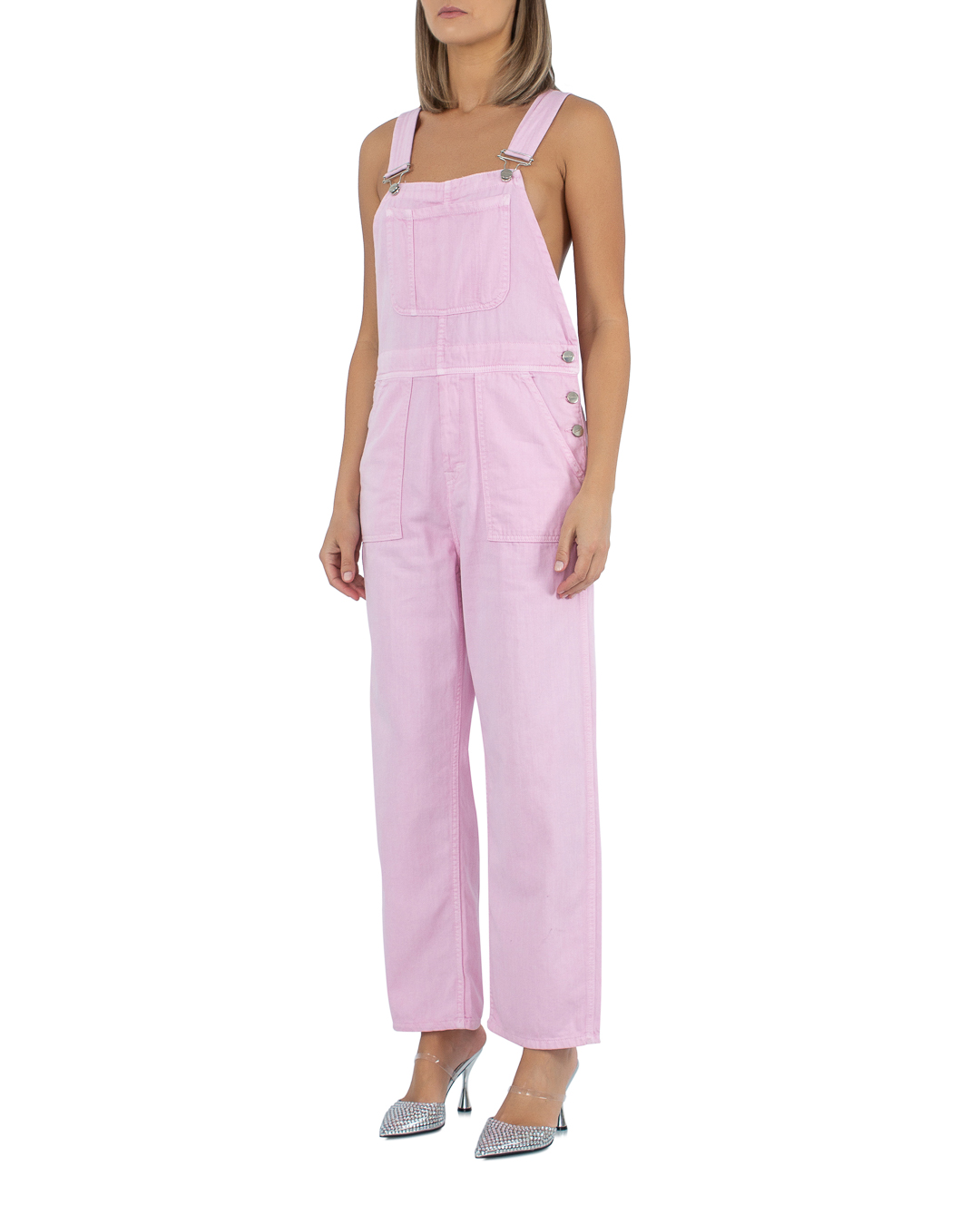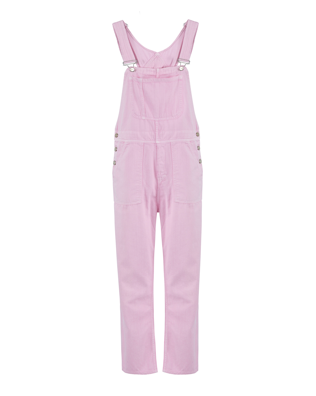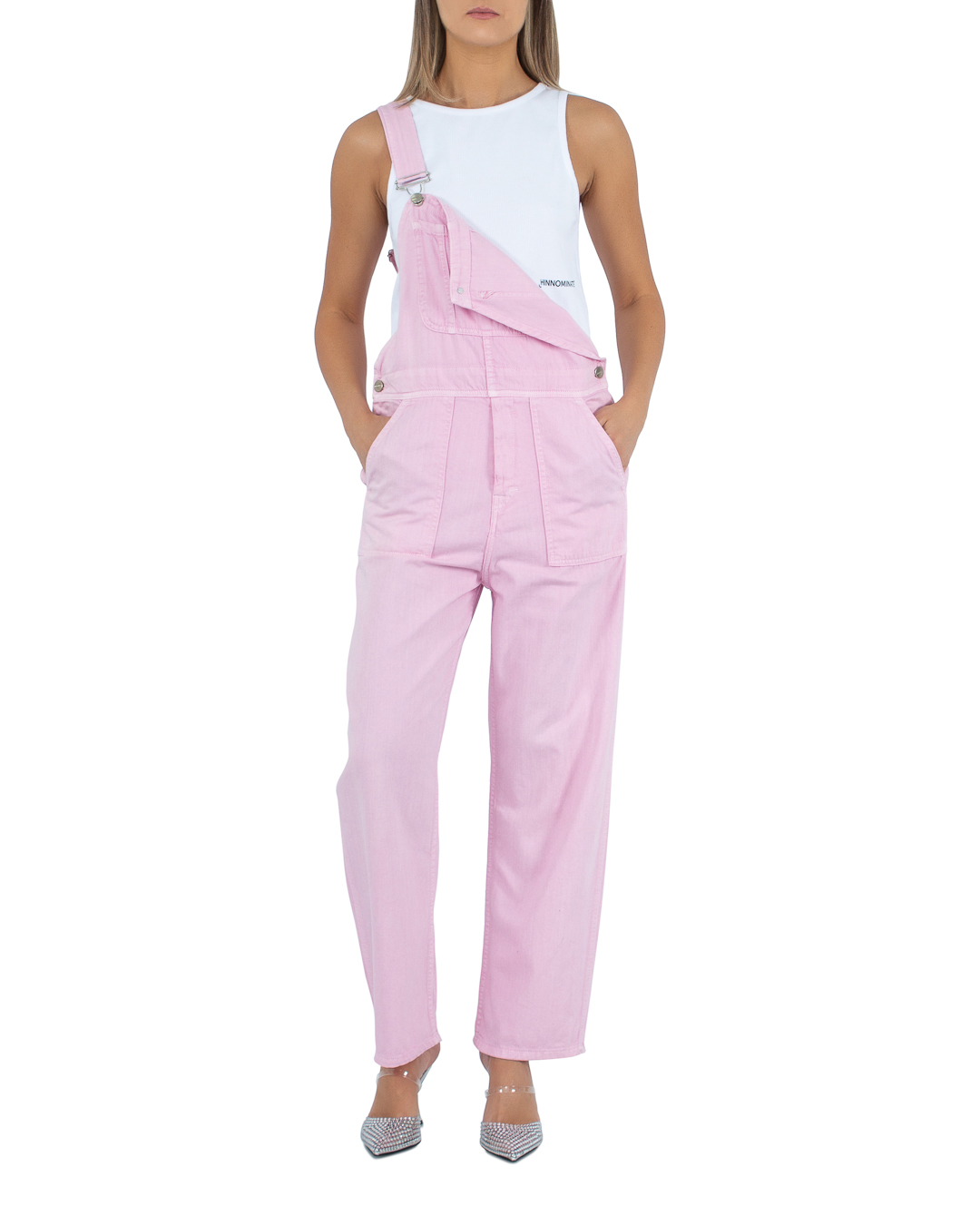 Комбинезон HINNOMINATE из плотного хлопкового денима в розовом оттенке. Модель прямого силуэта с застежкой на пуговицы по бокам дополнена удобными лямками регулируемой длины и несколькими карманами.