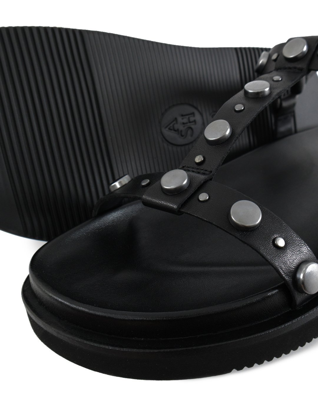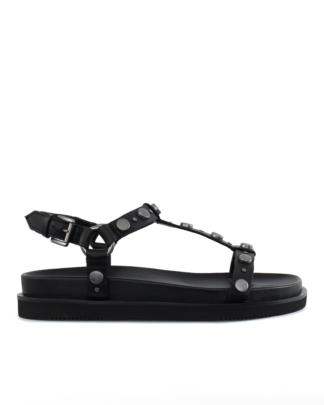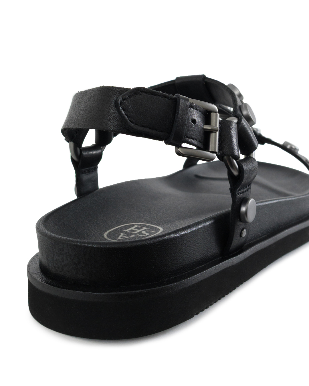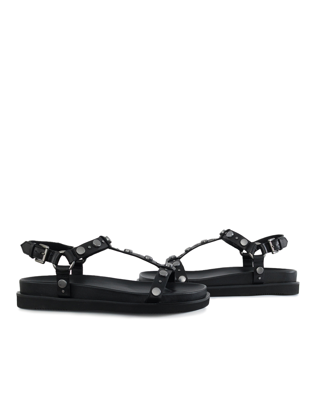Сандалии UGO с Т-образным ремешком выполнены из натуральной кожи черного цвета, украшенной плоскими металлическими заклепками. Ремешок на щиколотке регулируется с помощью пряжки. Фирменная плоская подошва, переходящая в формованную кожаную стельку обеспечит максимальный уровень комфорта.