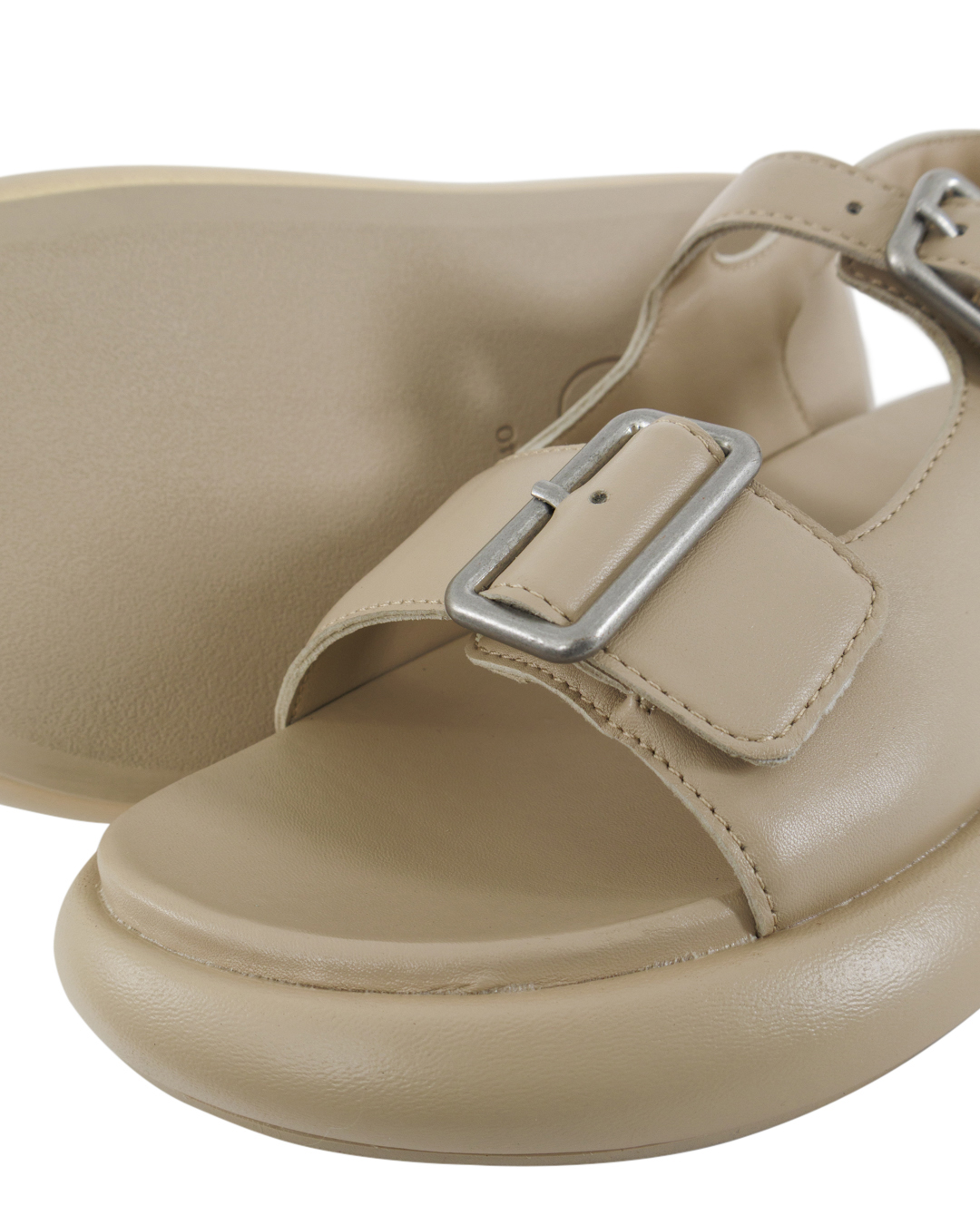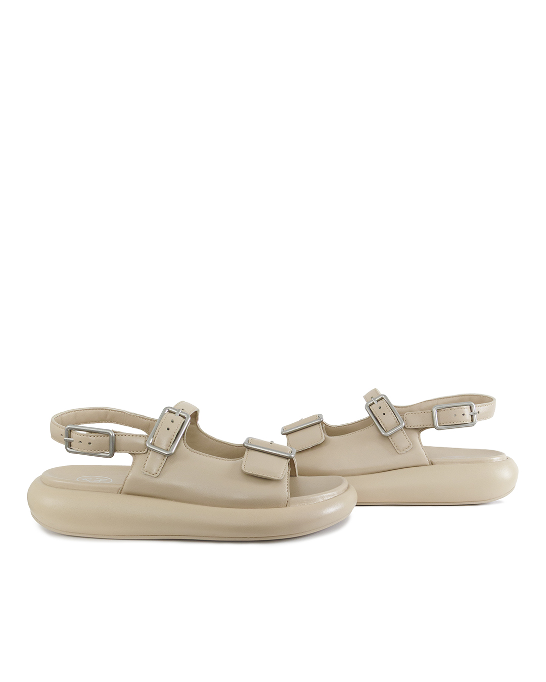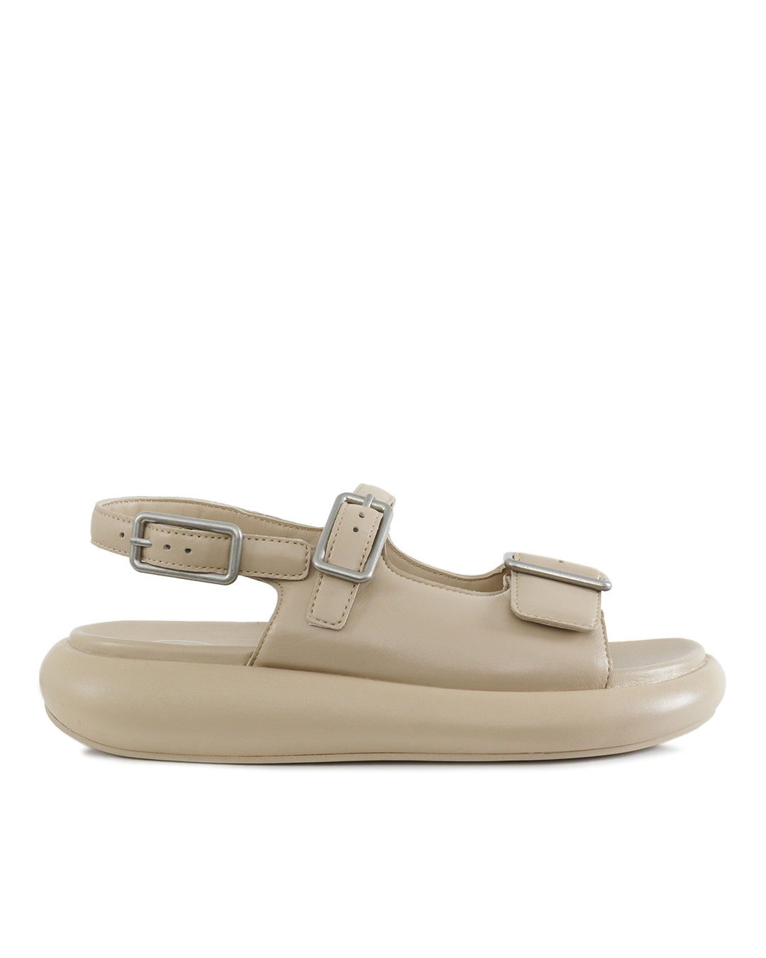 Сандалии VIRGY выполнены из натуральной кожи бежевого цвета с мягким наполнителем для придания объема. Устойчивая объемная подошва с кожаной стелькой обеспечивает комфорт и создает визуальный дутый эффект, освежая дизайн. Верх пары дополнен тремя ремешками с пряжками для регулирования индивидуальной посадки.