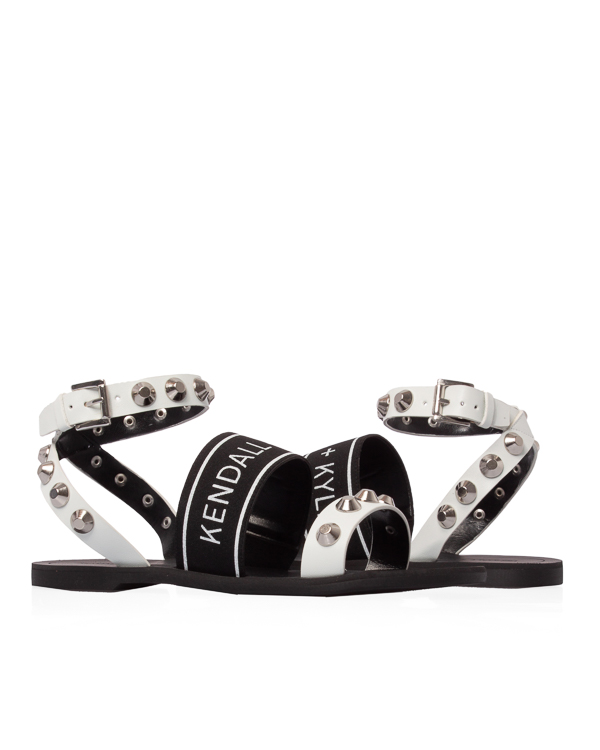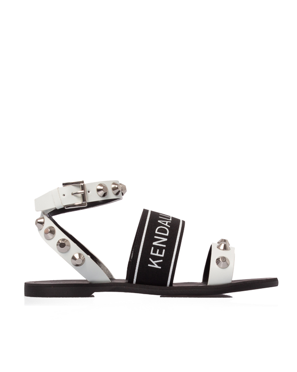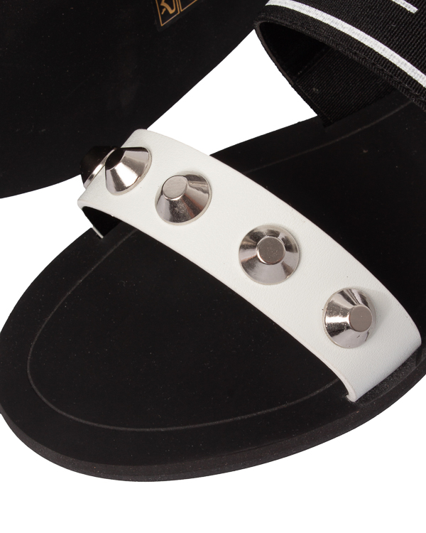 Сандалии на плоской подошве, с кожаными ремешками и отделкой металлическими шипами. Пара дополнена перемычкой с брендированным логотипом.