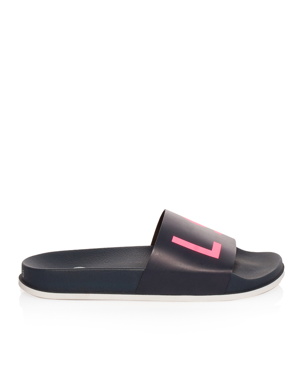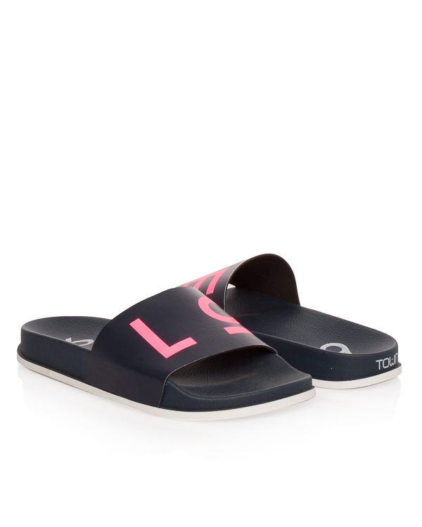 Сланцы выполнены из мягкого полимерного материала темно-синего цвета с текстовым принтом. Модель удобно прилегает к ноге, внутренняя часть плотной и легкой подошвы повторяет анатомическую форму стопы.