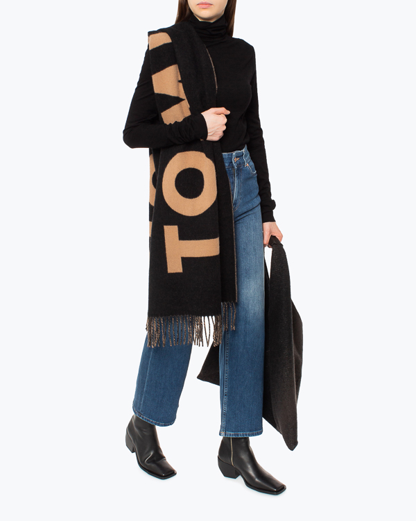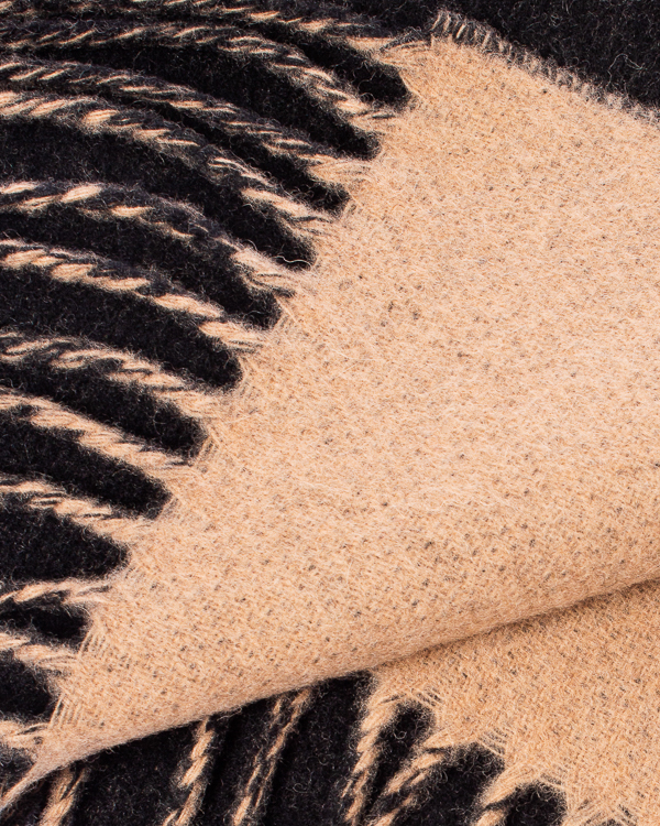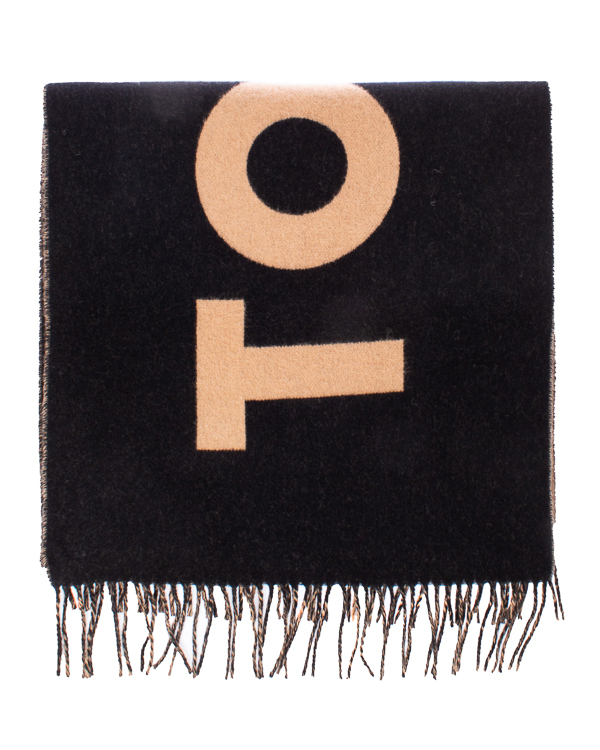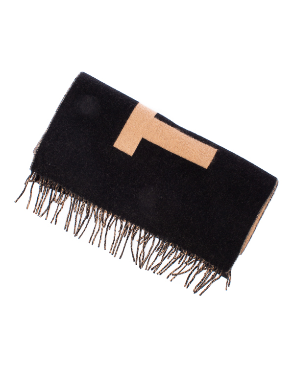 Длинный широкий шарф из мягкой ворсистой шерсти черного и бежевого оттенков. Уютное изделие с логотипом бренда и бахромой по краям.