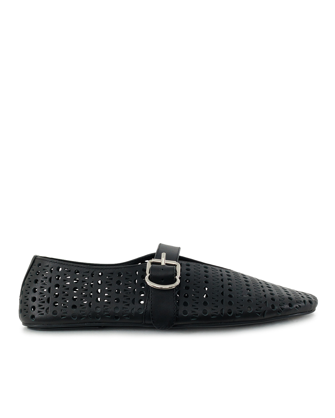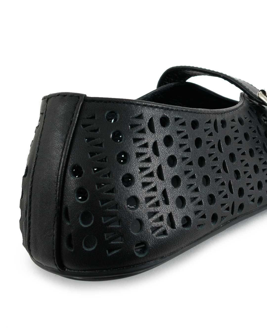 Эти балетки от JEFFREY CAMPBELL воплощают изящный баланс между современным дизайном и практичностью. Выполненные из высококачественной кожи с изысканной перфорацией, они привносят в ваш образ нотку утончённой оригинальности и лёгкости.  Детали отделки, такие как аккуратный ремешок с изящной металлической пряжкой, добавляют модели стильный акцент и обеспечивают комфортную фиксацию на ноге. Перфорация не только украшает, но и обеспечивает отличную вентиляцию, что делает эти балетки идеальными для тёплого времени года.  Острый носок и минималистичный силуэт подчеркивают изящество стопы, позволяя легко сочетать обувь как с повседневными, так и с более элегантными комплектами. Универсальный чёрный цвет делает эти балетки незаменимым элементом гардероба для тех, кто ценит комфорт и стиль.