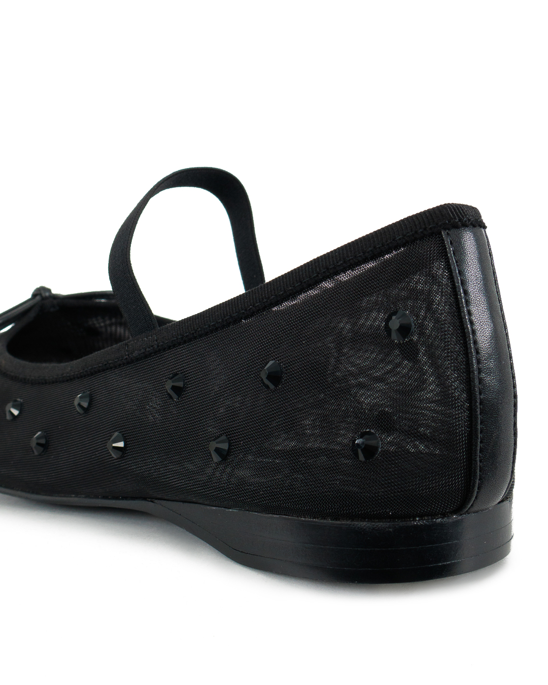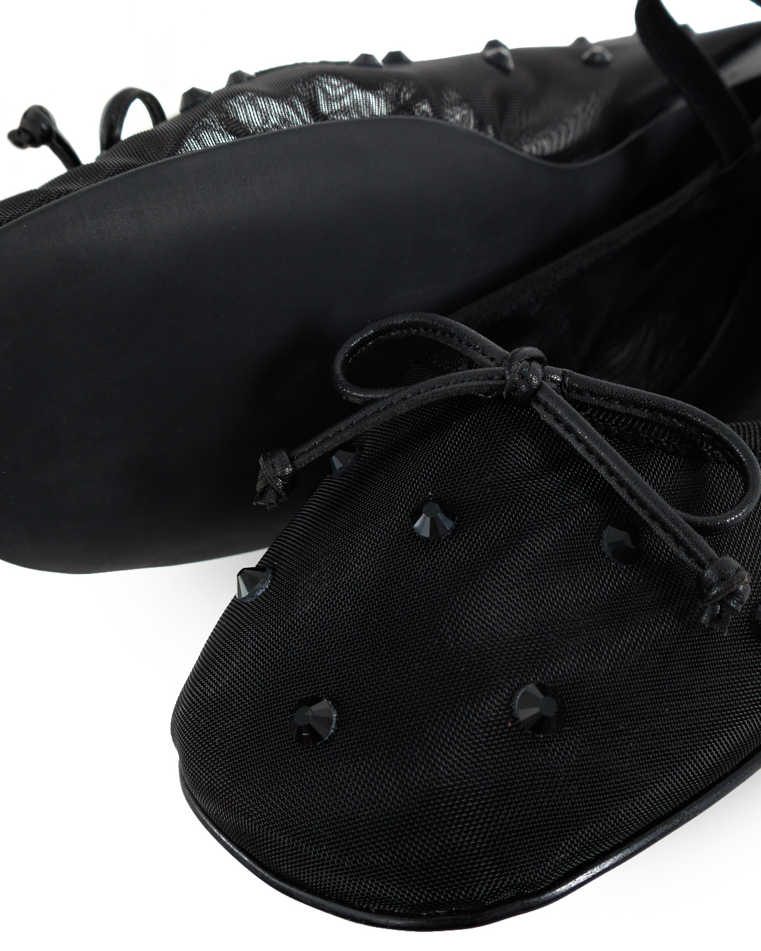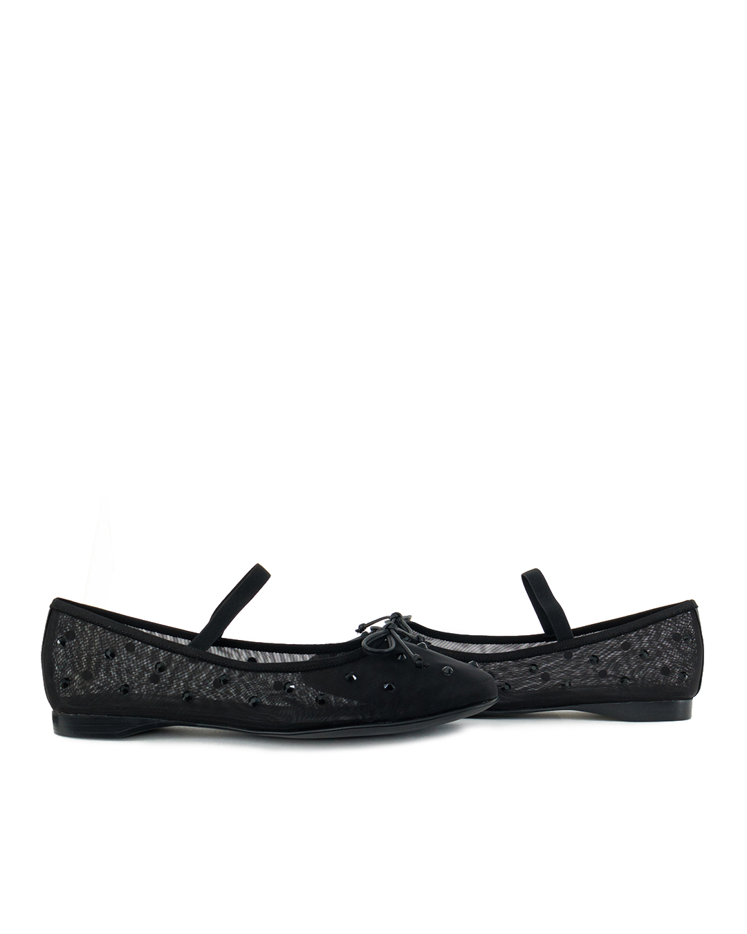 Эти балетки от JEFFREY CAMPBELL — воплощение утончённой чувственности и изысканности. Их прозрачная сетчатая фактура создаёт иллюзию лёгкости и воздушности, внося нотку современности в классическую модель. Глубокий чёрный цвет добавляет универсальности и элегантности.  Декоративные элементы в виде блестящих страз создают изысканный акцент, придавая обуви блеск и стильность. Минималистичный ремешок через подъём подчёркивает изящество линии стопы и обеспечивает дополнительную фиксацию. Маленький бантик на носке добавляет традиционную нотку изящества. Эти балетки идеально подойдут как для лёгкого дневного образа, так и для вечернего выхода, добавляя шарм и индивидуальность каждому шагу.