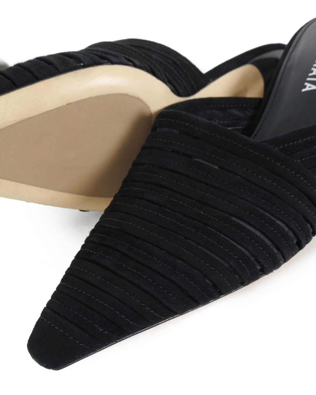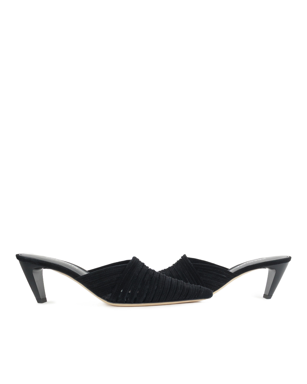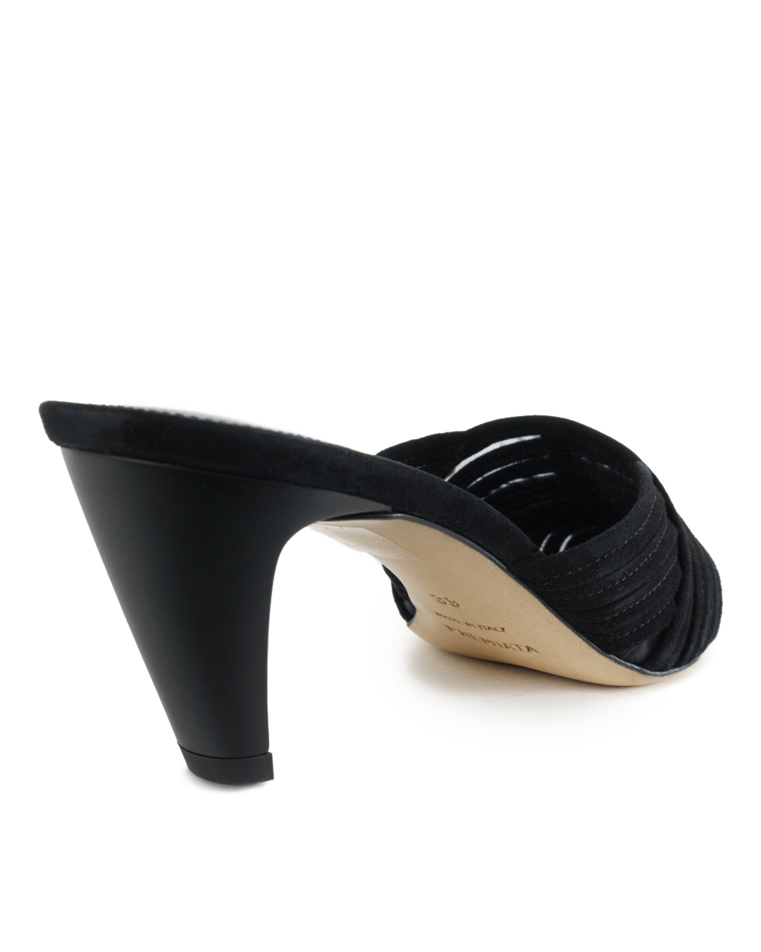 Черные лаконичные босоножки с невысоким скошенным каблуком выполнены из мягких лент из натуральной кожи.