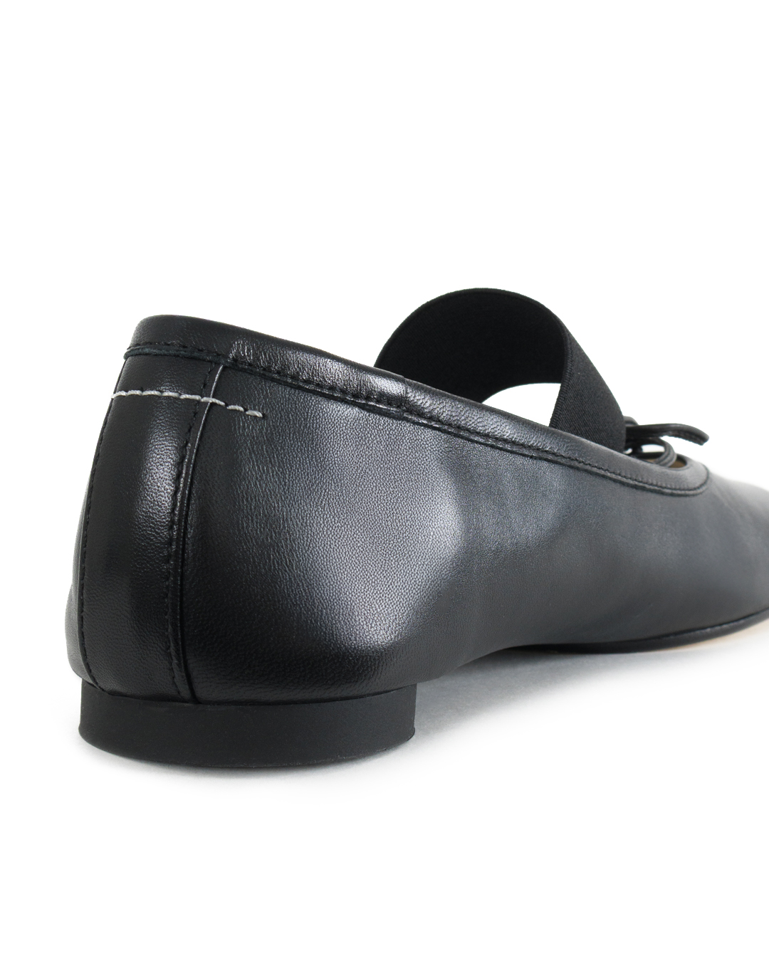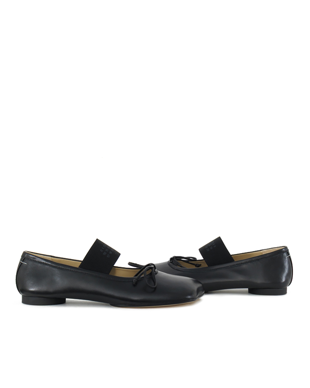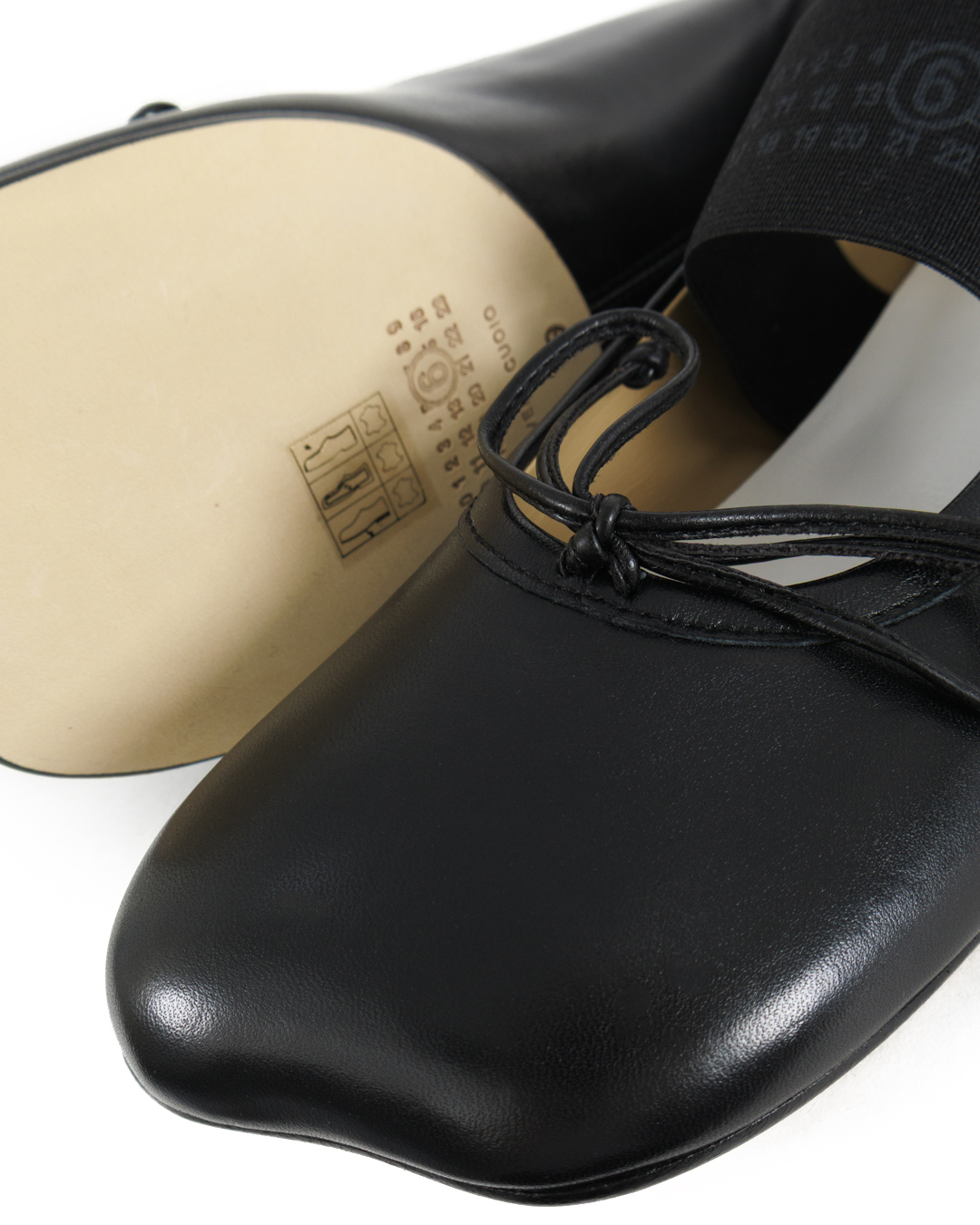 Вечная классика – балетки Anatomic от MM6 из черной кожи наппа, изготовленные вручную. Модель отличает цилиндрический каблук и резинка с цифровой подписью на щиколотке. Пара украшена бантиком спереди и фирменной горизонтальной белой строчкой, вышитой сзади.