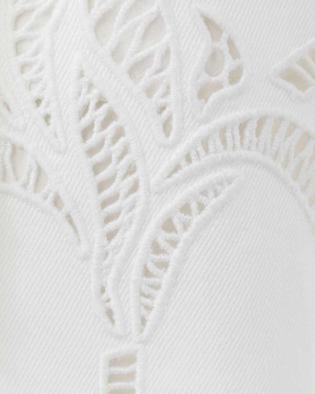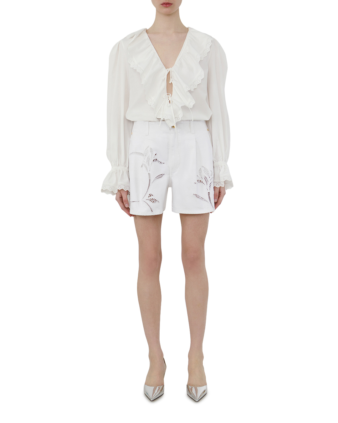 Эти белые шорты — образец утончённой лаконичности. Высокий пояс с лаконичной застёжкой на пуговицу подчёркивает линию талии, создавая изящный силуэт. Объёмные складки по бокам придают модели динамику и лёгкость, а крой с расширением к низу визуально уравновешивает пропорции. Особую изысканность изделию придаёт ажурная вышивка с растительным мотивом — нежные контуры листьев и стеблей словно парят на поверхности ткани, добавляя вещи романтичный характер. Чистое исполнение швов и аккуратность отделки подчёркивают качество работы. Такой предмет гардероба легко станет центральным элементом стильного летнего образа, сочетая в себе элегантность и комфорт.