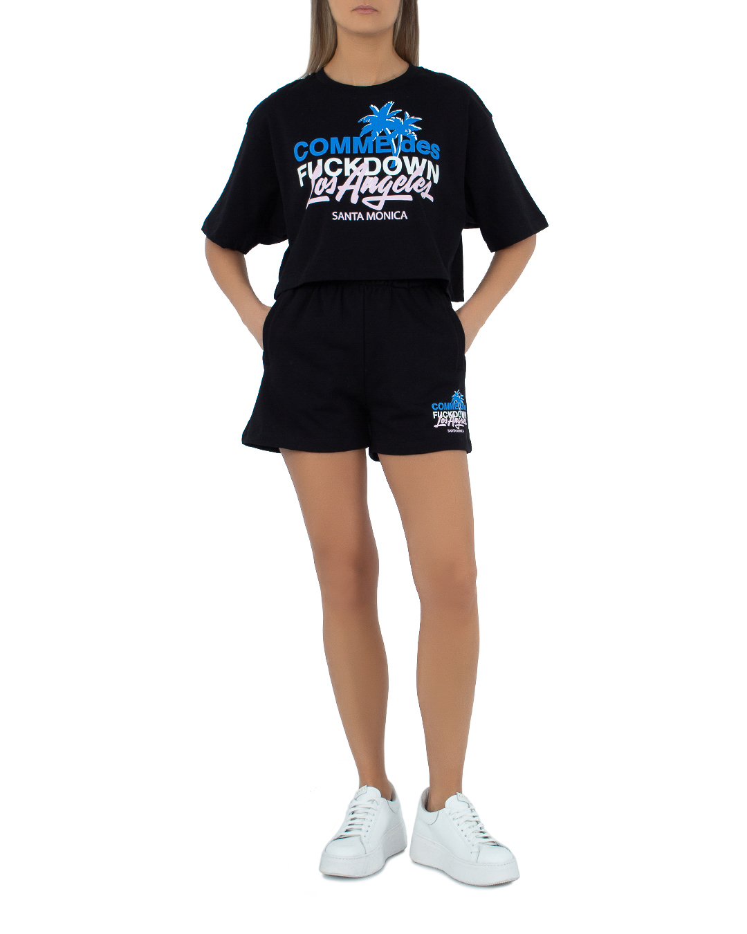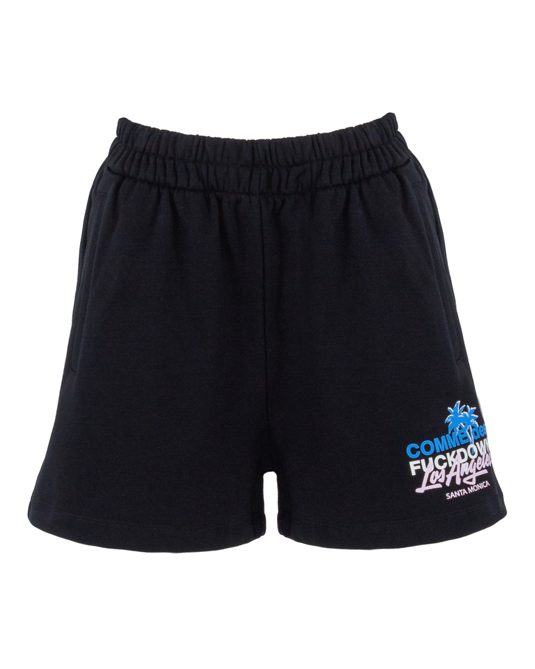 Шорты COMME des FUCKDOWN из трикотажного хлопка с принтом логотипа бренда. Прямой свободный силуэт длины мини с высокой эластичной линией пояса.