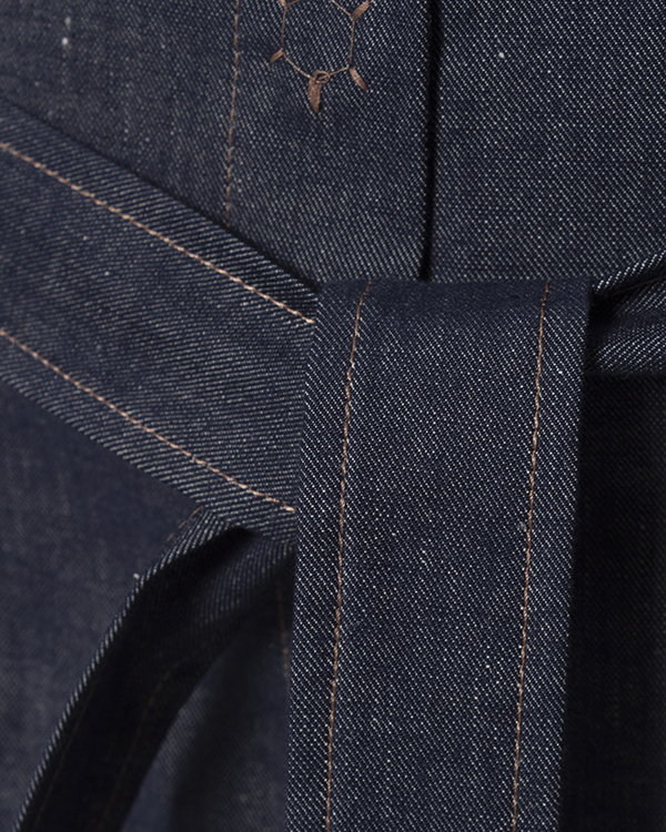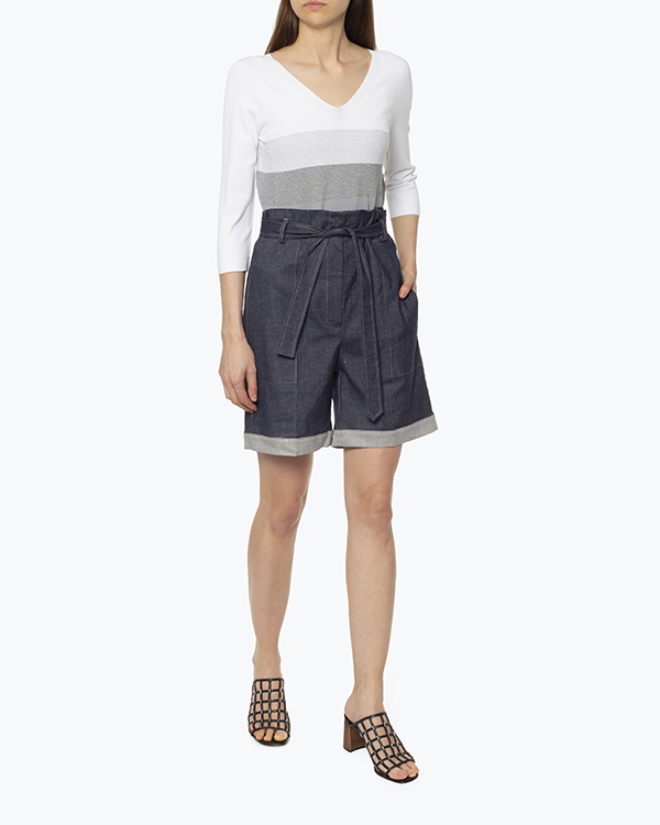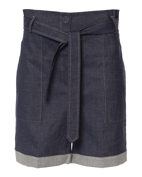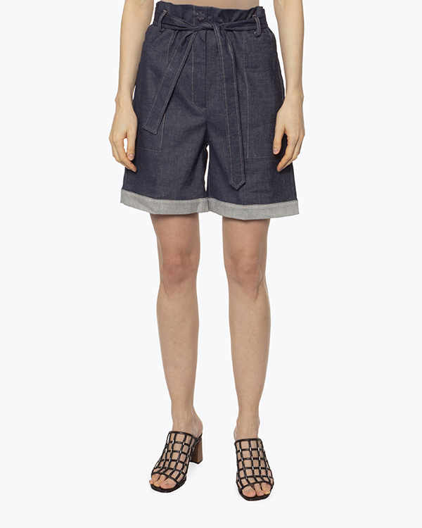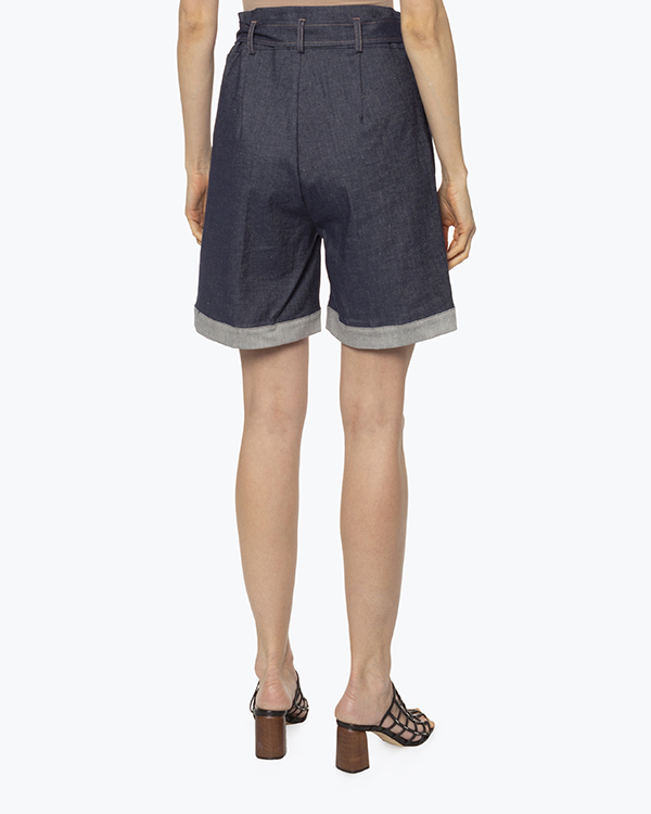 Шорты из плотного хлопка темно-синего оттенка. Изделие свободного силуэта с высокой посадкой на талии и застежкой на молнию и пуговицу. Шорты дополнены поясом из основного материала.