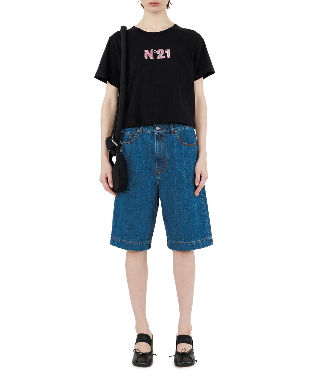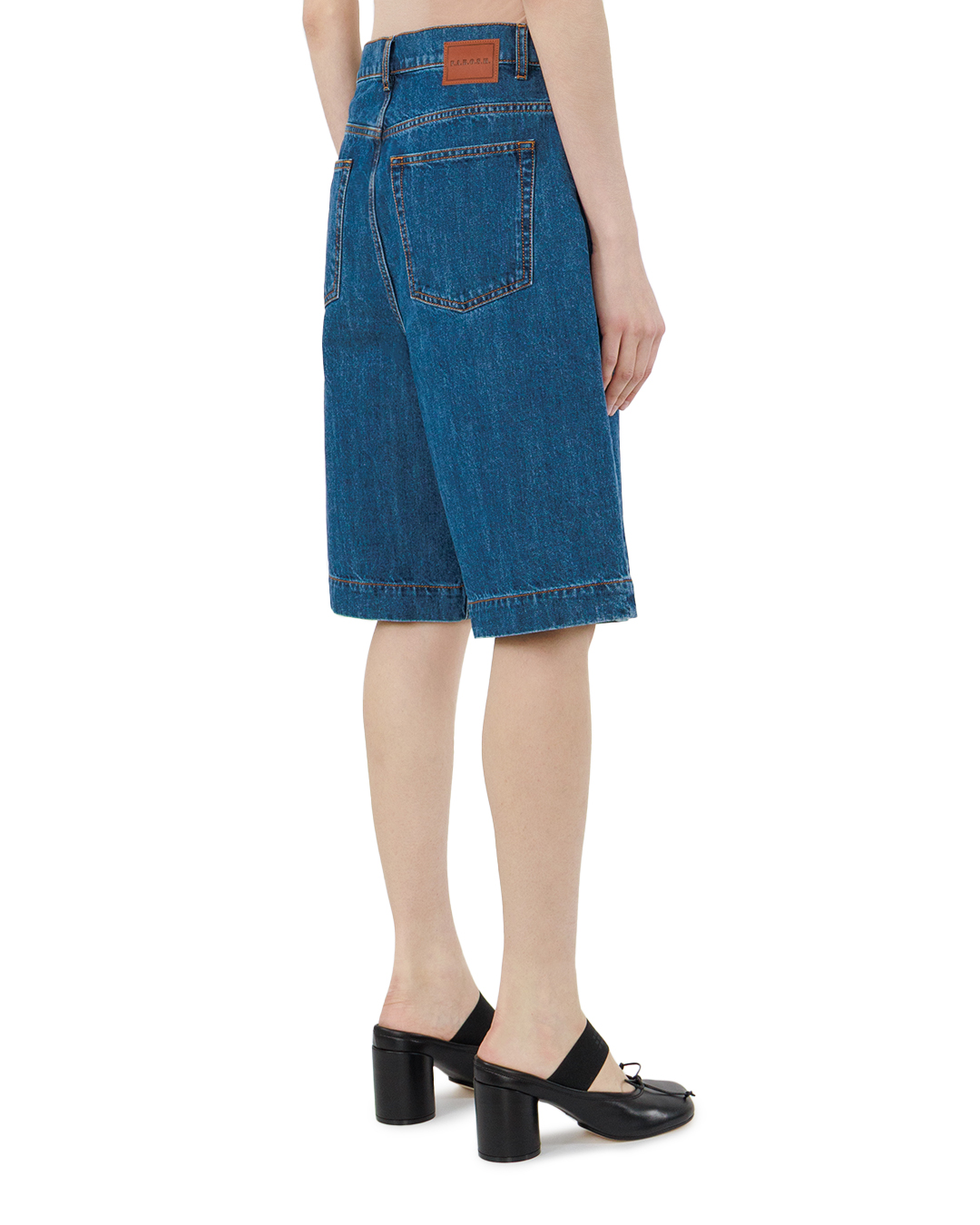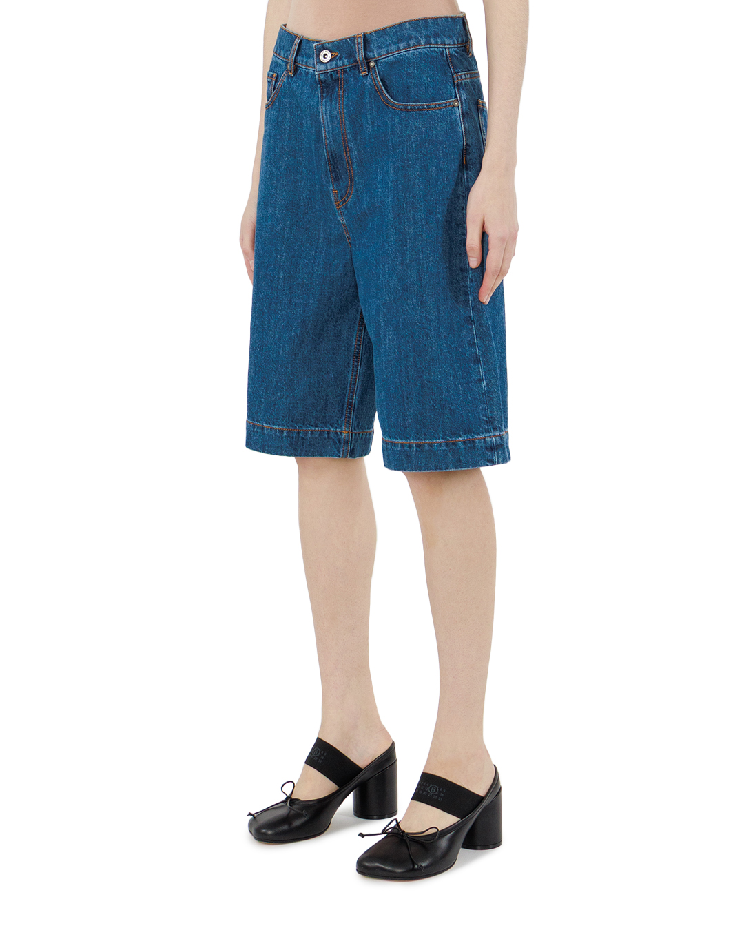 Эти джинсовые шорты — воплощение непринуждённой классики, сочетающей в себе комфорт и выразительный характер. Насыщенный синий оттенок денима придаёт вещи глубину и универсальность, позволяя легко вписать её в самые разные образы — от расслабленного кэжуал до более собранного ансамбля. Свободный крой с лёгким расширением к низу создаёт ощущение лёгкости, не сковывая движений, при этом аккуратно подчёркивает линии фигуры. Высокая посадка визуально удлиняет ноги, добавляет силуэту собранности и элегантности, а чёткая линия талии служит выразительным графическим акцентом. Детали отделки выполнены с особым вниманием к традициям кроя: накладные карманы с аккуратной прострочкой не только функциональны, но и поддерживают геометрию модели, подчёркивая её лаконичность. Контрастная оранжевая нить в строчке добавляет динамичности и служит стильным элементом, оживляющим классический дизайн. Центральная застёжка на металлическую пуговицу выглядит лаконично и надёжно, а шлёвки для ремня придают шортам дополнительную функциональность и структурированность. Край низа обработан безупречно — ровный, аккуратно подогнутый, он завершает композицию, придавая ей законченность. Все швы выполнены с особой тщательностью, что создаёт ощущение цельной, продуманной конструкции. Эта модель — пример того, как проверенные временем решения могут обрести новое звучание. Чистота линий, продуманная посадка и выразительная отделка делают шорты не просто практичной вещью, а стильным элементом гардероба, способным стать основой для множества образов.