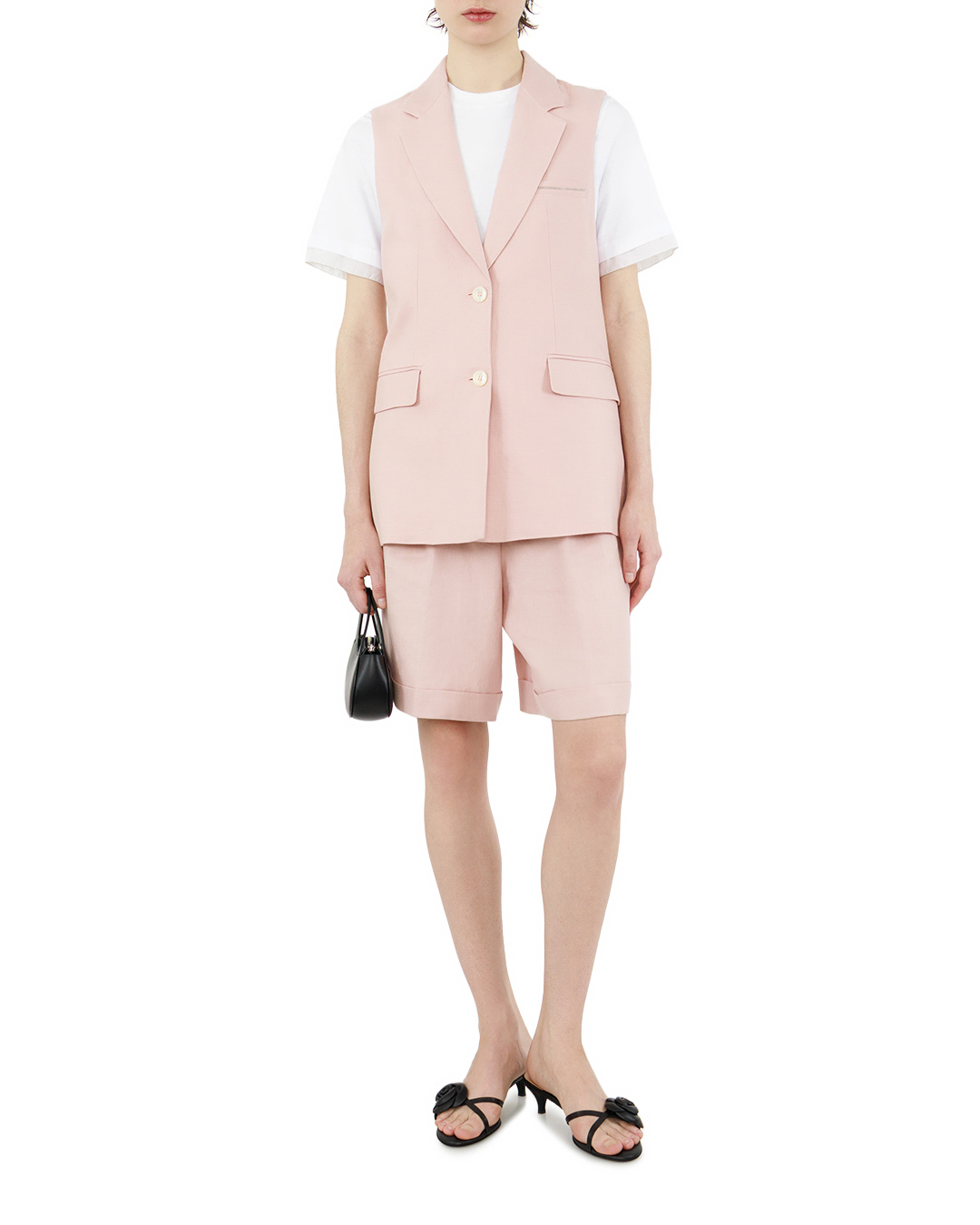 Эти нежно-розовые шорты — воплощение утончённой лёгкости и элегантности в повседневном стиле. Высокий пояс лаконично подчёркивает линию талии, создавая изящный силуэт и визуально вытягивая фигуру. Прямой крой с мягкими складками спереди придаёт модели благородную сдержанность, а также обеспечивает свободу движений — идеальный баланс между строгостью и комфортом. Особого внимания заслуживает отделка низа: аккуратный подворот формирует чёткую линию, добавляя шортам лаконичный акцент и завершённость. Центральная стрелка по переду визуально структурирует изделие, подчёркивая геометрию кроя и добавляя нотку формальности. Чистота линий и отсутствие лишнего декора делают эти шорты универсальной базой для самых разных образов — от расслабленного летнего лука до более собранного ансамбля с жакетом. Нежный оттенок и выверенные пропорции превращают простую вещь в стильный элемент гардероба, способный стать центральным акцентом образа. Эти шорты не просто дополняют наряд — они задают настроение, сочетая в себе лёгкость, женственность и безупречный вкус.