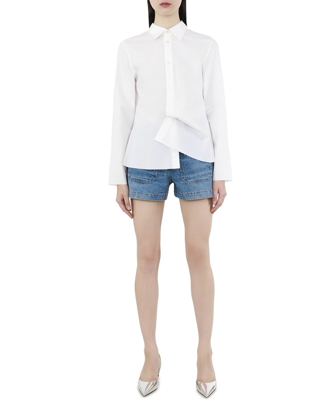 Эти шорты из светлого денима прекрасно иллюстрируют современный подход к классическому стилю. Изготовленные из высококачественного хлопкового материала, они сочетают в себе комфорт и актуальные модные тенденции. Укороченный и свободный крой обеспечивает отличную свободу движений и подчеркивает силуэт, а высокая талия визуально удлиняет ноги, добавляя образу изящности. Мягкий и дышащий деним с лёгкой потертостью придаёт шортам характер и легкость, делая их идеальным выбором для летнего гардероба. Заклепка из натурального металла и скрытая молния создают надежное закрытие, придавая шортам современный вид. Объемные накладные карманы с характерной отстрочкой не только функциональны, но и служат стильным акцентом, добавляя динамики и текстурного контраста к общему дизайну. Аккуратная контрастная строчка по всем краям придаёт изделию изысканность и подчеркивает внимание к деталям, а двойные швы усиливают прочность материала. Обработанные края с эффектом "среза" добавляют шортам нотку небрежного шика, сочетая стиль casual с элементами streetwear. Эти шорты легко комбинируются как с простыми топами, так и с романтичными блузами, позволяя создавать безупречные образы для прогулок и встреч с друзьями. Их универсальность и актуальный дизайн делают их незаменимым элементом любого гардероба.