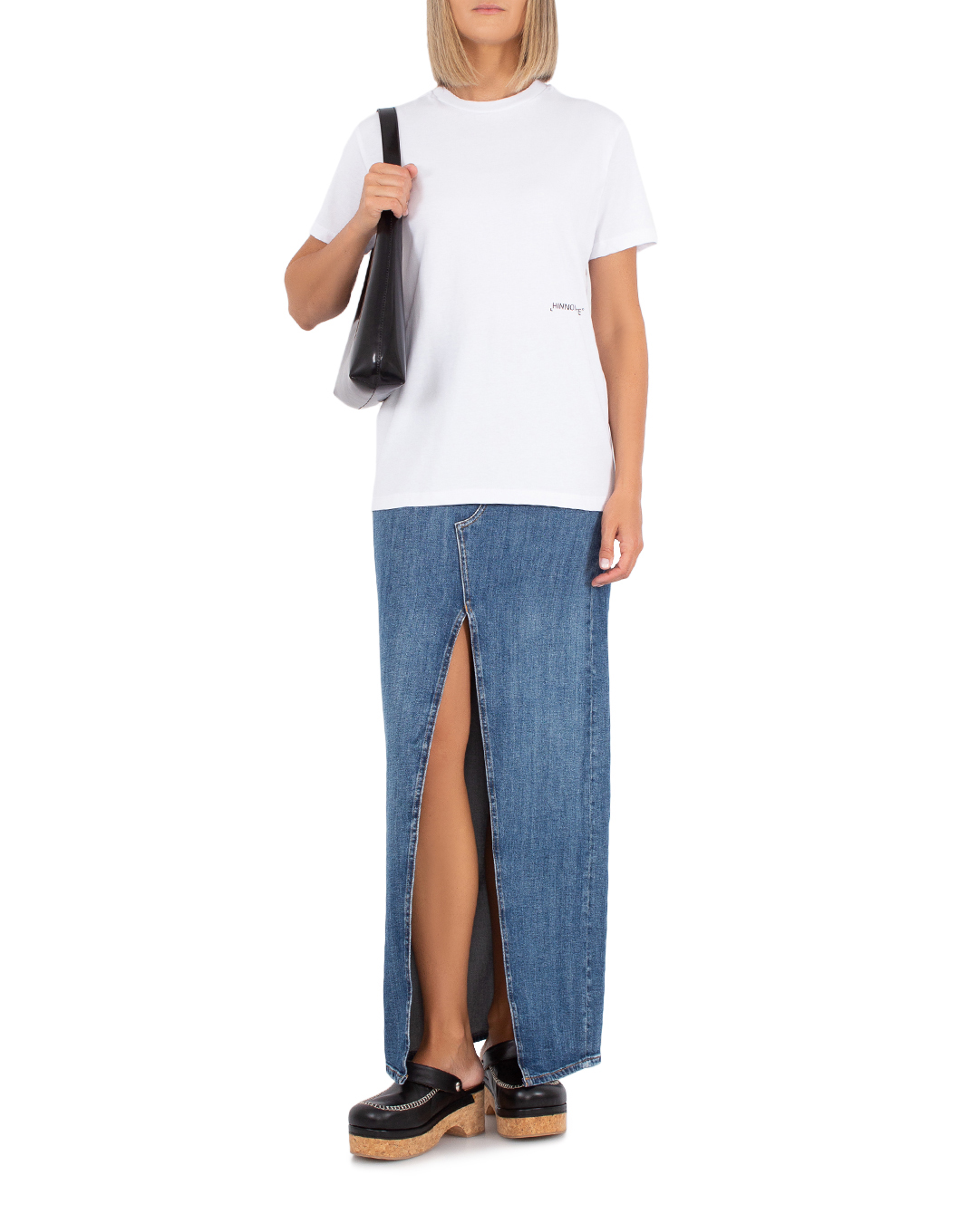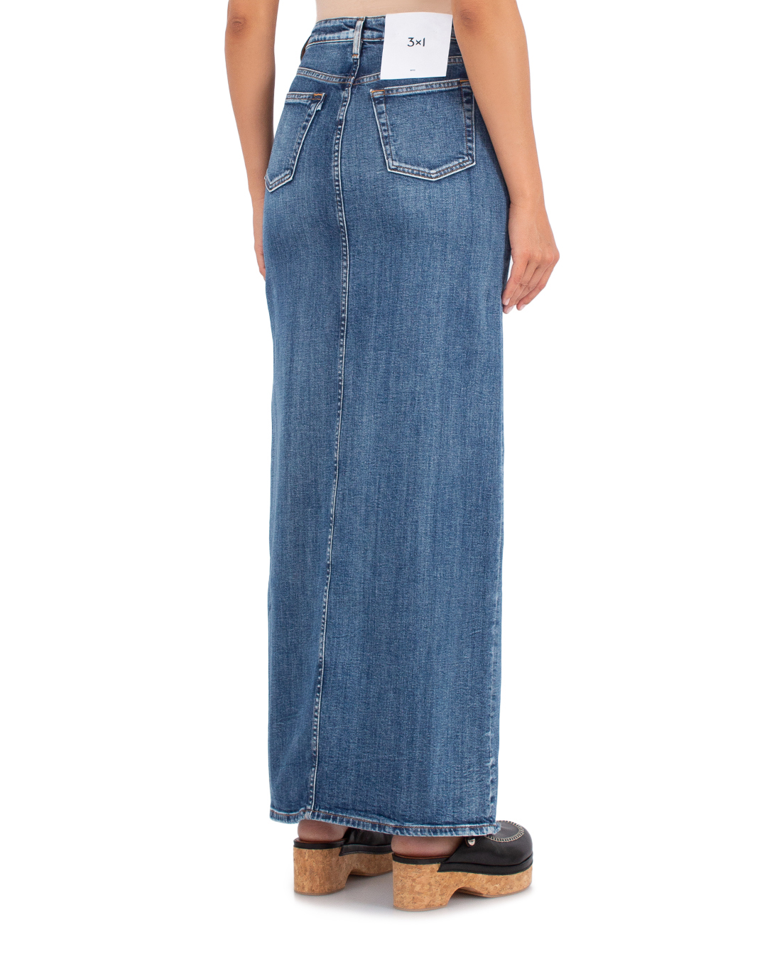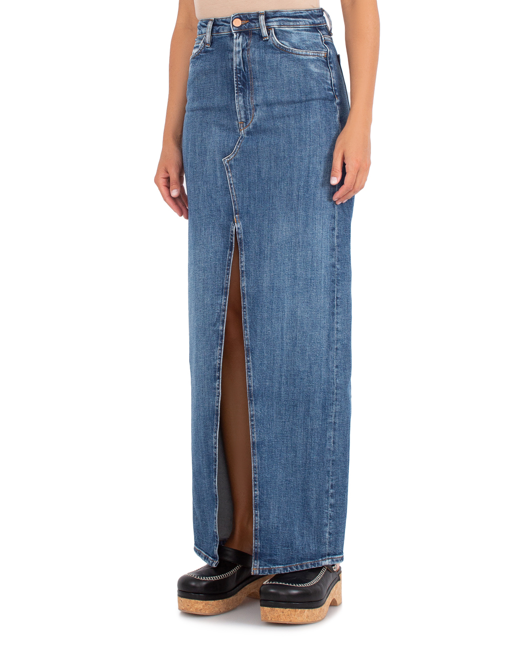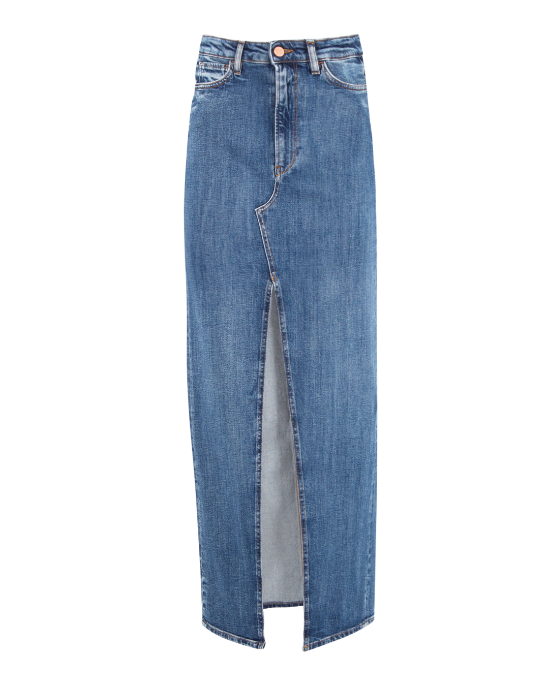 Джинсовая юбка 3 x 1 из плотного хлопкового денима. Модель прямого силуэта длины макси с разрезом. Высокая комфортная посадка на талии и застежка на молнию и пуговицу.