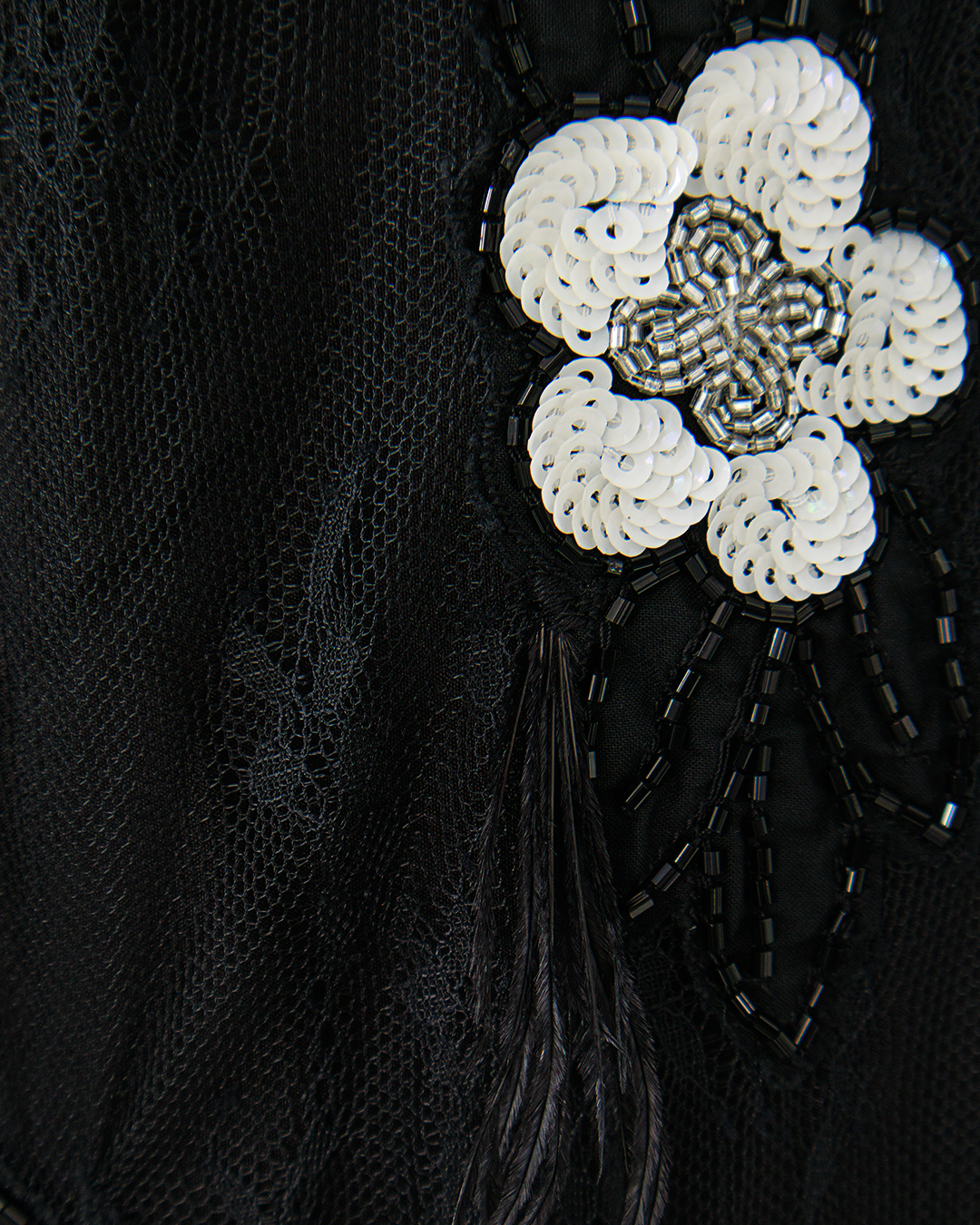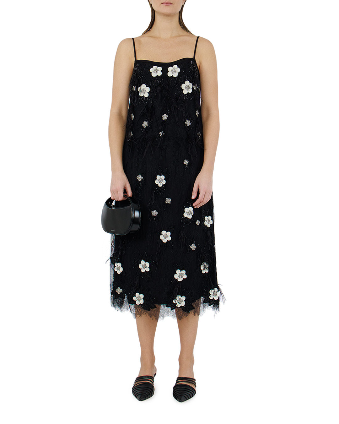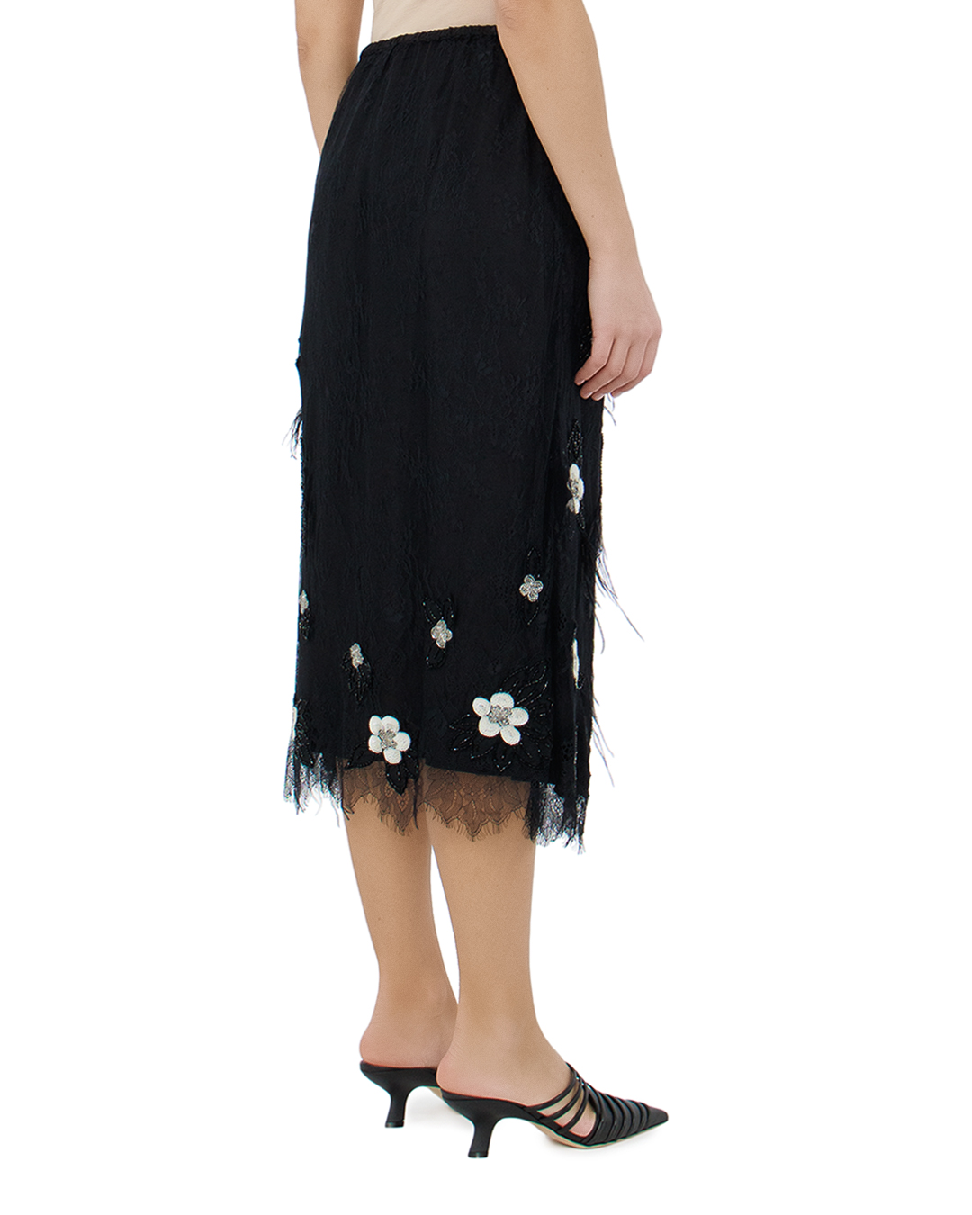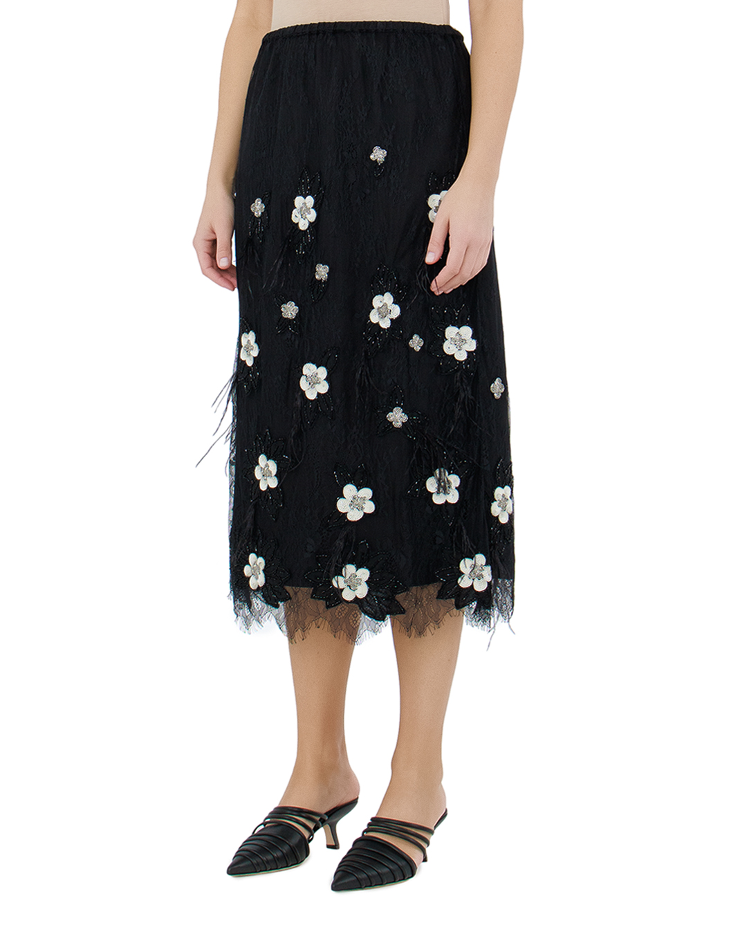 Юбка длины миди от Sea New York выполнена в черно-белой цветовой гамме и украшена изысканными цветочными аппликациями из пайеток и стекляруса. Легкую воздушную модель дополняют декоративные элементы из перьев и кружева. Идеально подходит для создания женственных нарядных образов.